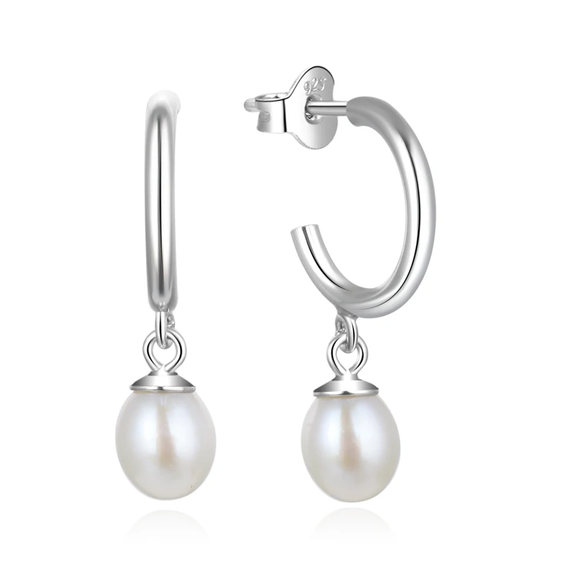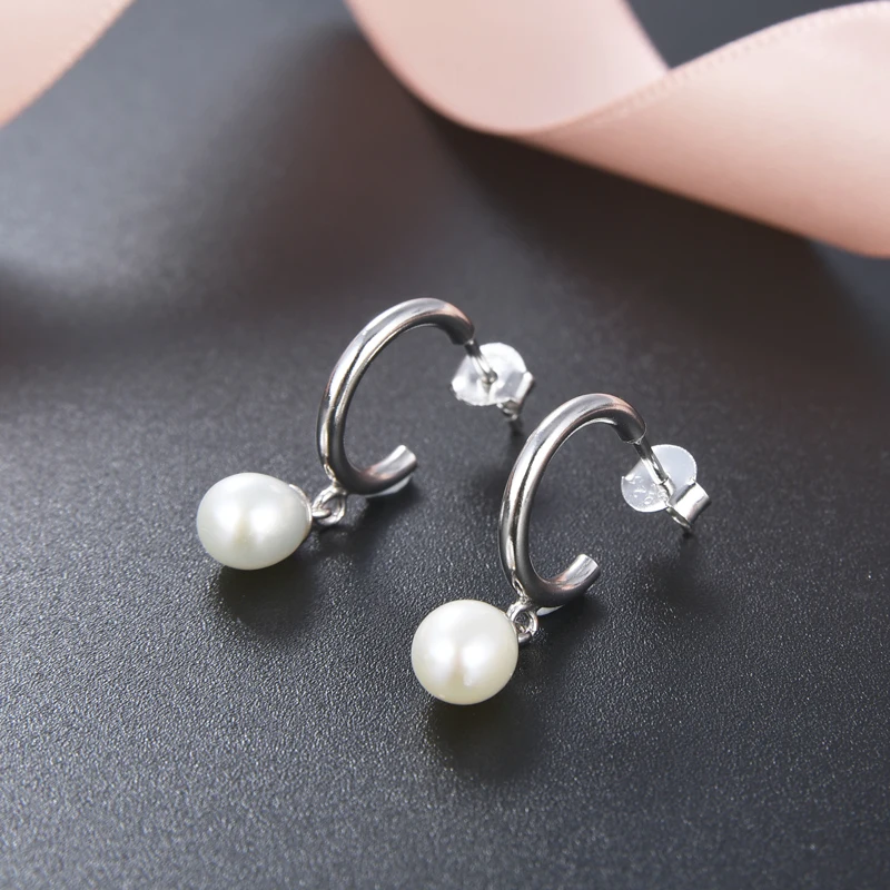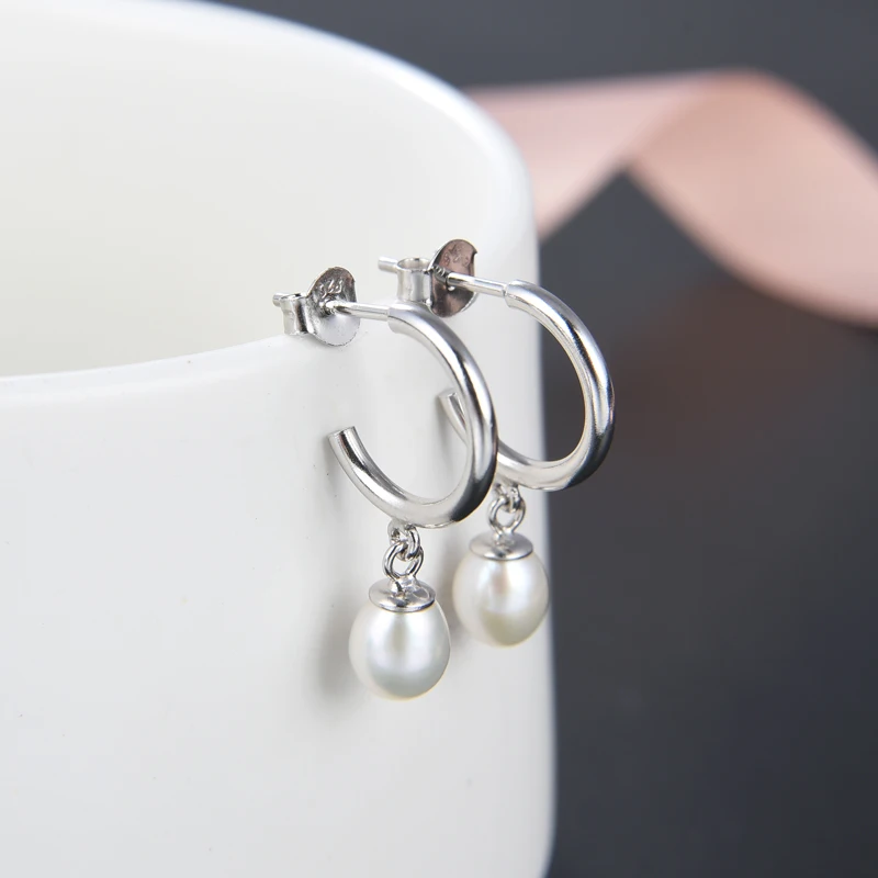 925 Sterling Silver Post Round Edge Dangle Pearl Open Hoop Women Earrings
