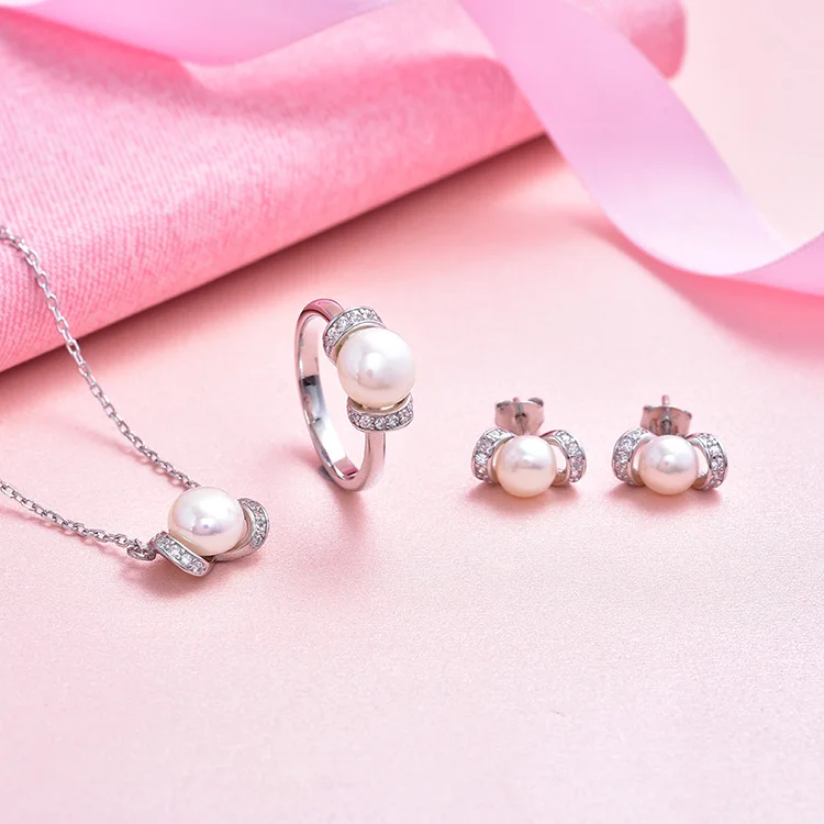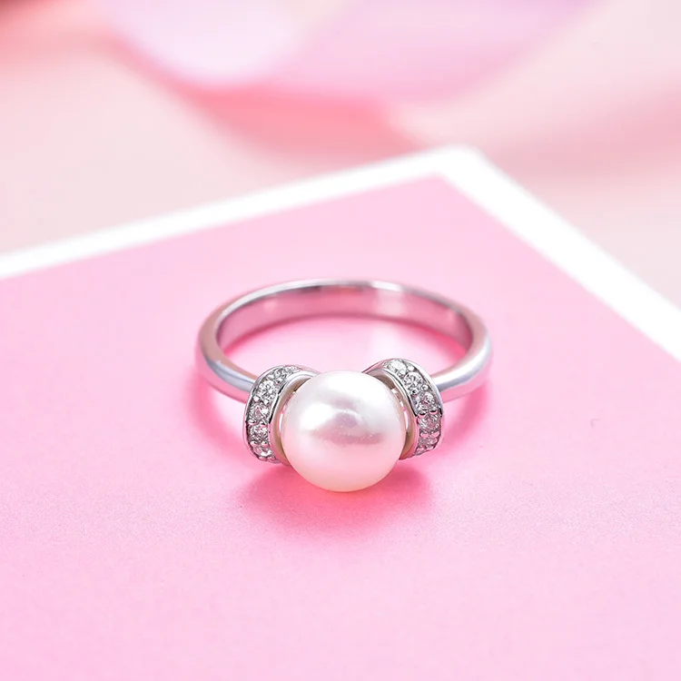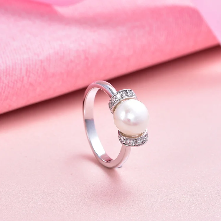 Women 925 Sterling Silver Jewelry Ring Prong Setting Fashion Freshwater Pearl Dubai White Gold Ring