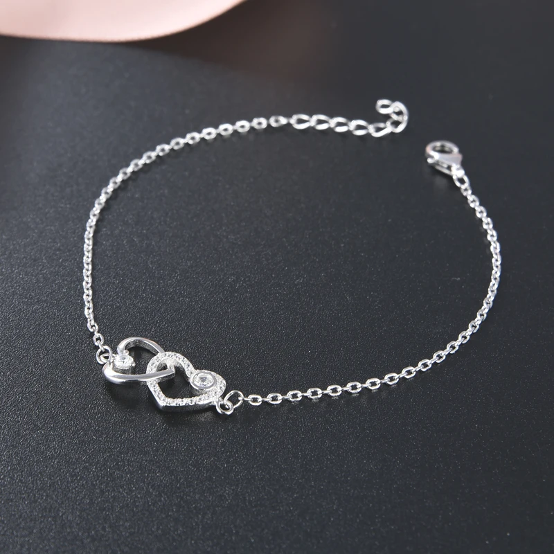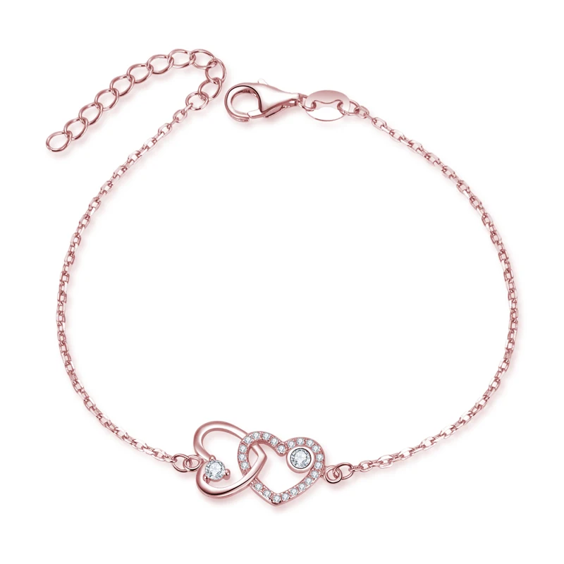 Elegant 18K Gold Plated Double Heart Link Bracelets for Women Forever Love Sterling Silver Bangles with Zircon Main Stone