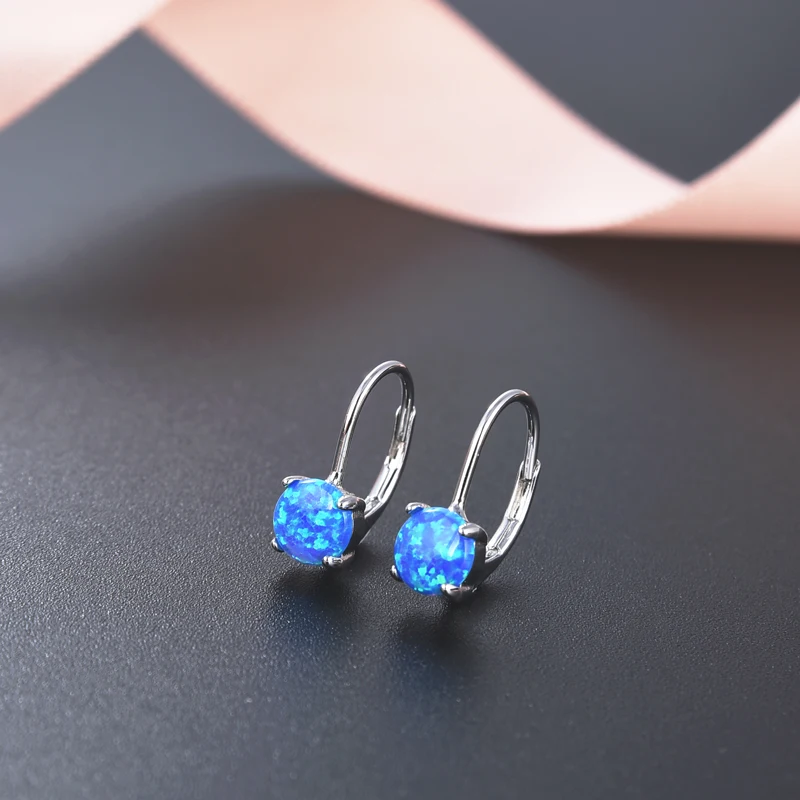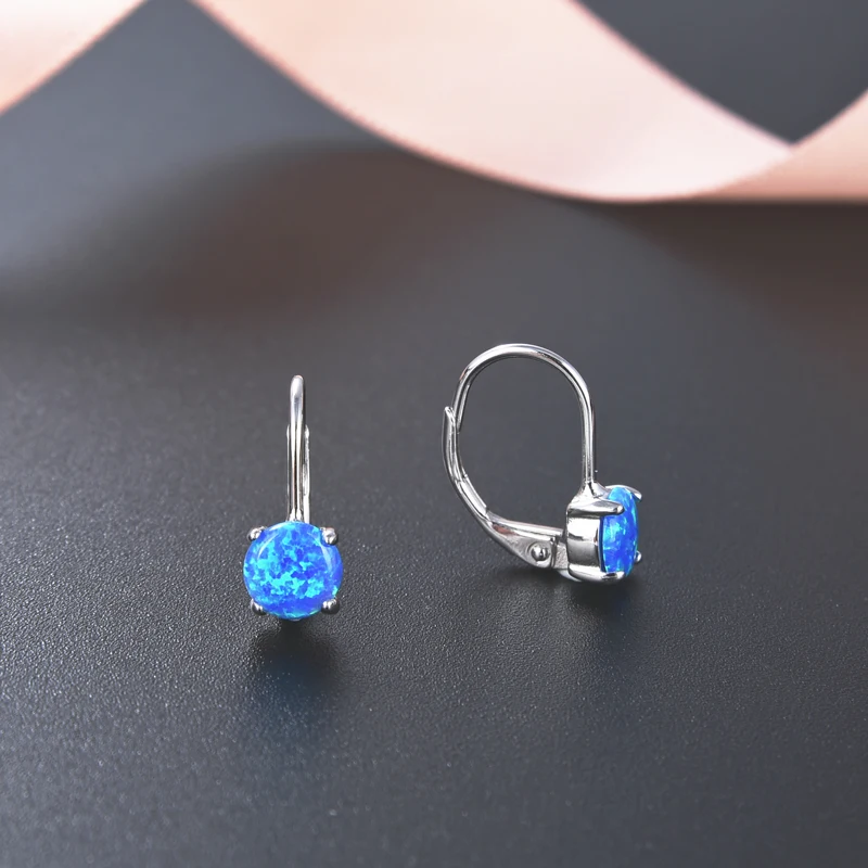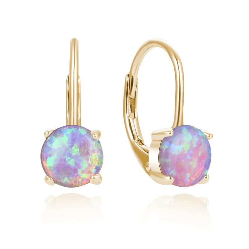 Sterling Silver Simulated Created Round Shape Opal Gemstone Drop Dainty Leverback Earrings