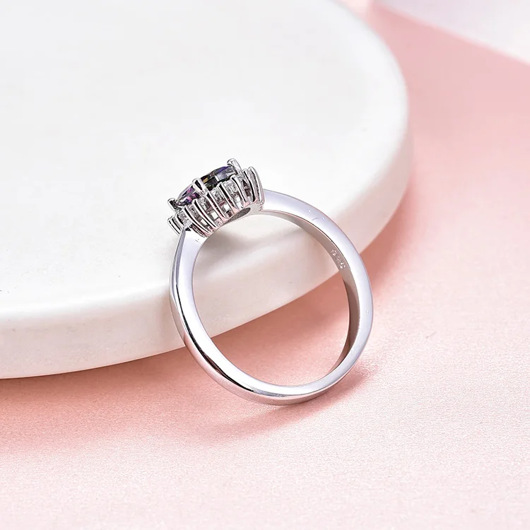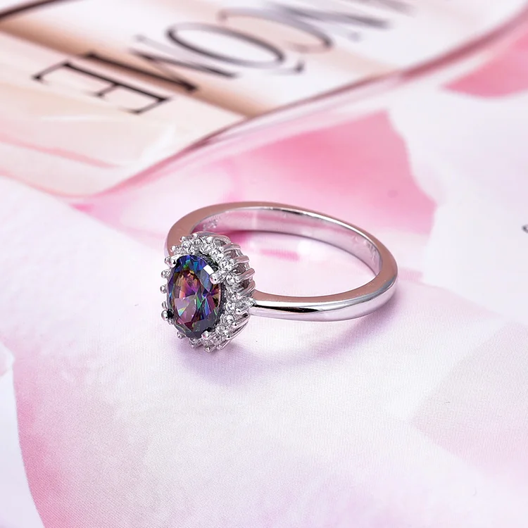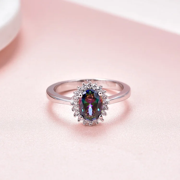 Fashion Women's 925 Silver Oval Cut Crystal Gemstone Ring with Diamond Main Stone Rhodium Plated Setting for Party Engagement