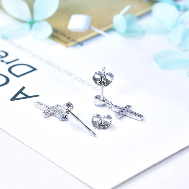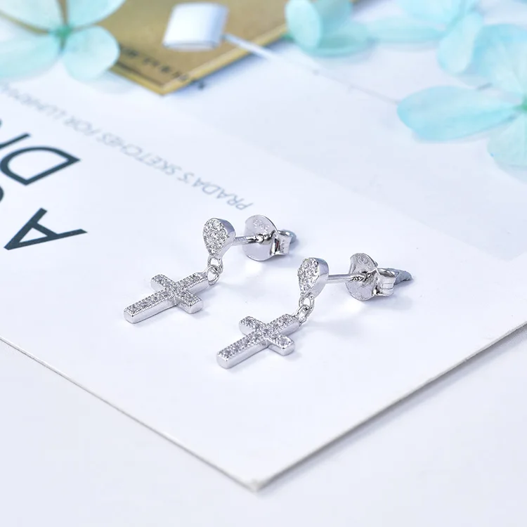 925 Sterling Silver Rhodium Plated Cross Earrings | Dangling Pendant Zirconia Accents | Hypoallergenic Religious Drop Earrings