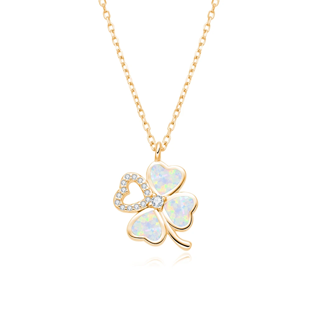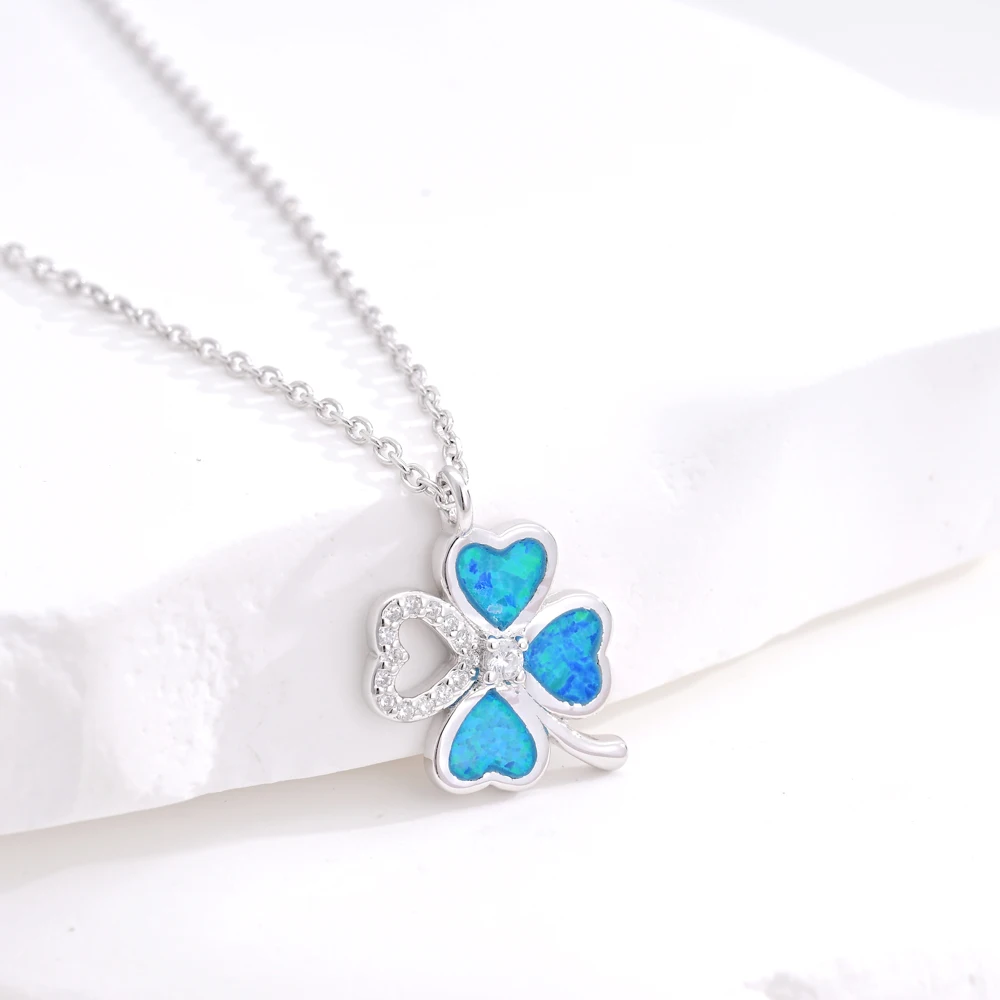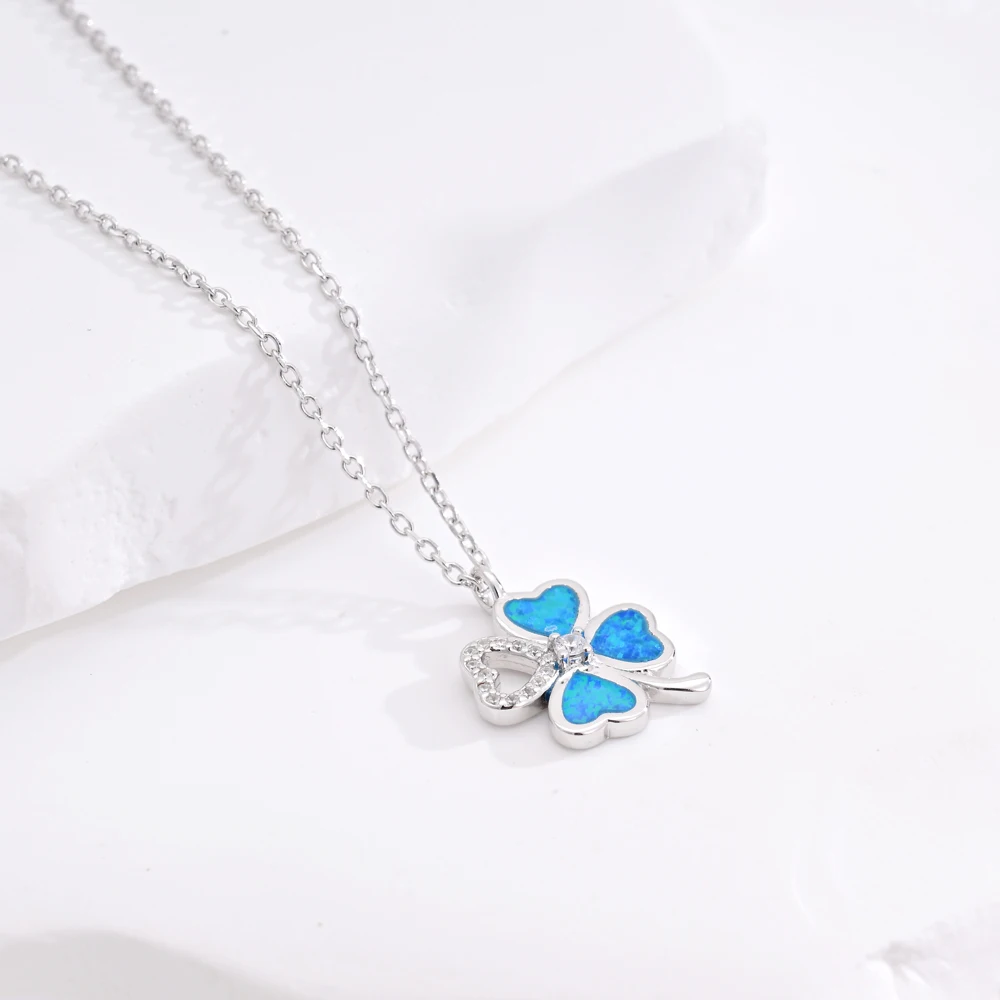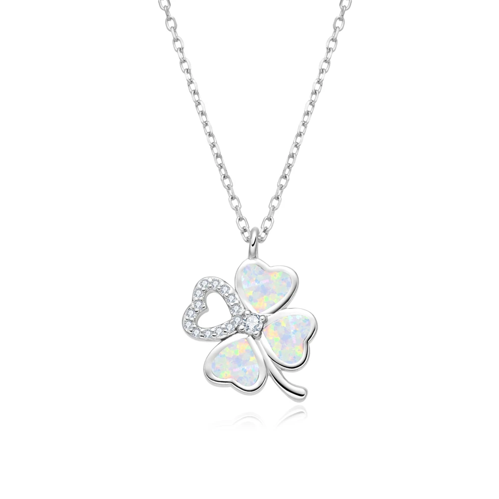 925 Sterling Silver Good Fortune Jewelry Zircon Lucky Four-Leaf Clover OPal Pendant Necklace for Women