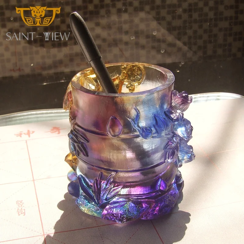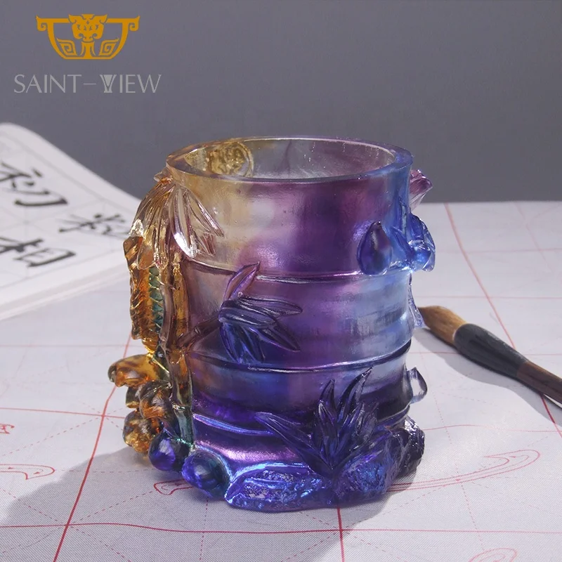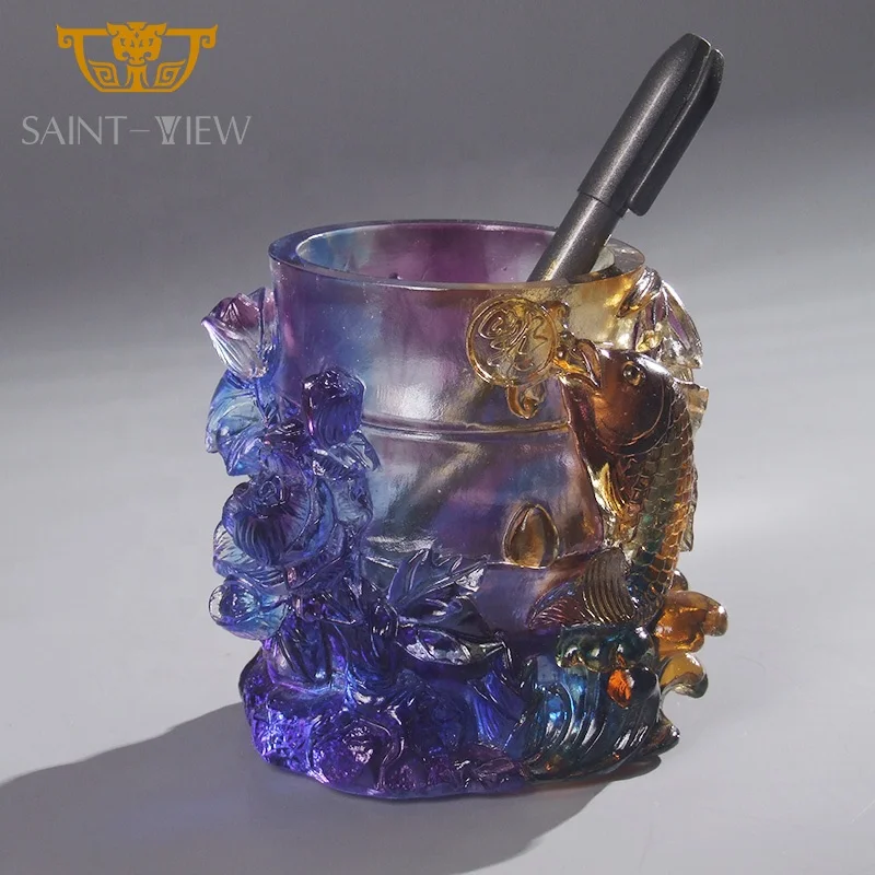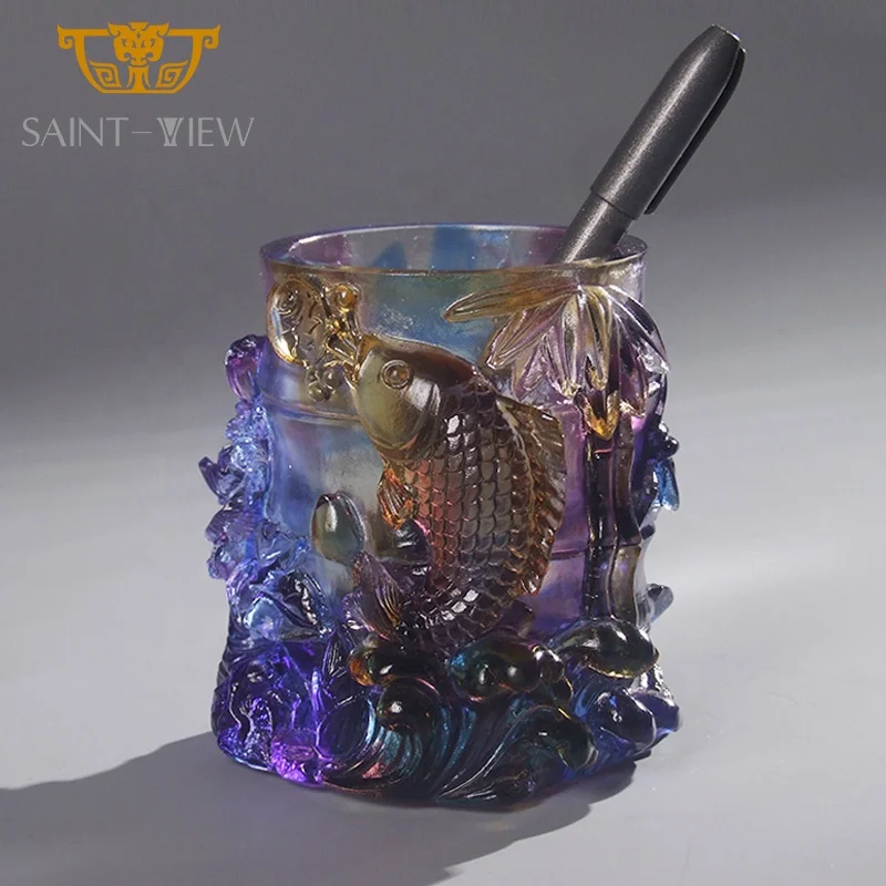 Liuli Crystal Glass Fish Lotus Office Feng Shui Decorative Pen Holder