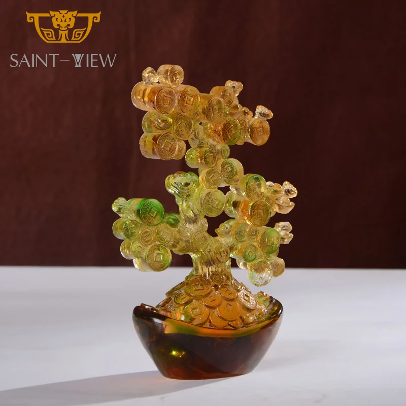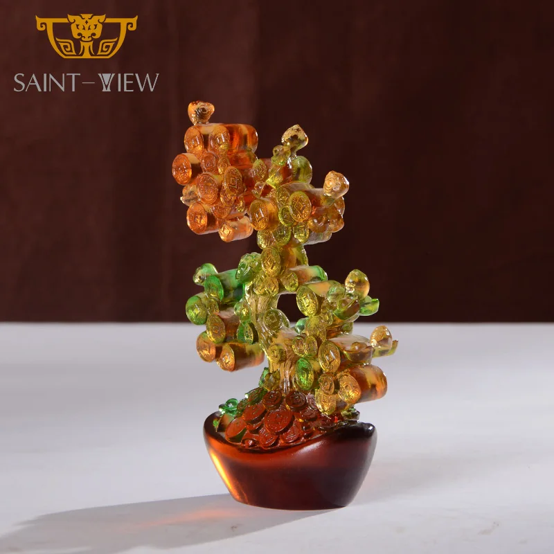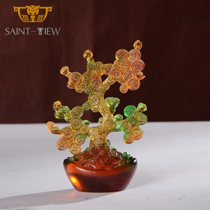 Feng Shui Lucky Fortune Craft Liuli Crystal Chinese Home Decoration Flower Carved Crystal Figurine Fengshui Money Tree