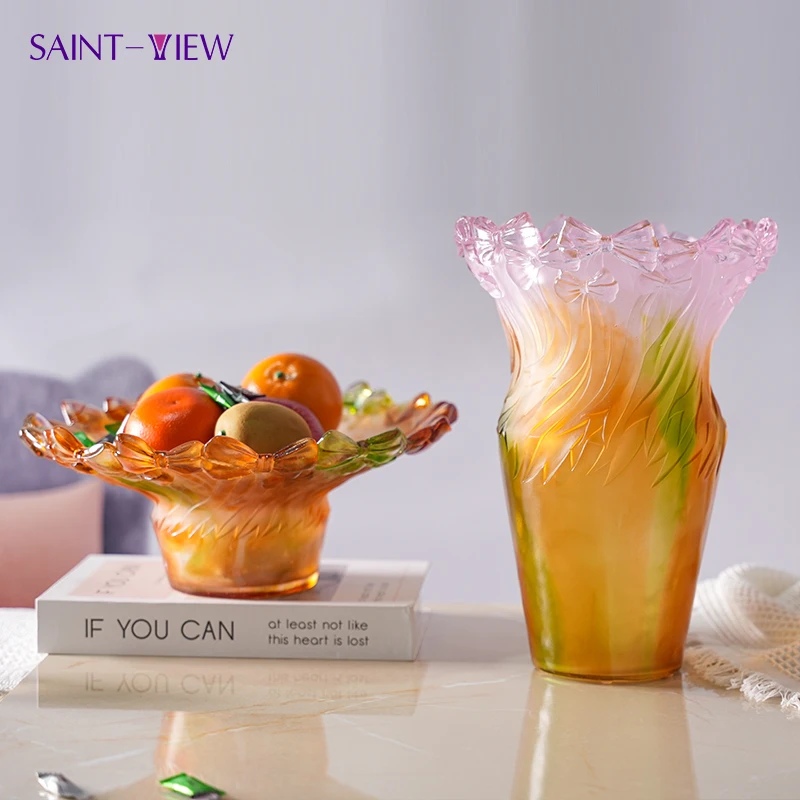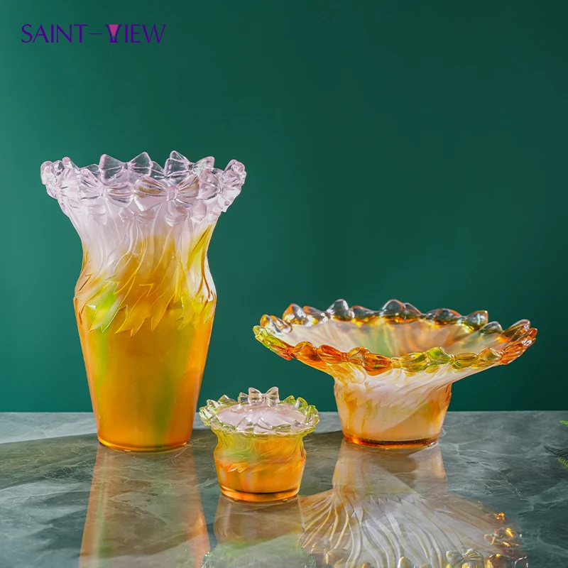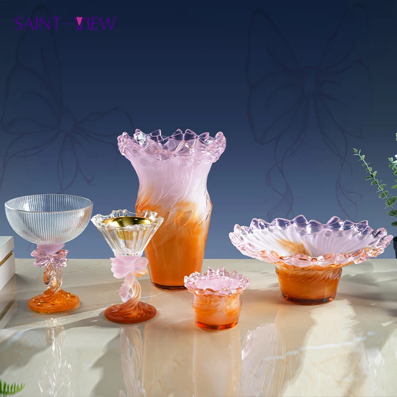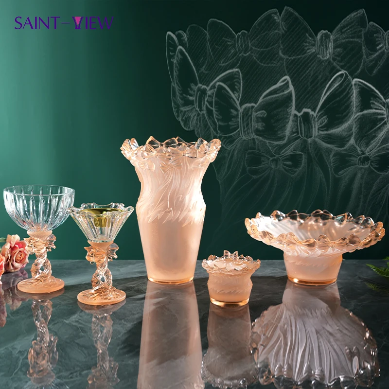 Handmade Art Crystal Glass Ribbon Decor Set Vase Bowl Tray Candy Jar Goblet for Wedding Centerpiece or Home Decoration