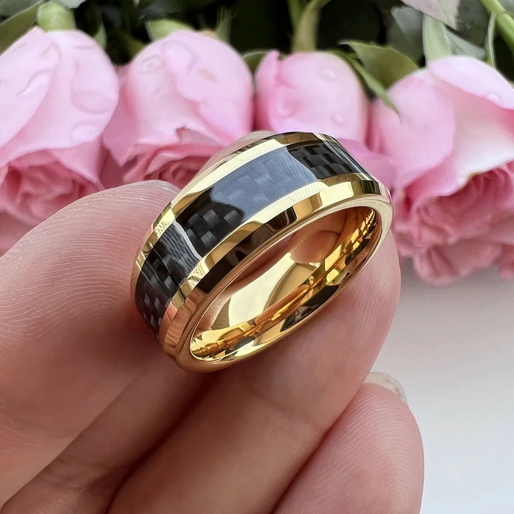 Coolstyle Jewelry 8mm Gold Tungsten Ring Men Women Engagement Wedding Band Black Carbon Fiber Inlay Beveled Edges Comfort Fit