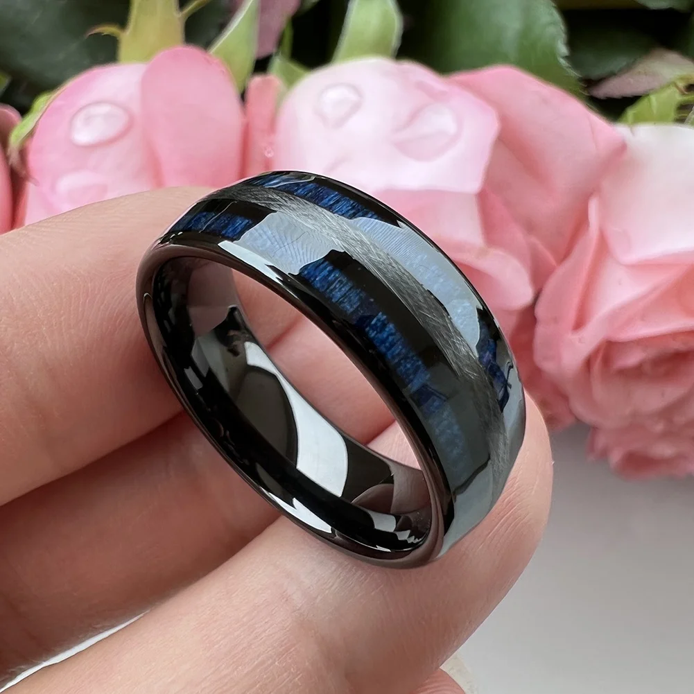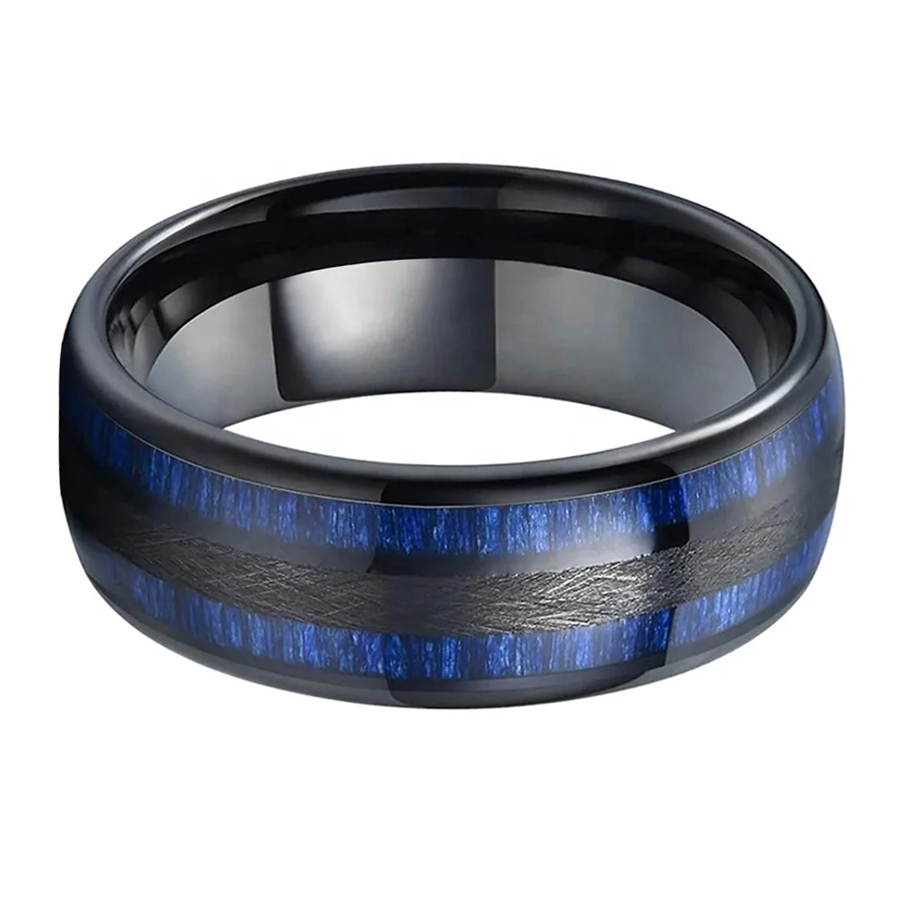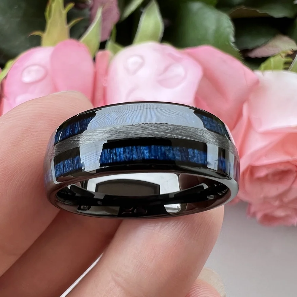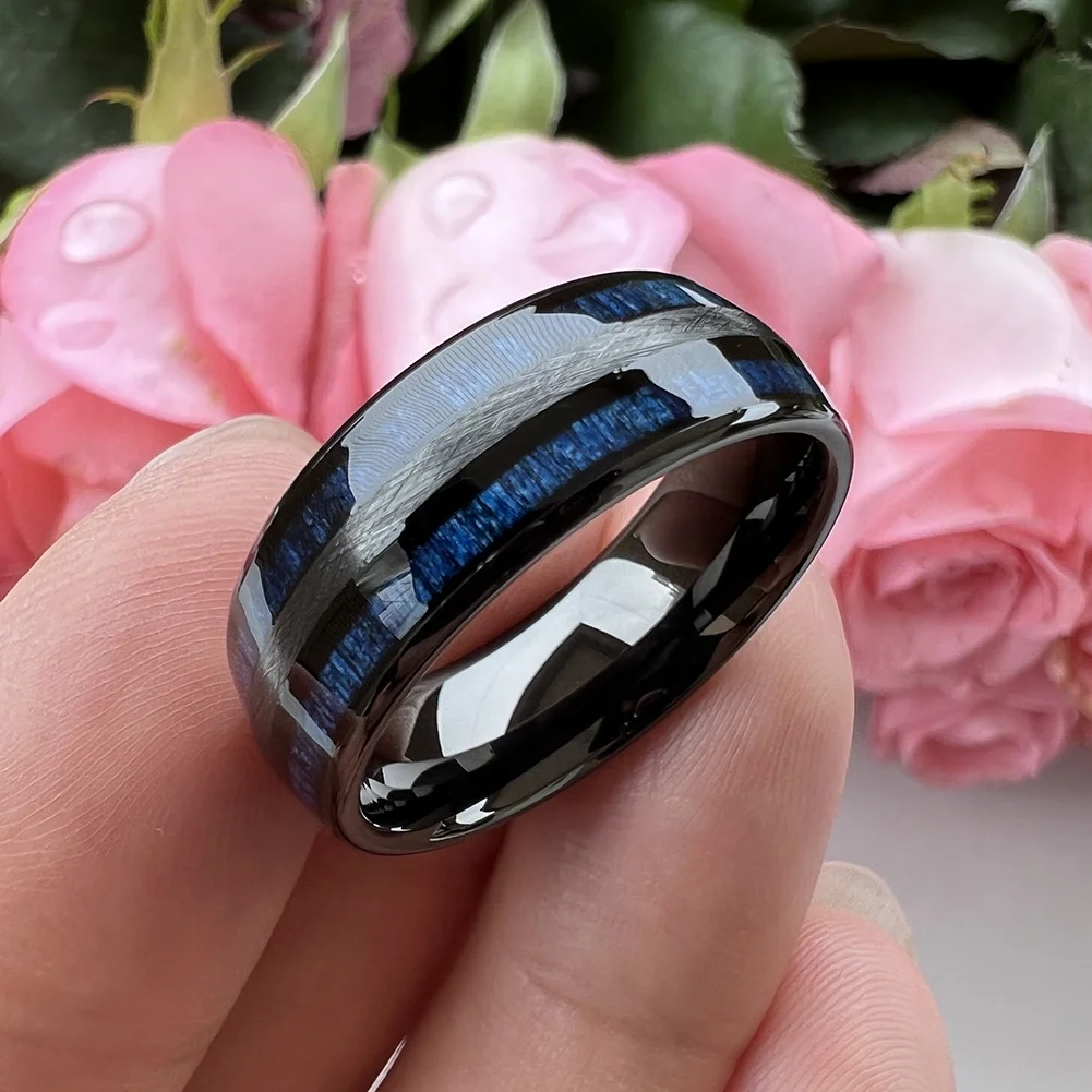 Coolstyle Jewelry 8mm Domed Brushed Black Tungsten Ring for Men Women Double Blue Wood Inlay Fashion Engagement Wedding Band