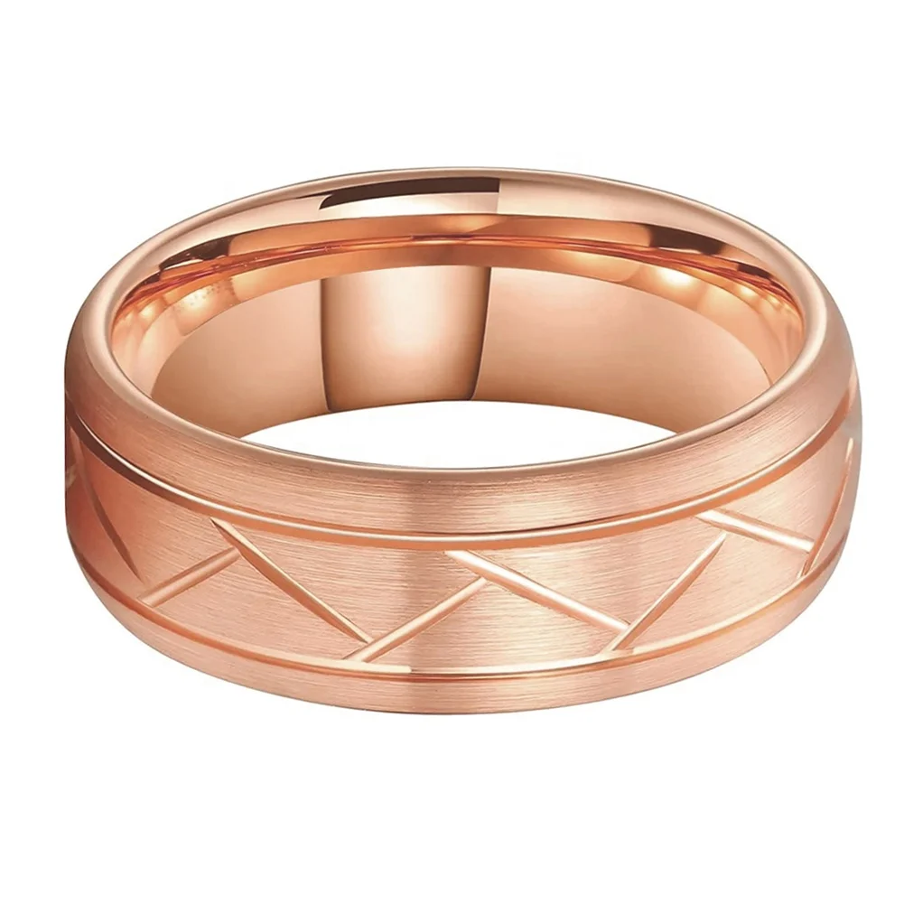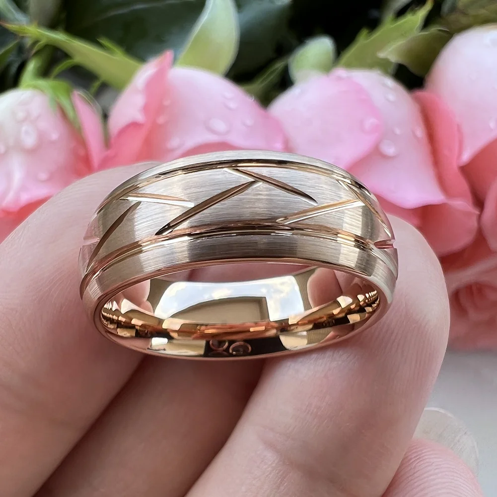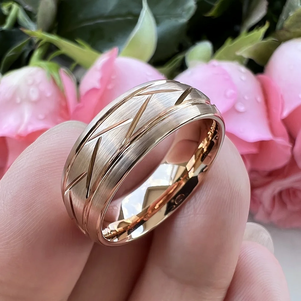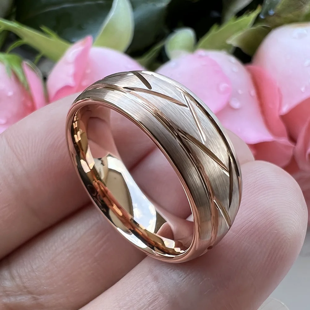 Coolstyle Jewelry Wholesale 8mm Domed Grooved Brushed Rose Gold Tungsten Ring for Men Women Fahion Wedding Band Comfort Fit