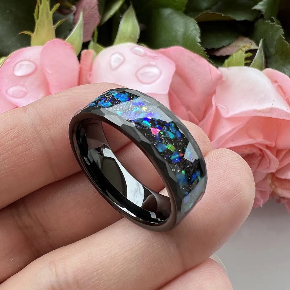 Coolstyle Jewelry 8mm Black Hammered Tungsten Ring for Men Women Galaxy Opal Inlay Fashion Jewelry Engagement Wedding Band