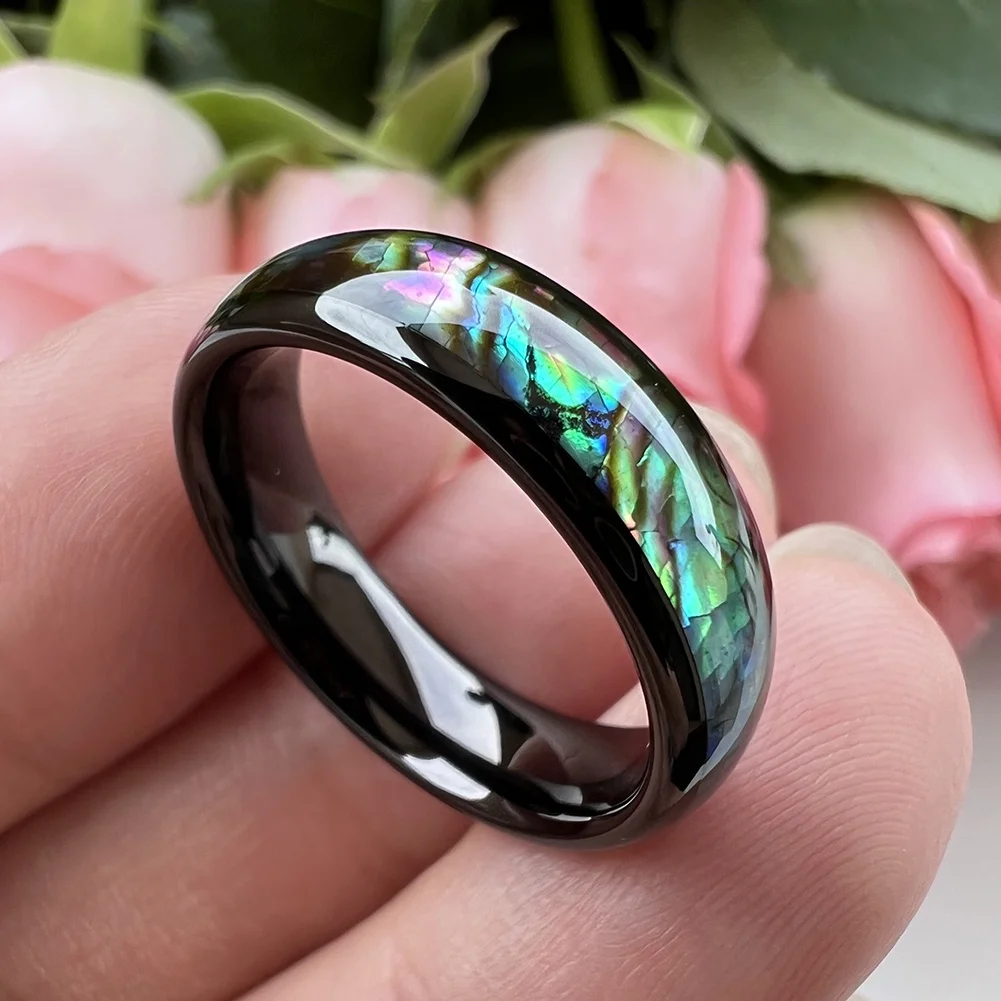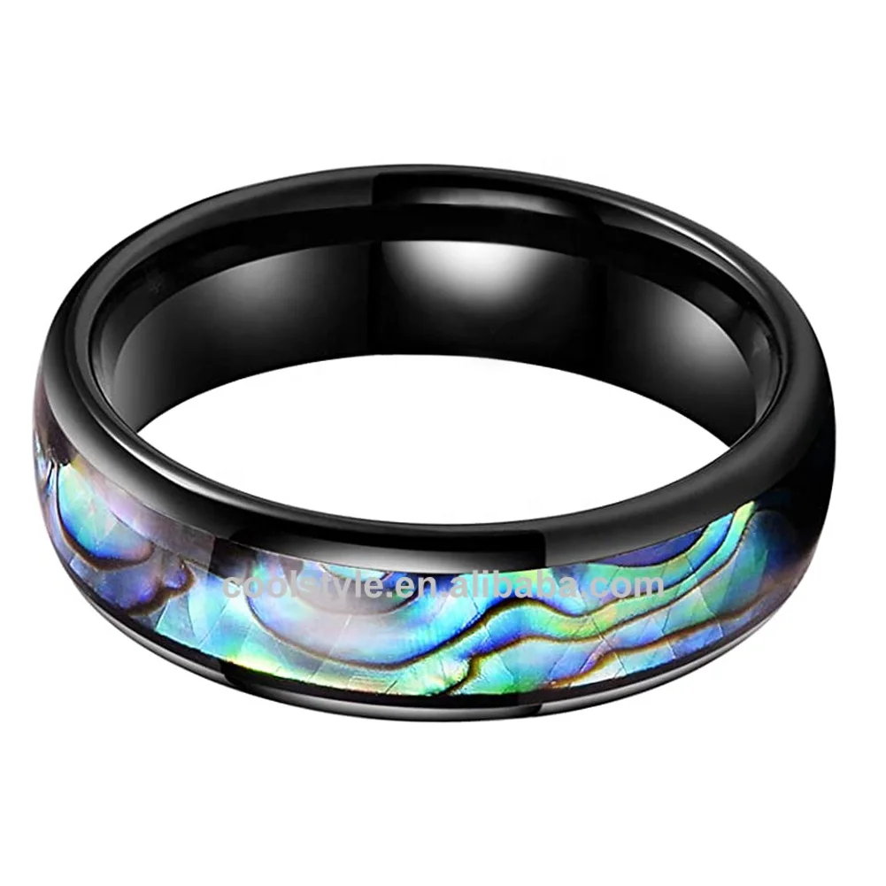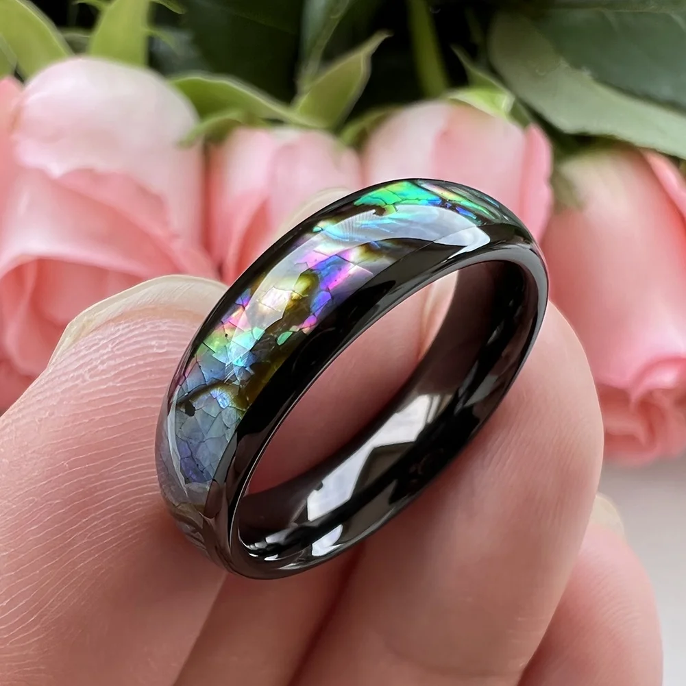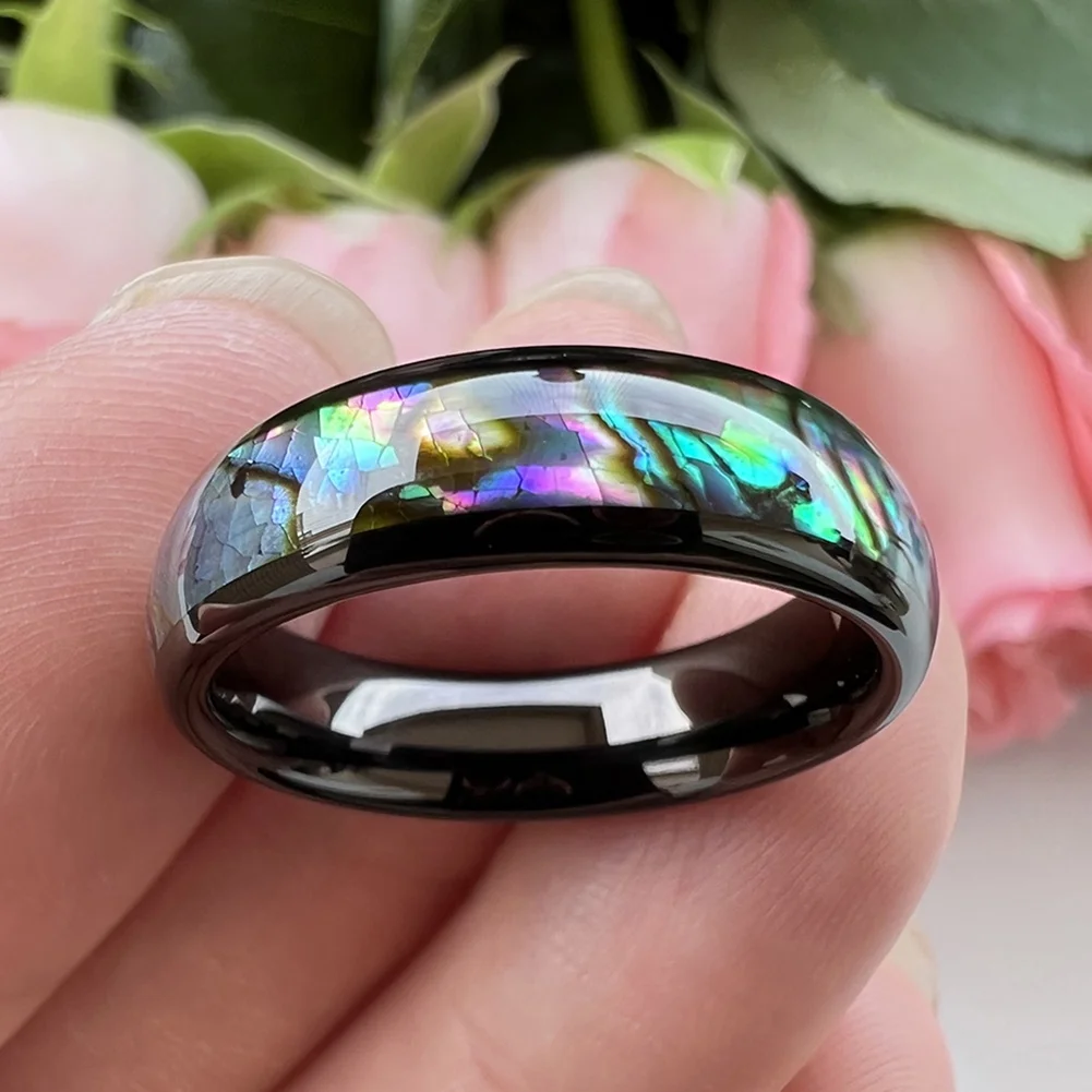 Coolstyle Jewelry 6mm Black Tungsten Carbide Ring for Men Women Engagement Band Abalone Shell Inlay Polished Domed Comfort Fit
