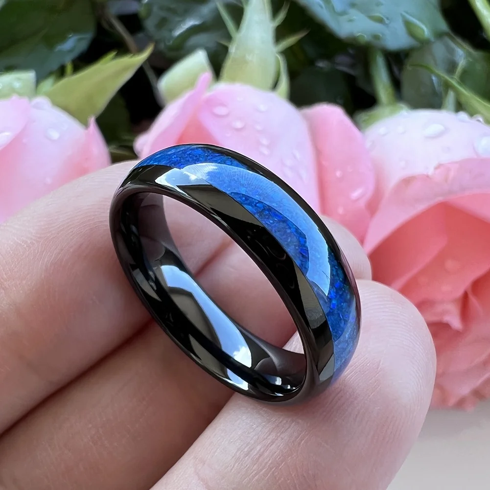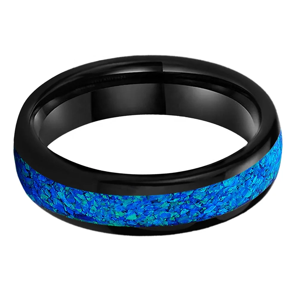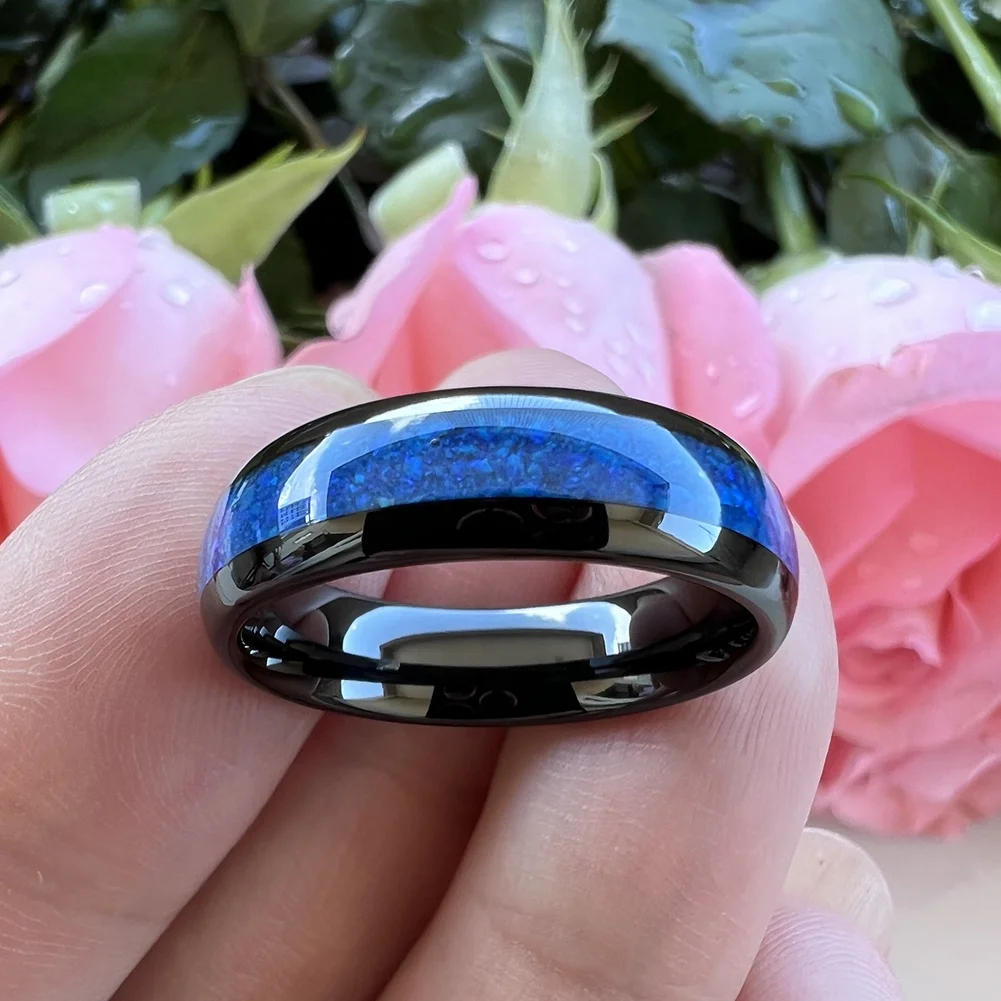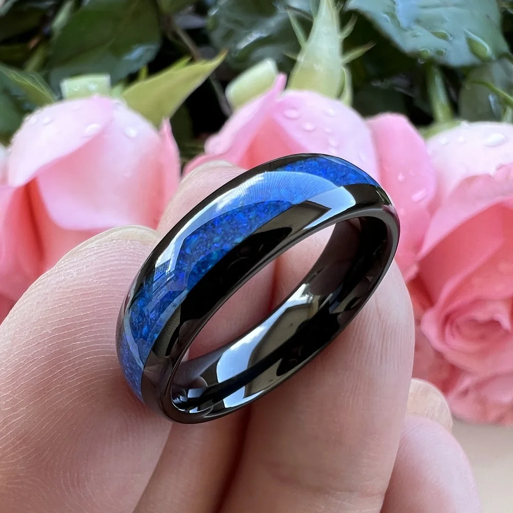 Coolstyle Jewelry 6mm Black Tungsten Carbide Ring for Men Women Engagement Wedding Band Blue Opal Inlay Polished Comfort Fit