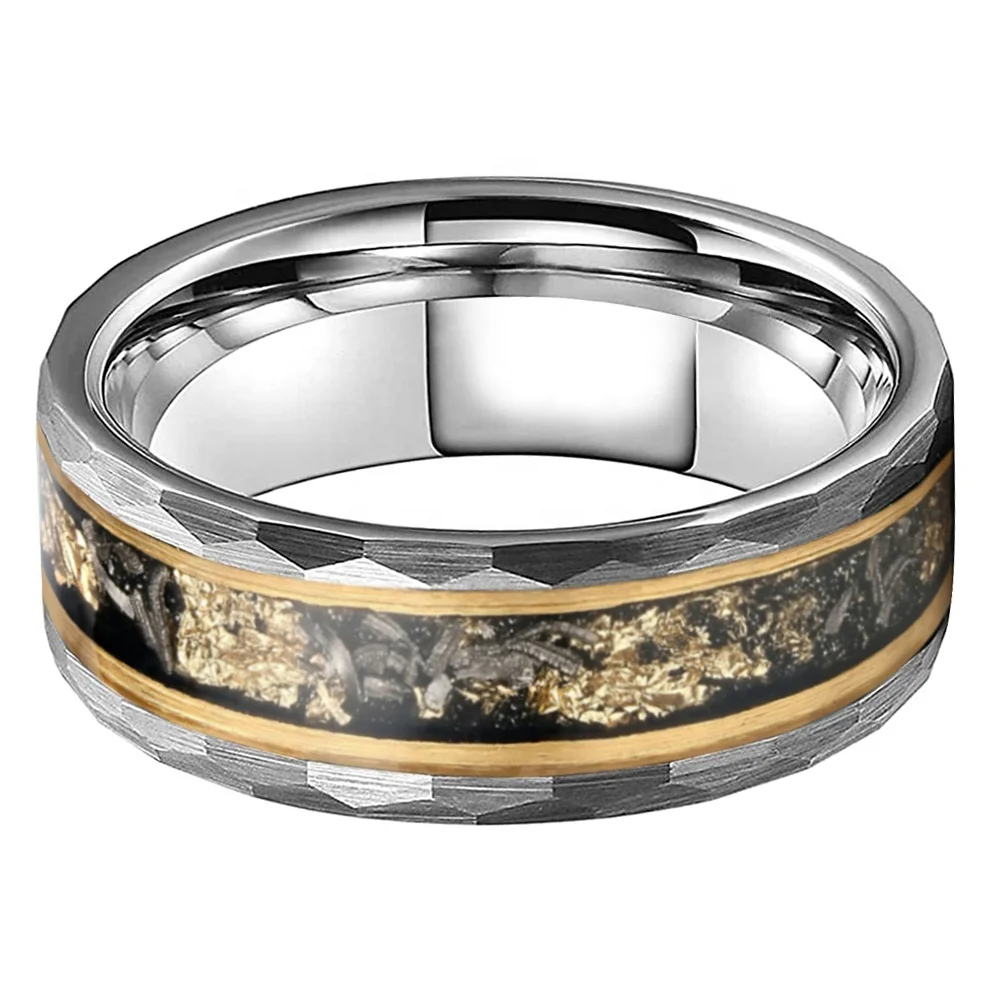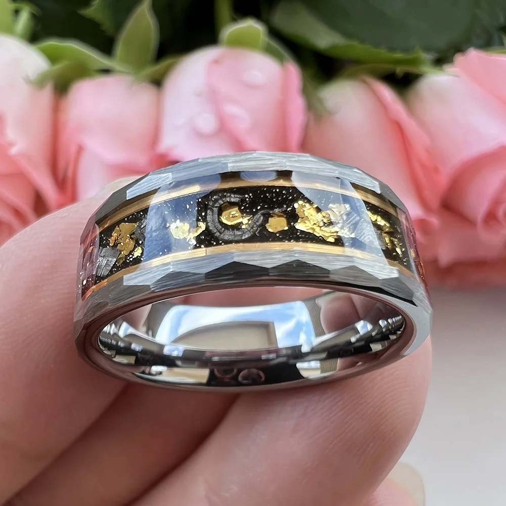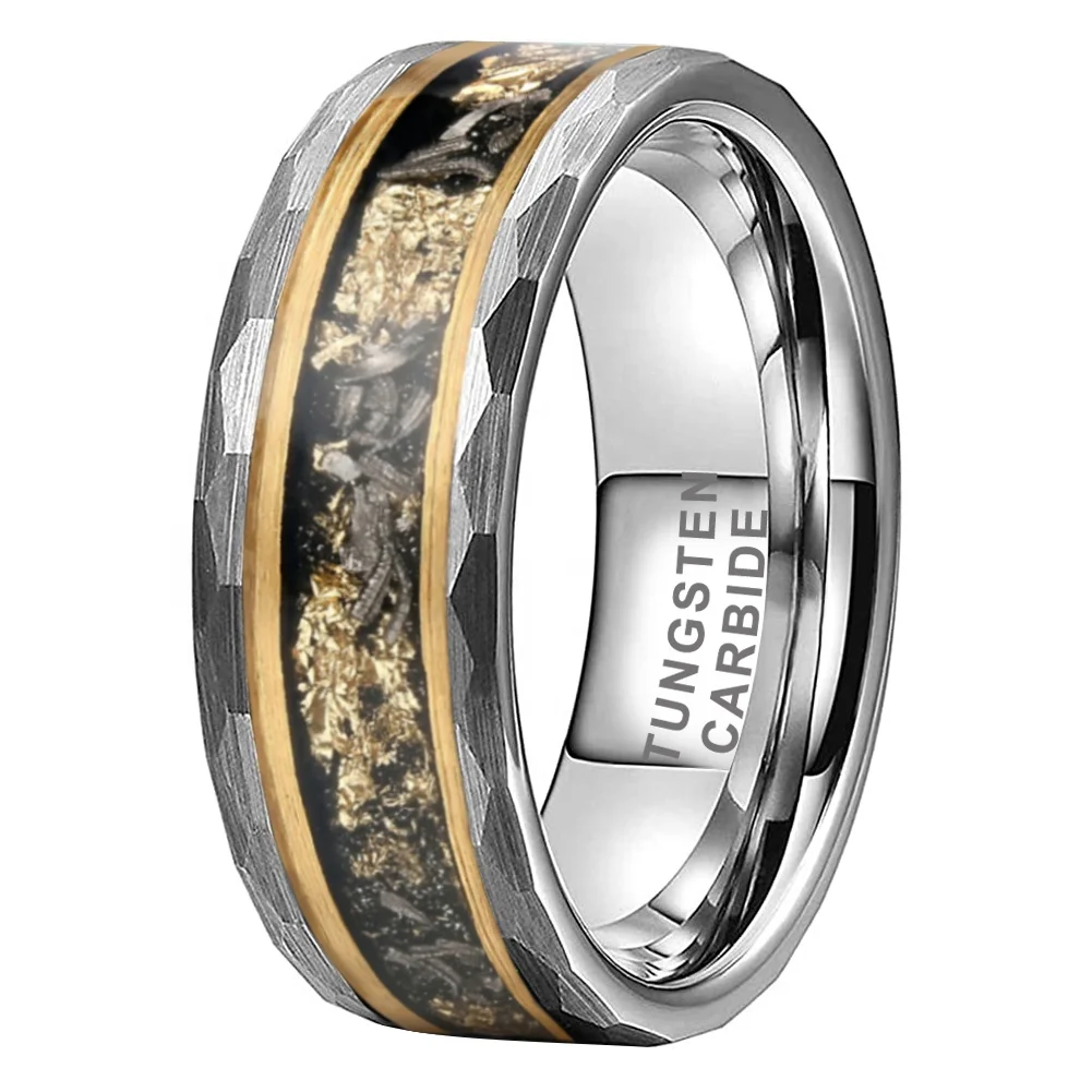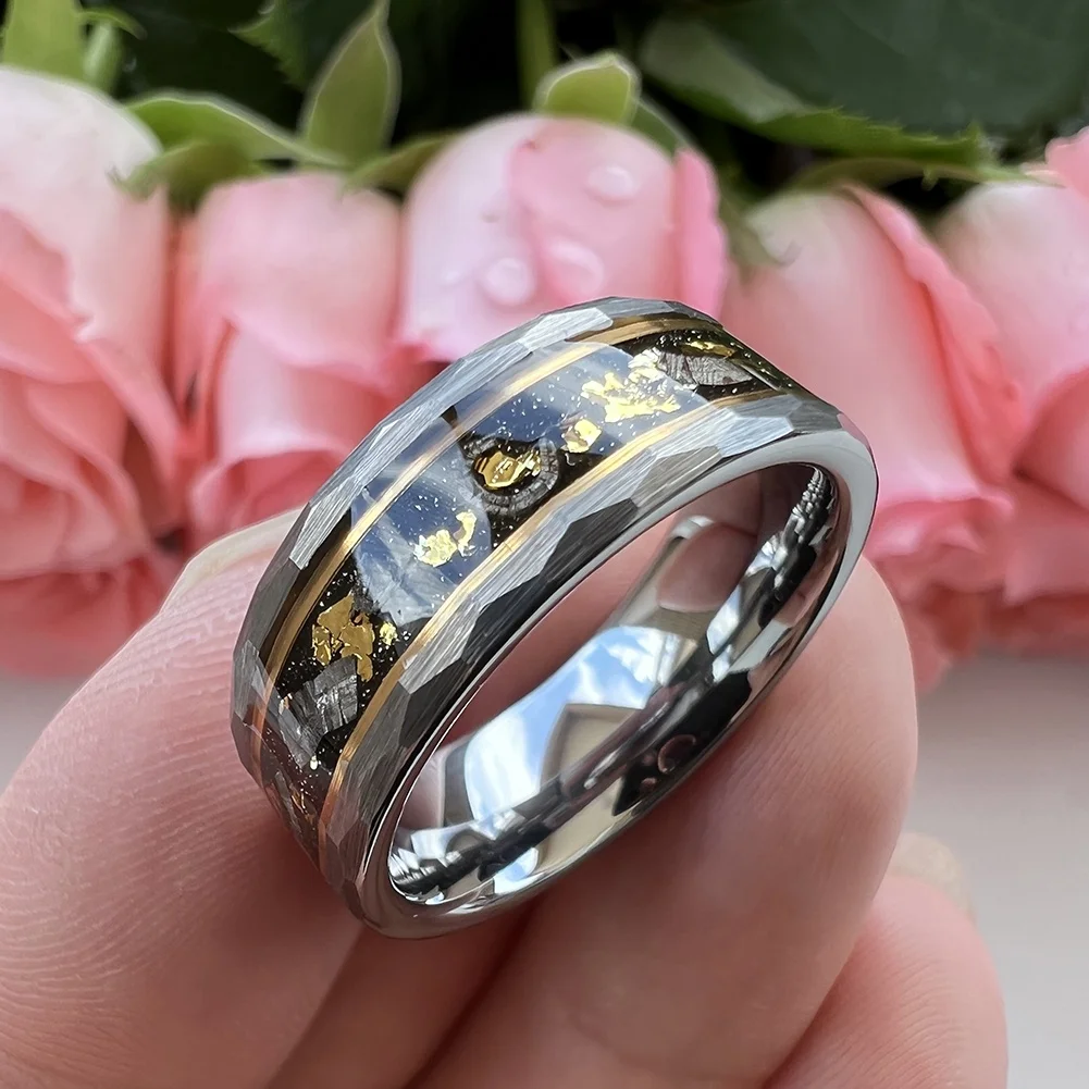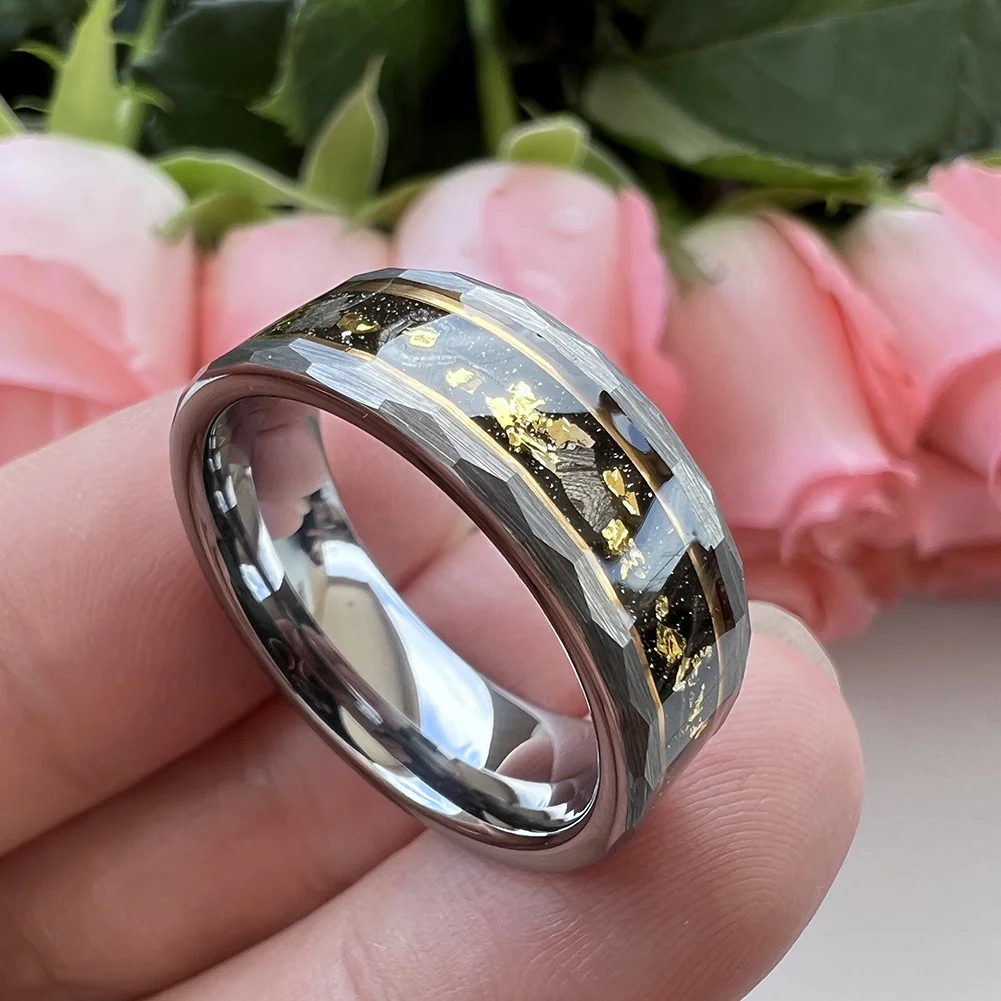 Coolstyle Jewelry 8mm Real Meteorite Chip Gold Foil Inlay Hammered Tungsten Ring for Men Women Fashion Wedding Band Comfort Fit