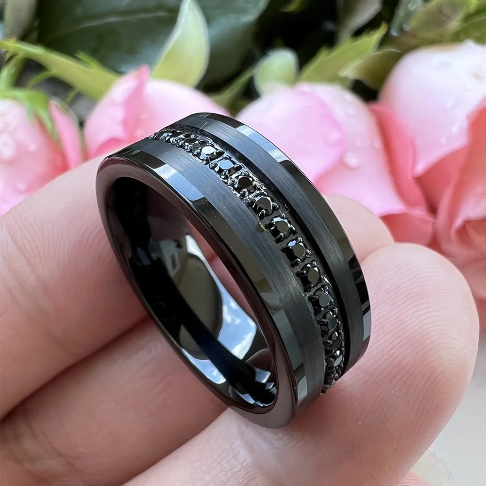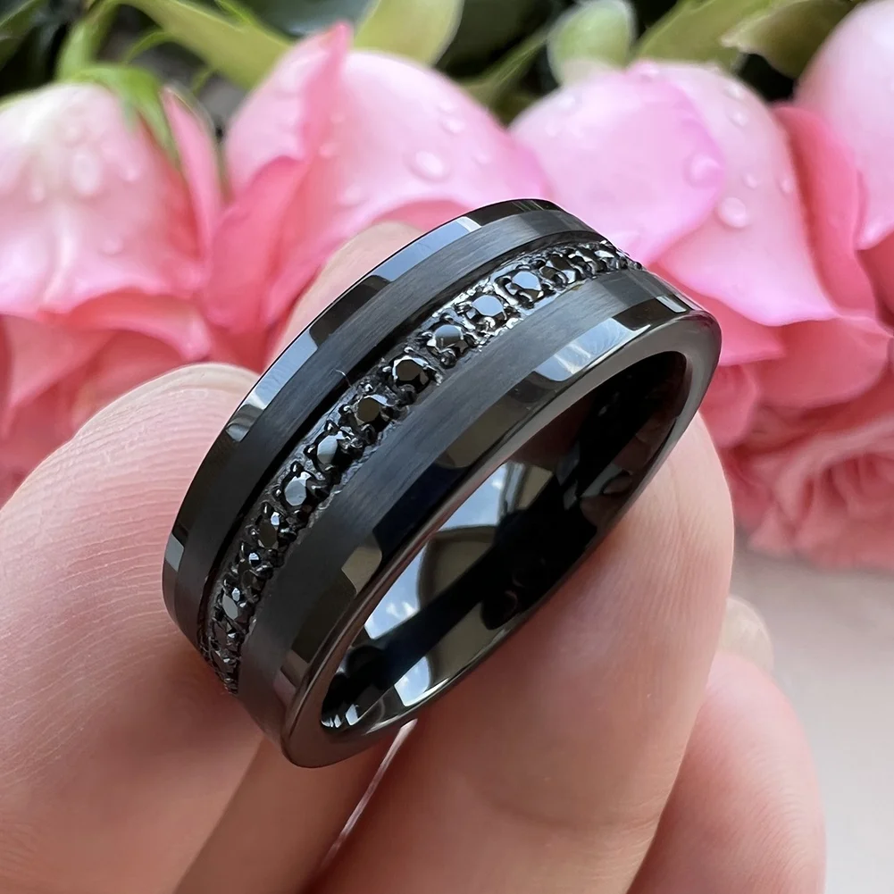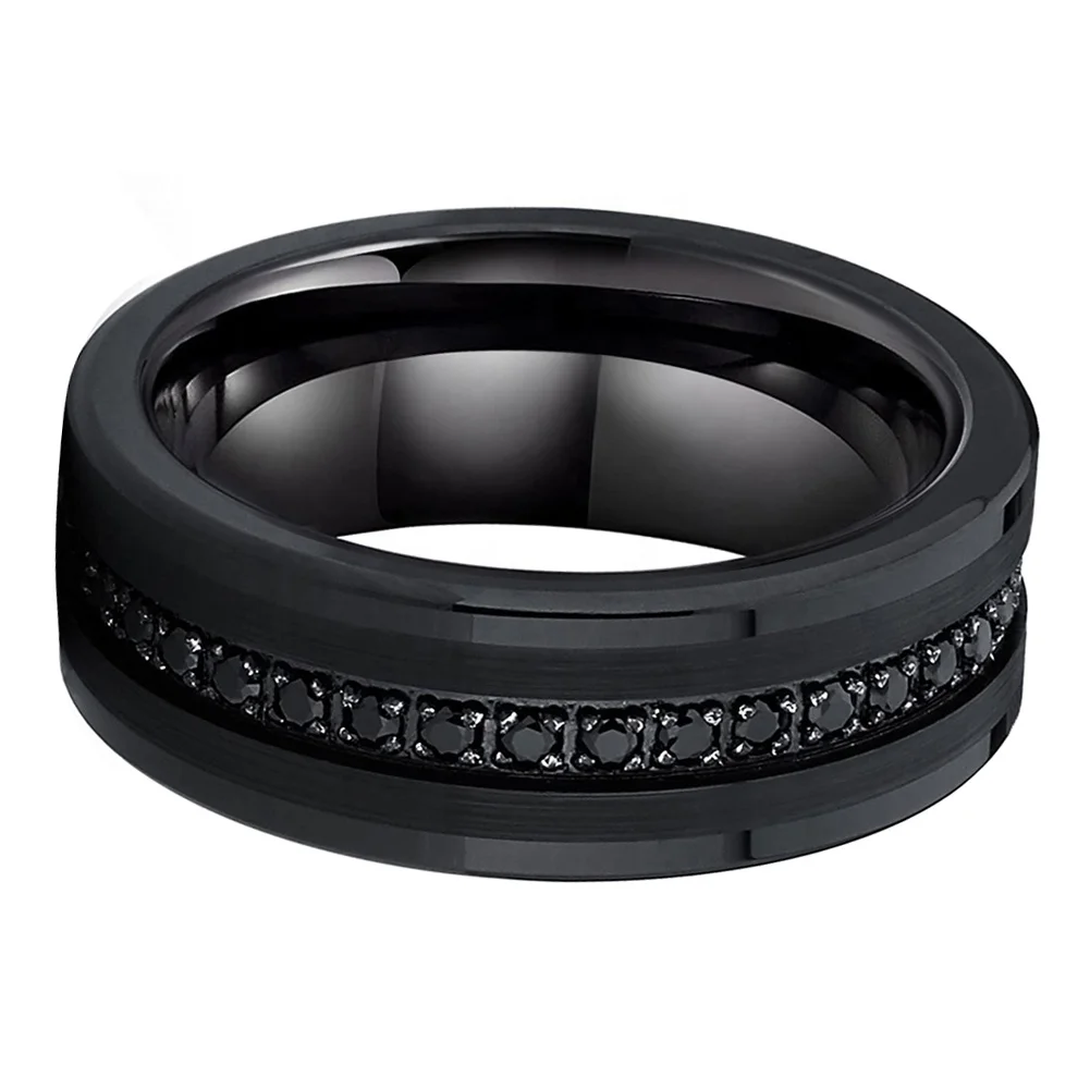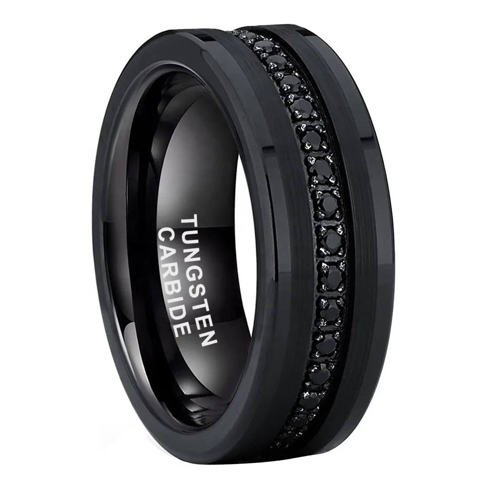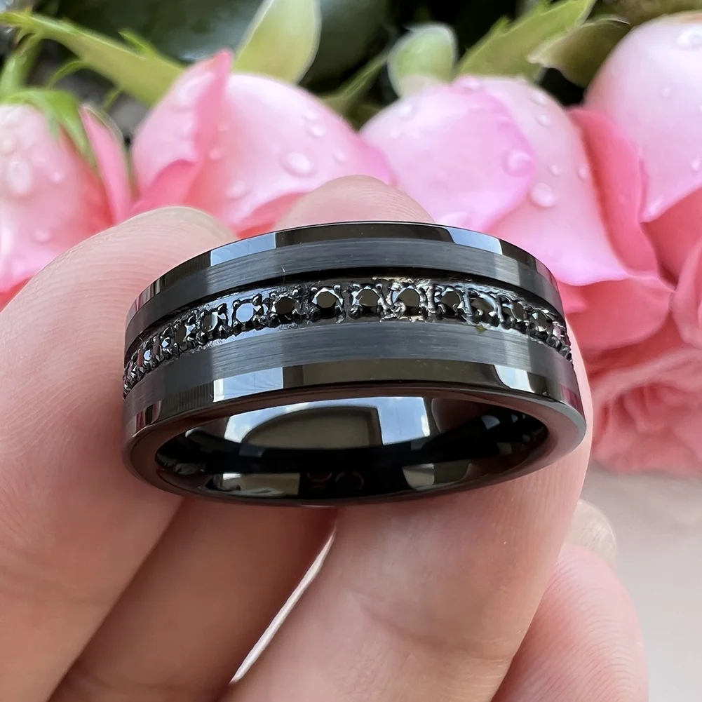 Coolstyle Jewelry 8mm Black Tungsten Ring for Men Women Engagement Promise Wedding Band Princess CZ Stone Inlay Comfort Fit