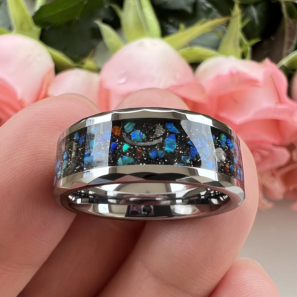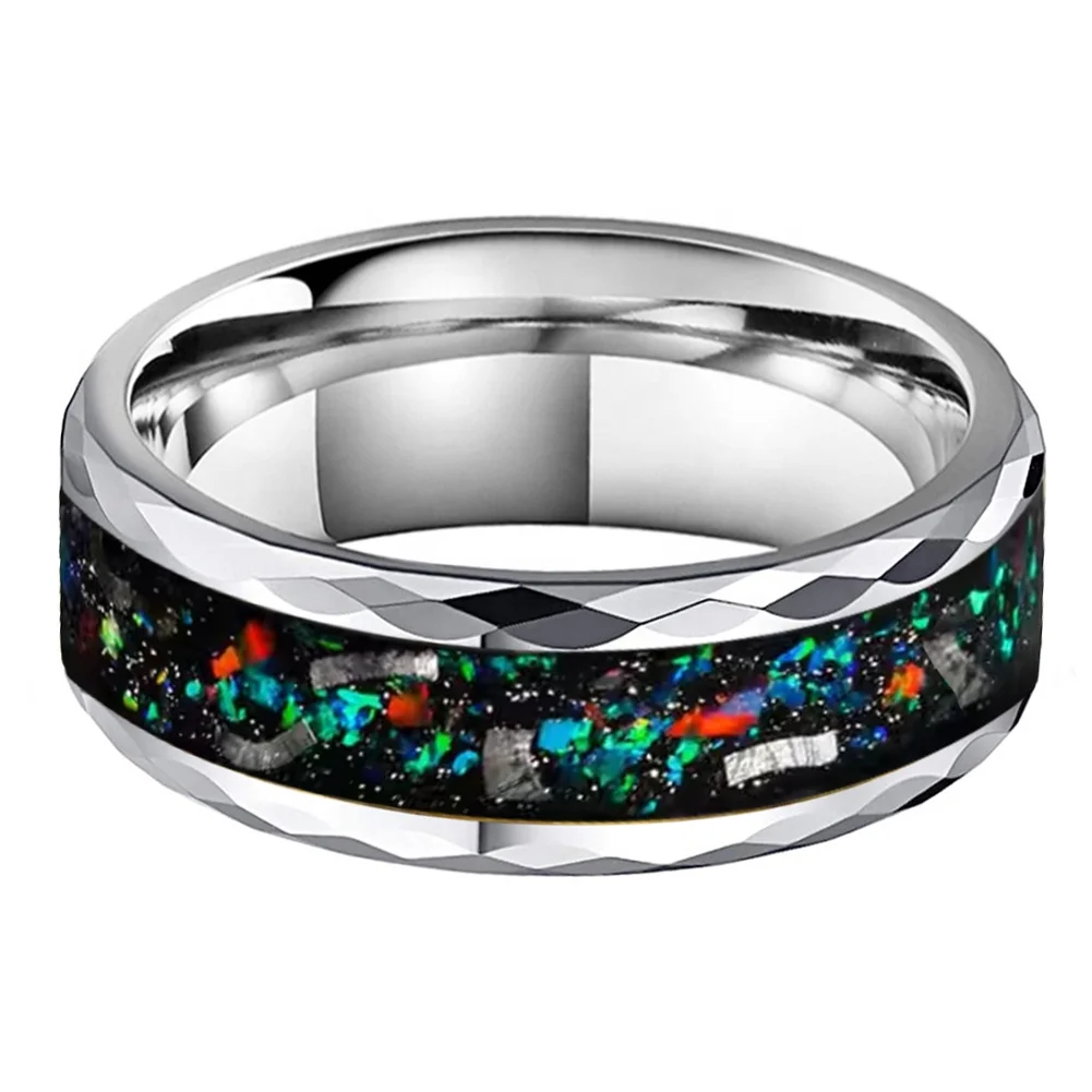 Coolstyle Jewelry 8mm Faceted Edges Mens Fashion Engagement Wedding Band Genuine Meteorite Opal Inlay Tungsten Carbide Rings