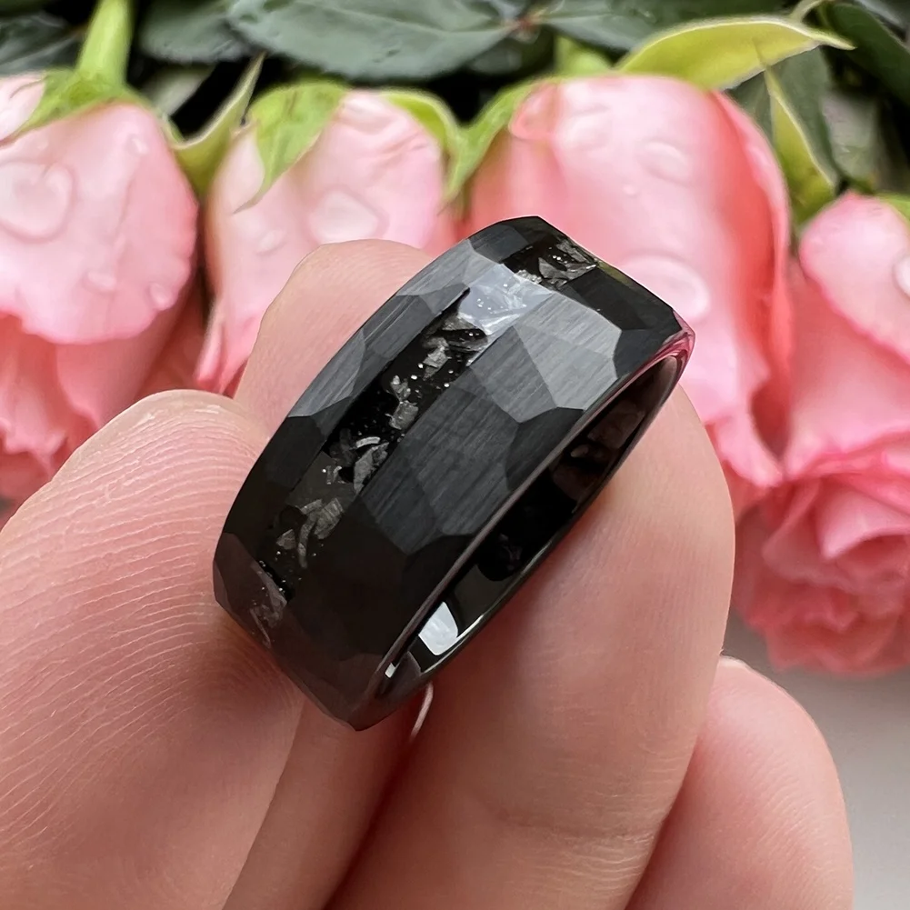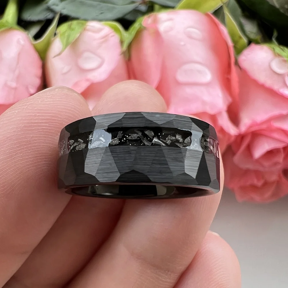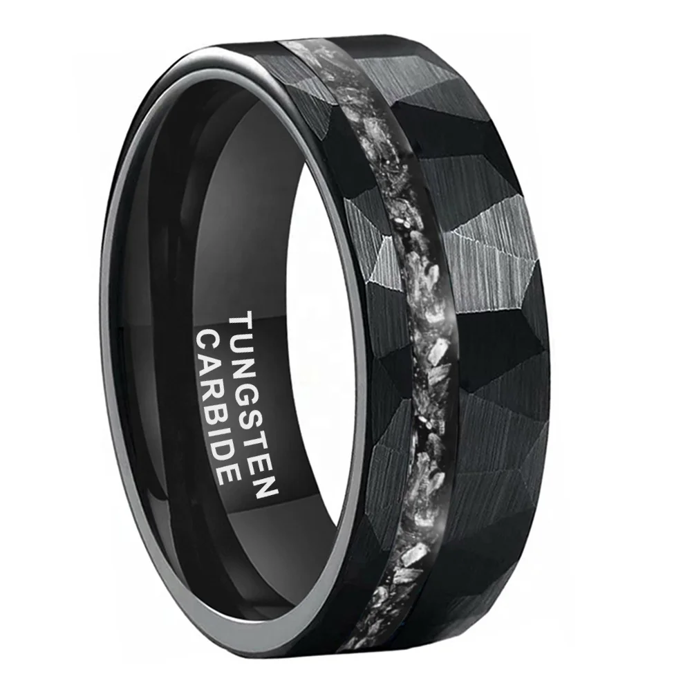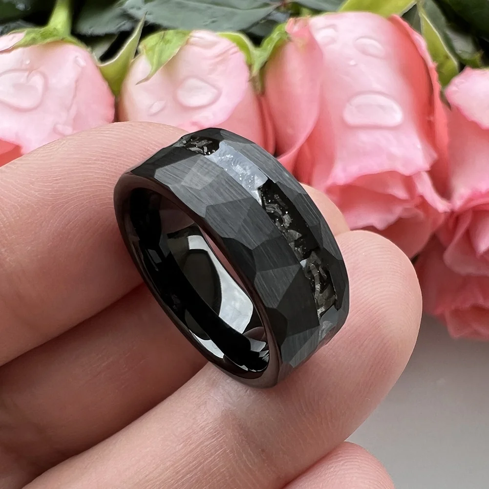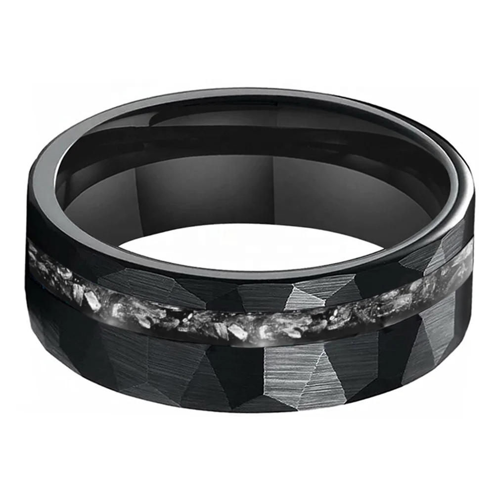 Coolstyle Jewelry 8mm Wholesale Black Hammered Tungsten Ring for Men Women Genuine Meteorite Chip Inlay Engagement Wedding Band