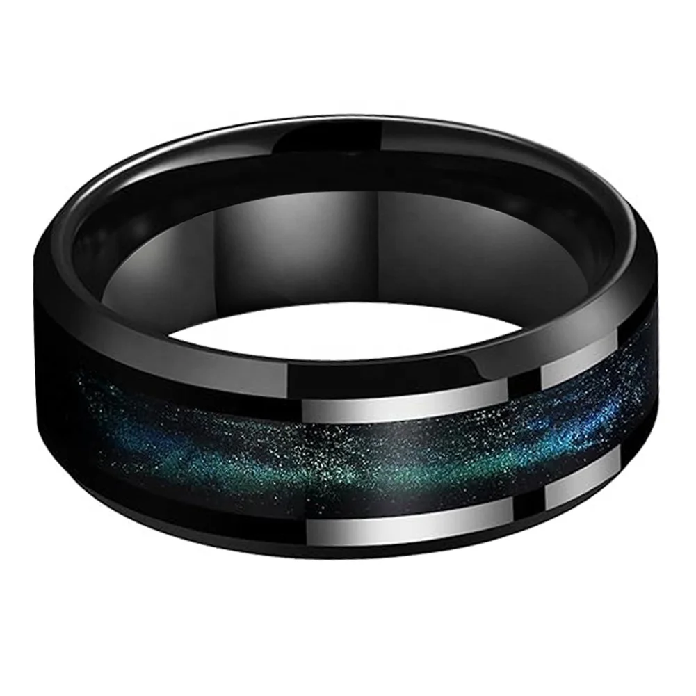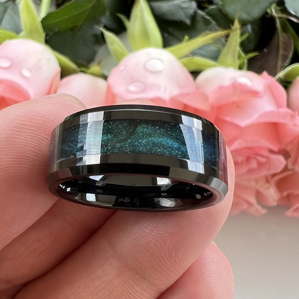 8mm Mens Womens Fashion Wedding Bands for Men Women Beveled Polished Blue Green Flowing Sand Inlay Black Tungsten Carbide Ring