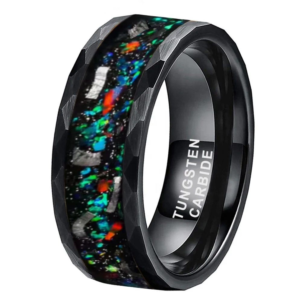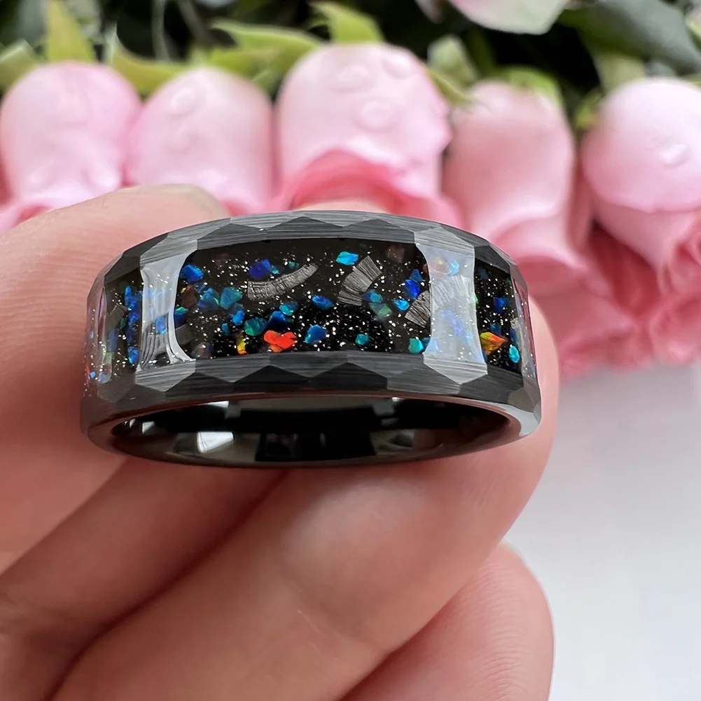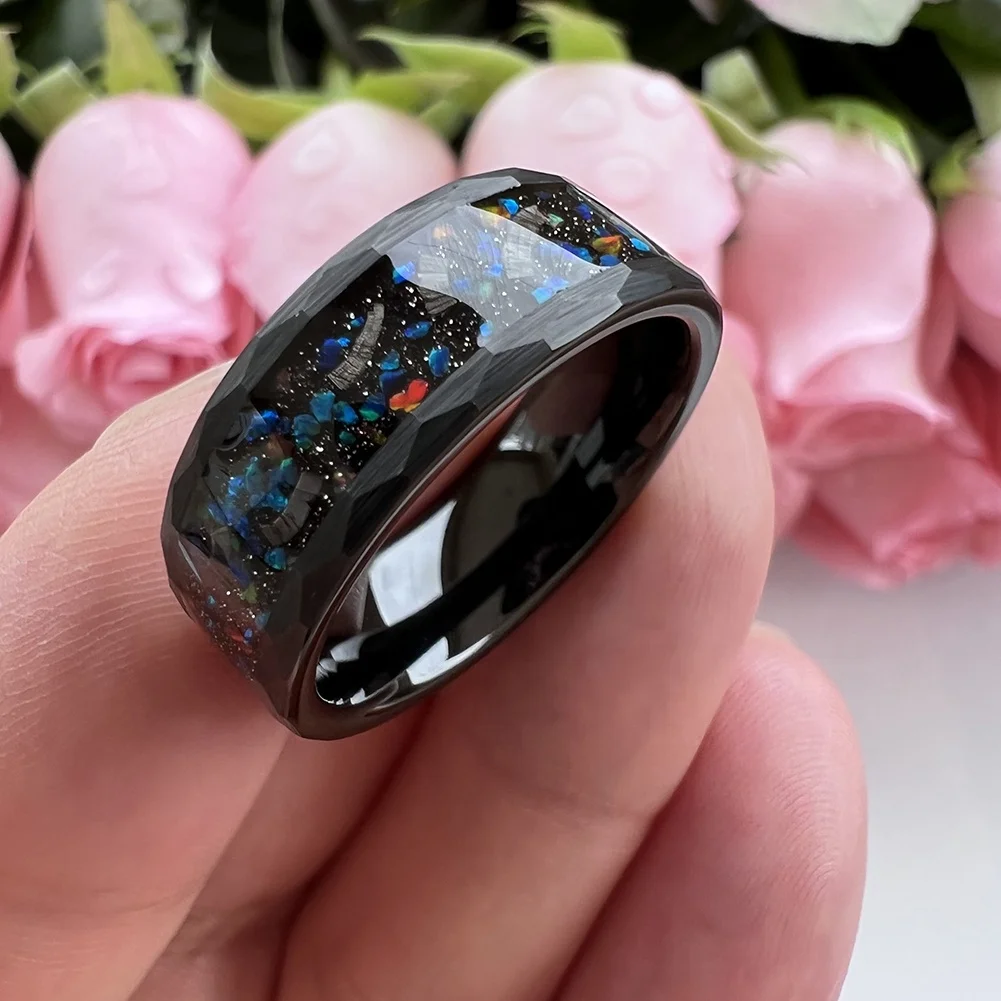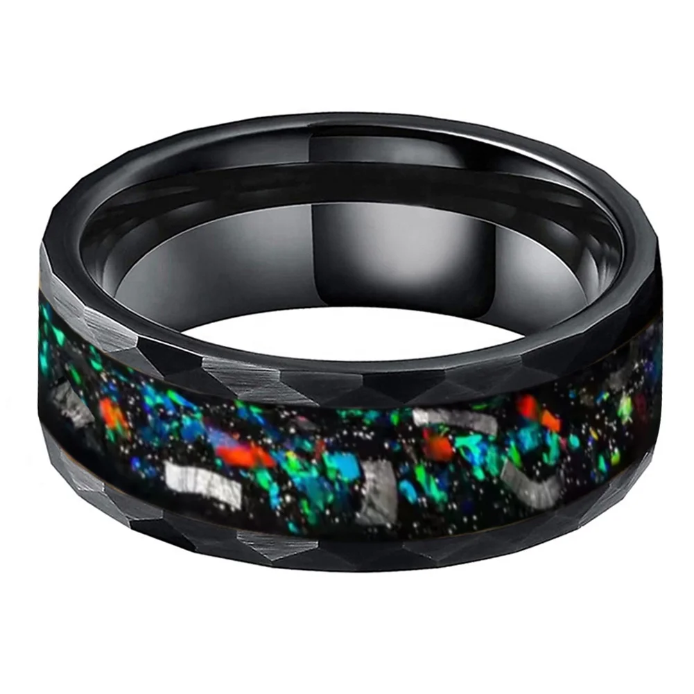Coolstyle Jewelry 8mm Black Hammered Tungsten Ring for Men Women Real Meteorite Galaxy Opal Inlay Engagement Wedding Band