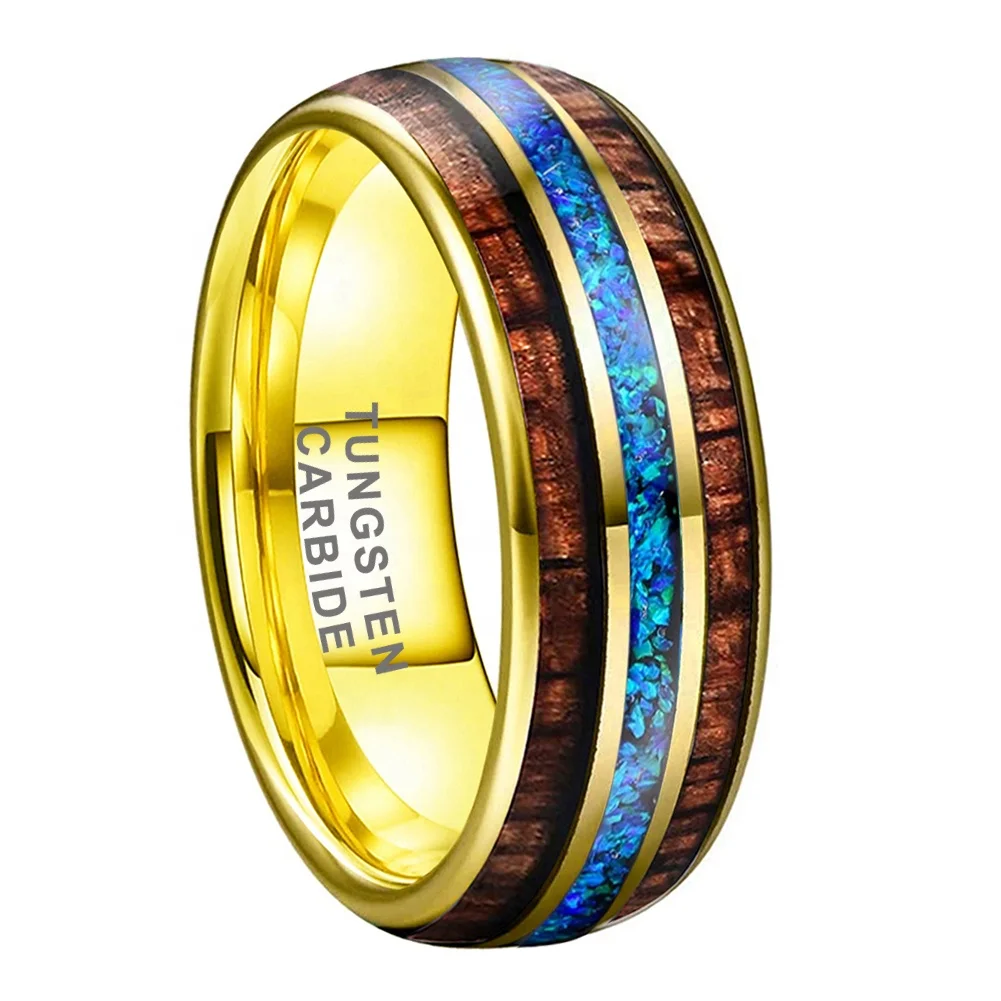Coolstyle Jewelry 8mm Blue Opal Koa Wood Inlay Gold Tungsten Carbide Ring for Men Women Fashion Wedding Band Comfort Fit