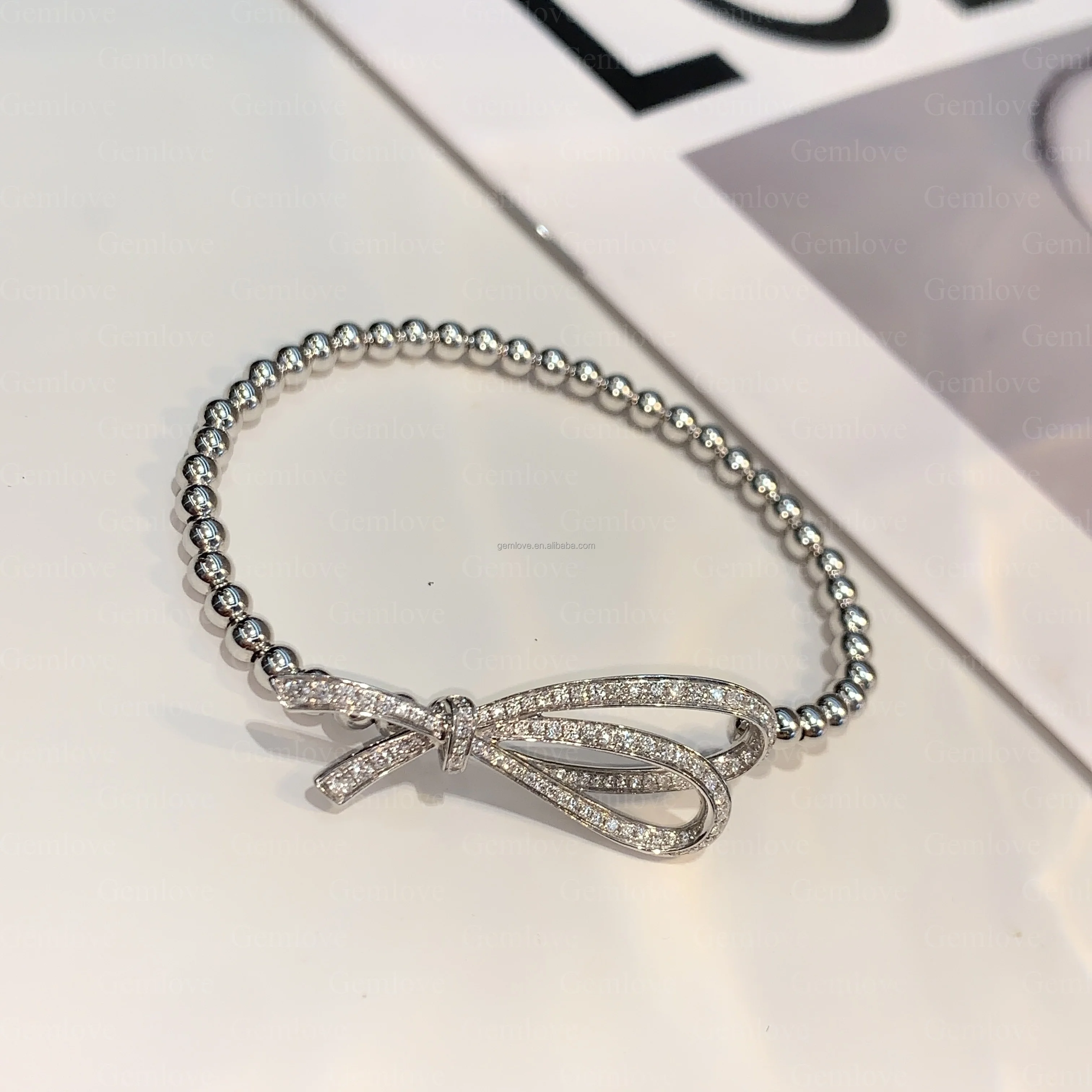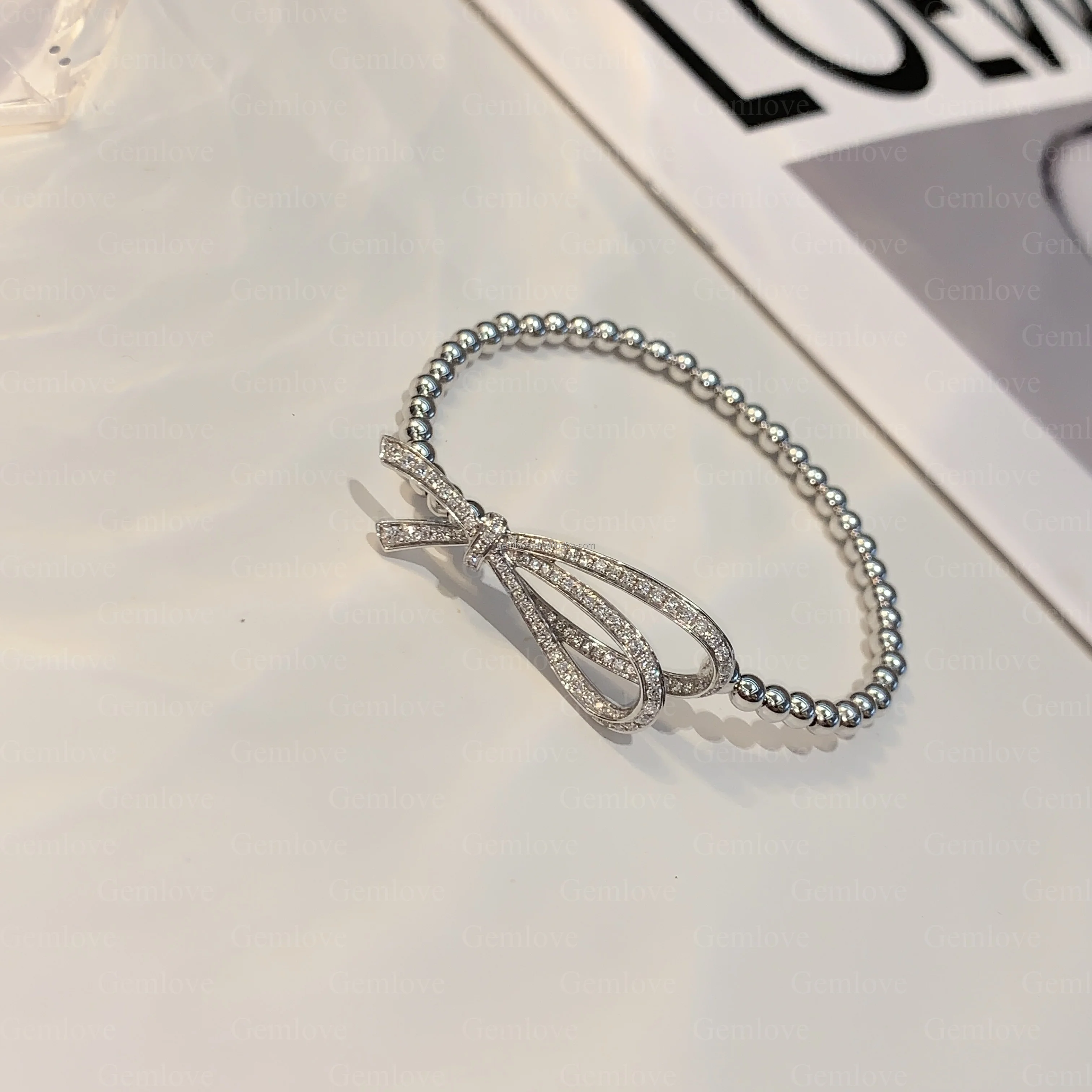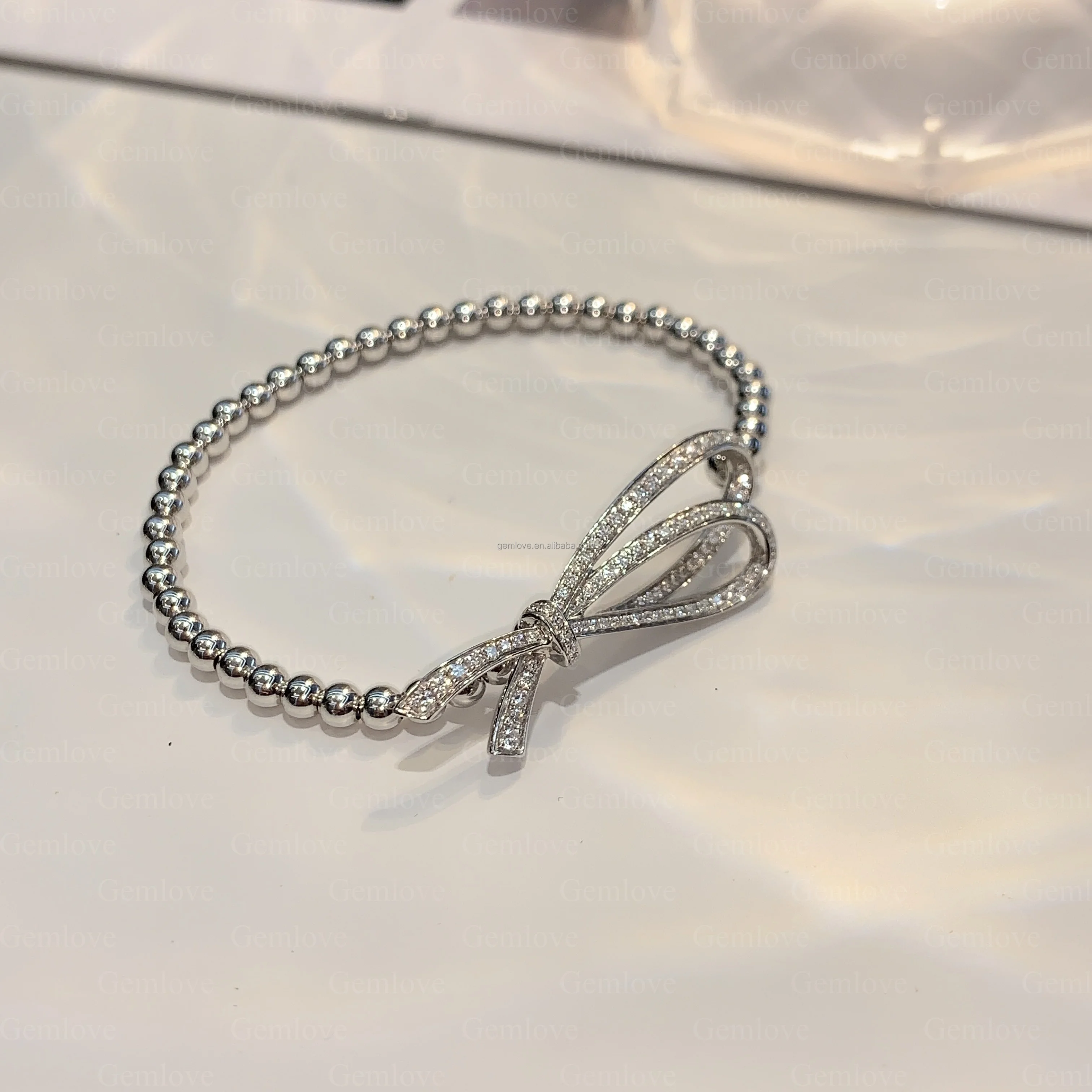 Custom 18K White Gold 9.86g Bow Bracelet - 17cm Shiny Lab-Grown Diamond Adjustable Tennis Chain for Women