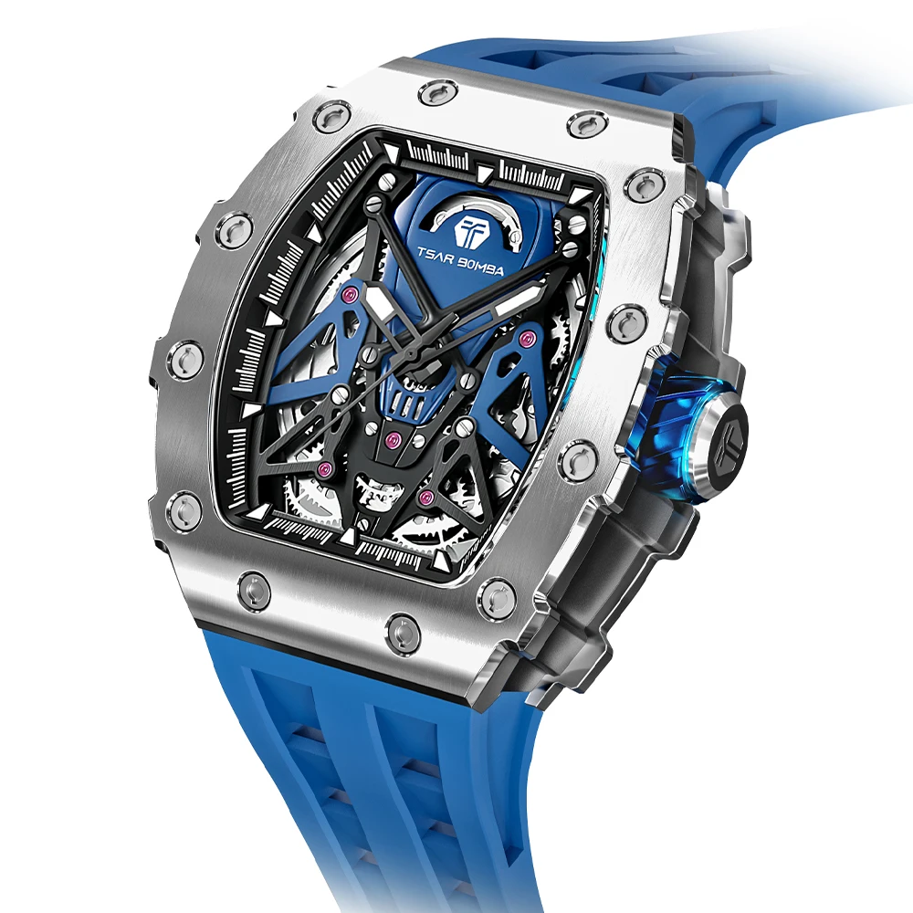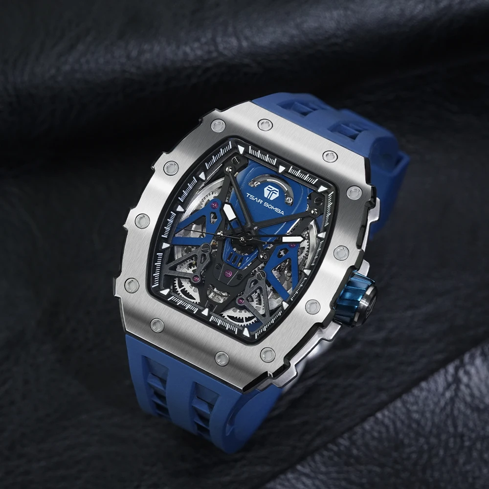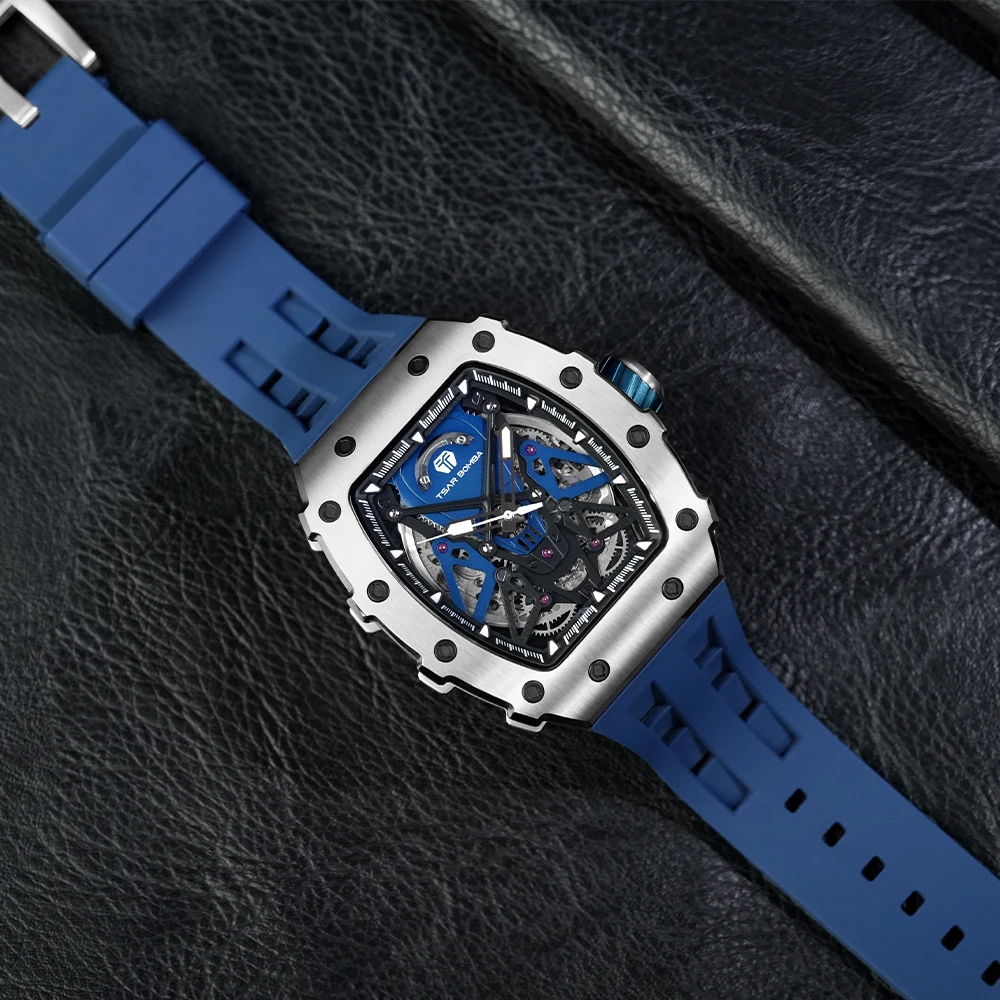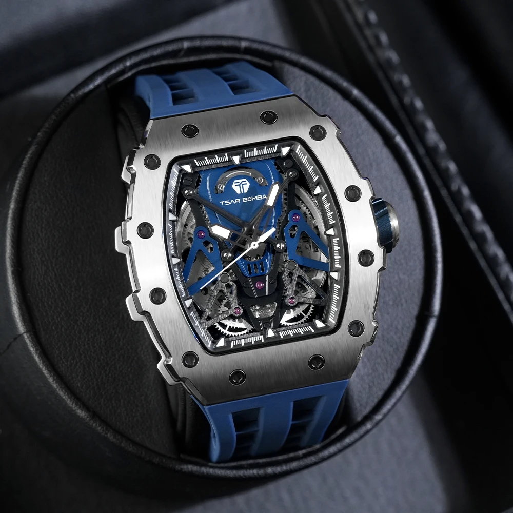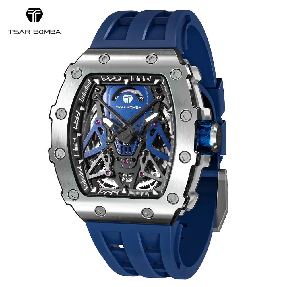 For TSAR BOMBA Skeleton Automatic Wristwatch for Men Water-Resistant Mens Rubber Band Tonneau Case Analog Dial Factory Direct