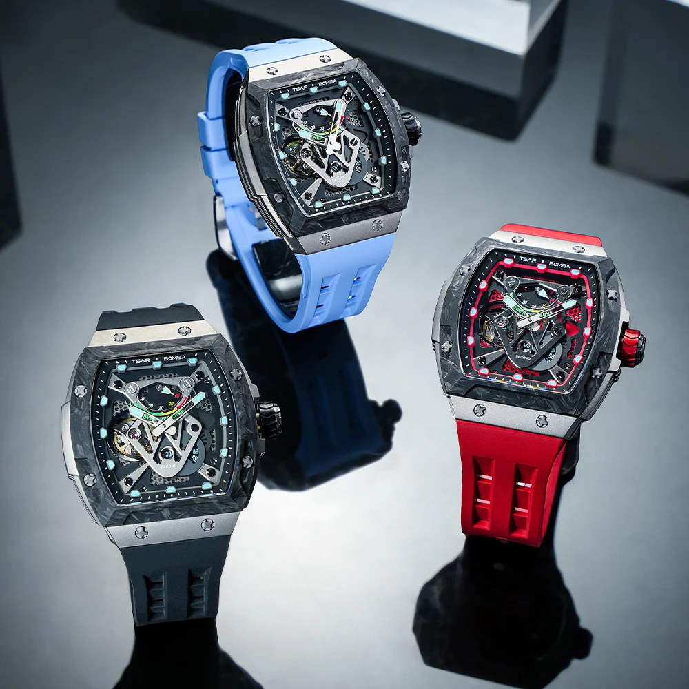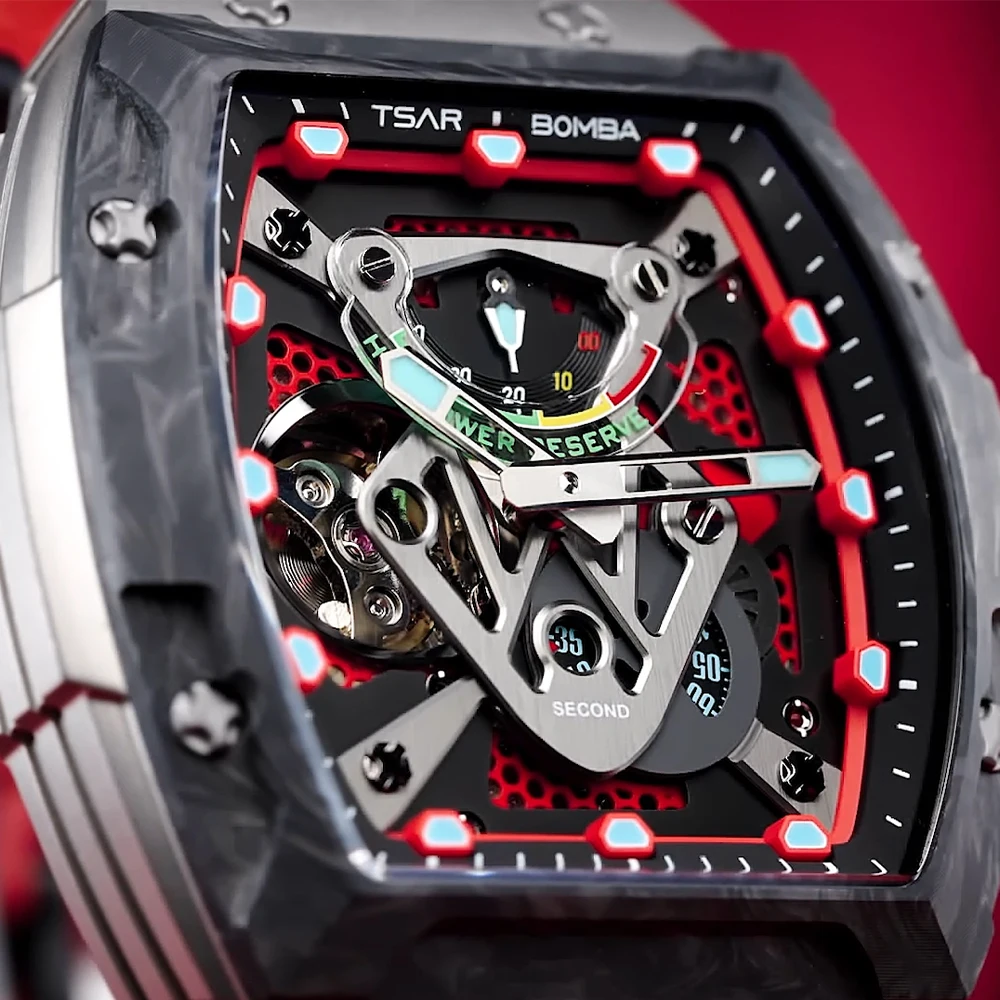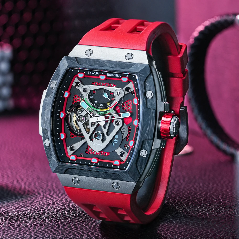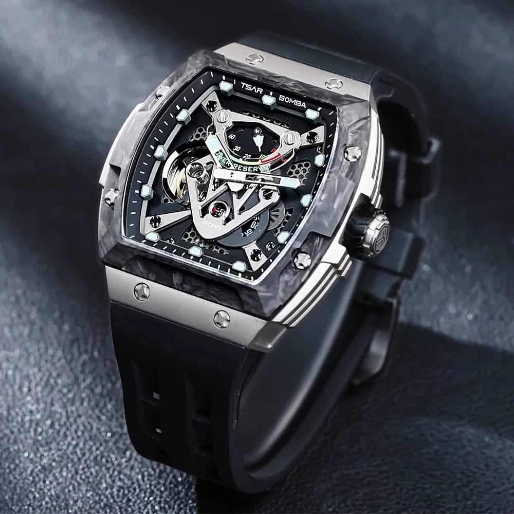 For TSAR BOMBA Titanium Analog Mechanical Watch for Men Tonneau Case Shape and Rubber Band Power Reserve Feature