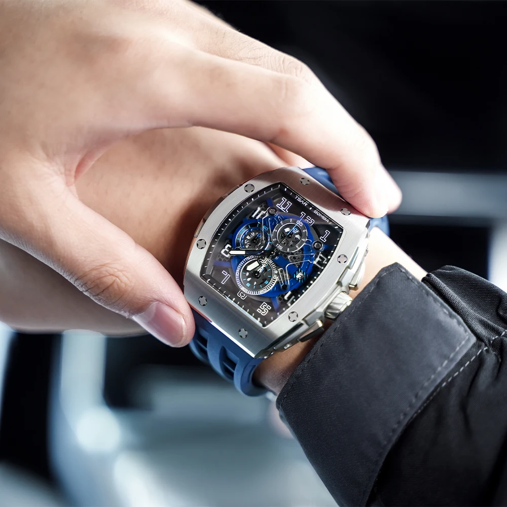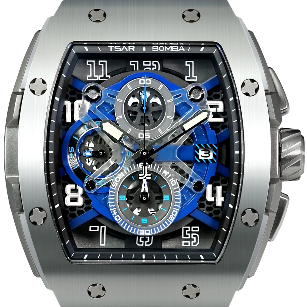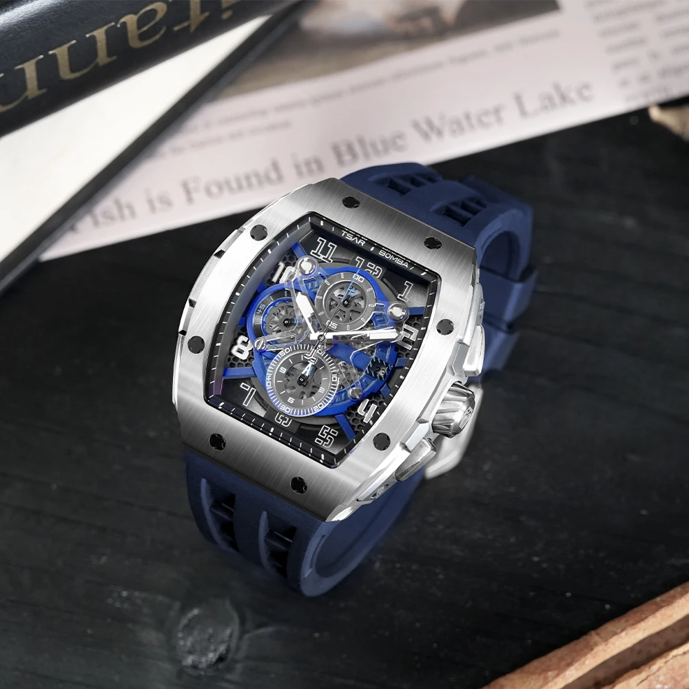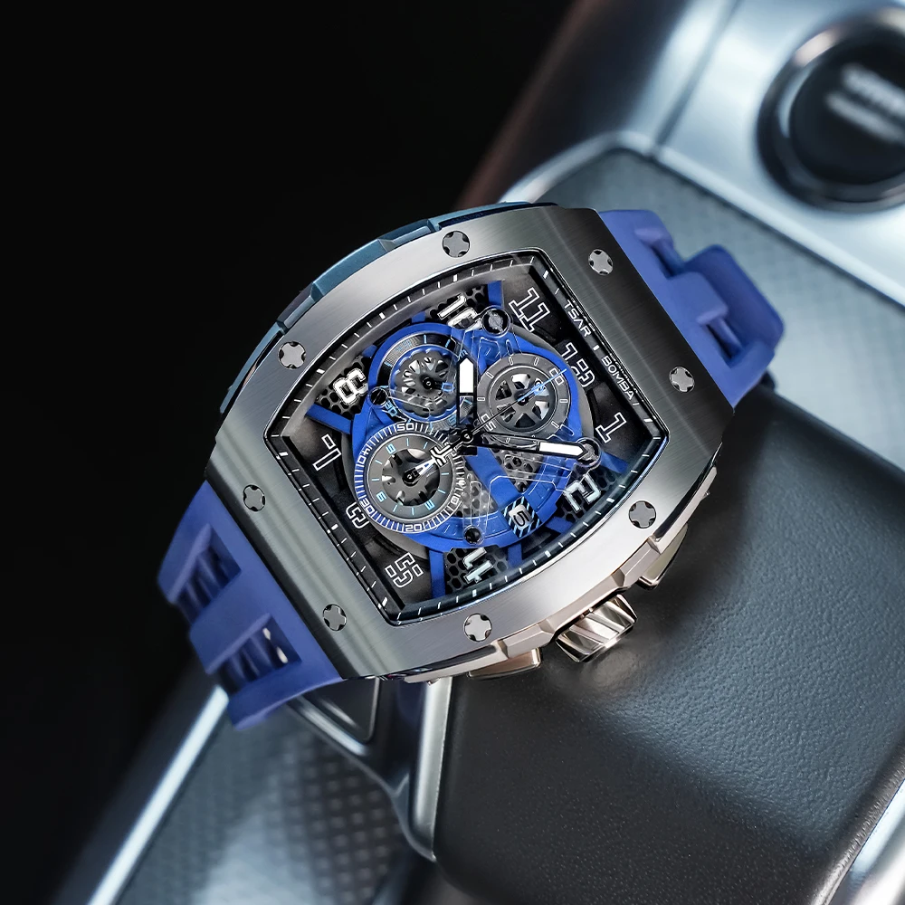TSAR BOMBA TB8211 Luxury Sapphire Men's Watch Japanese Movement Waterproof Rubber Strap Tonneau Style for Fashion or Business