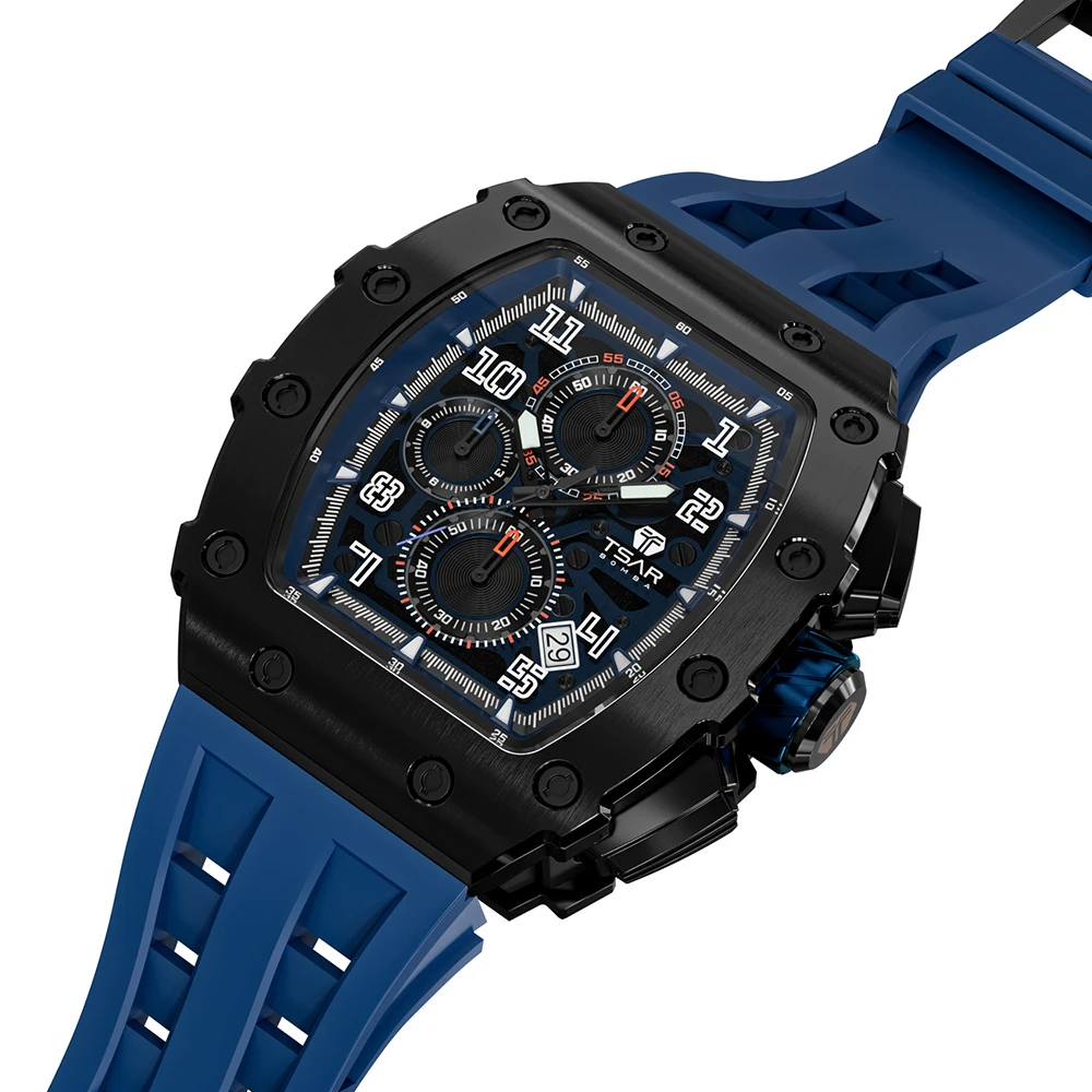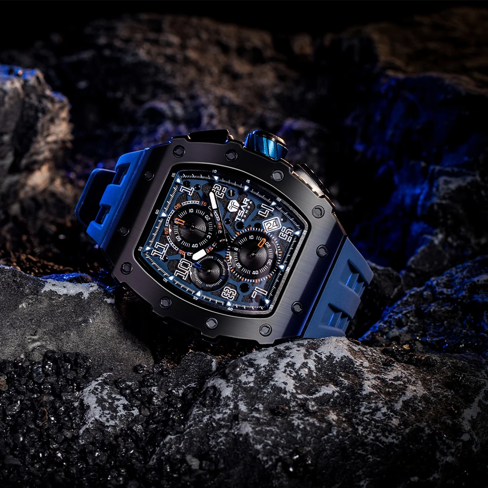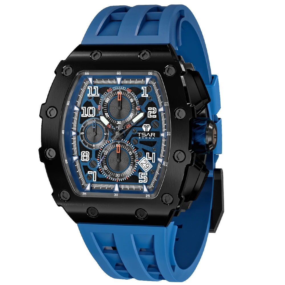 TSAR BOMBA Seiko Stainless Steel Case Mens Quartz Watch Silicone Band 50M Waterproof Chronograph Tonneau Design Fashion Business