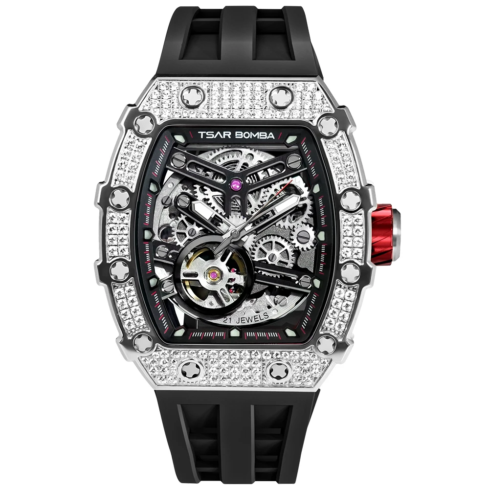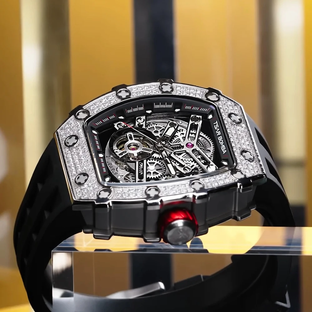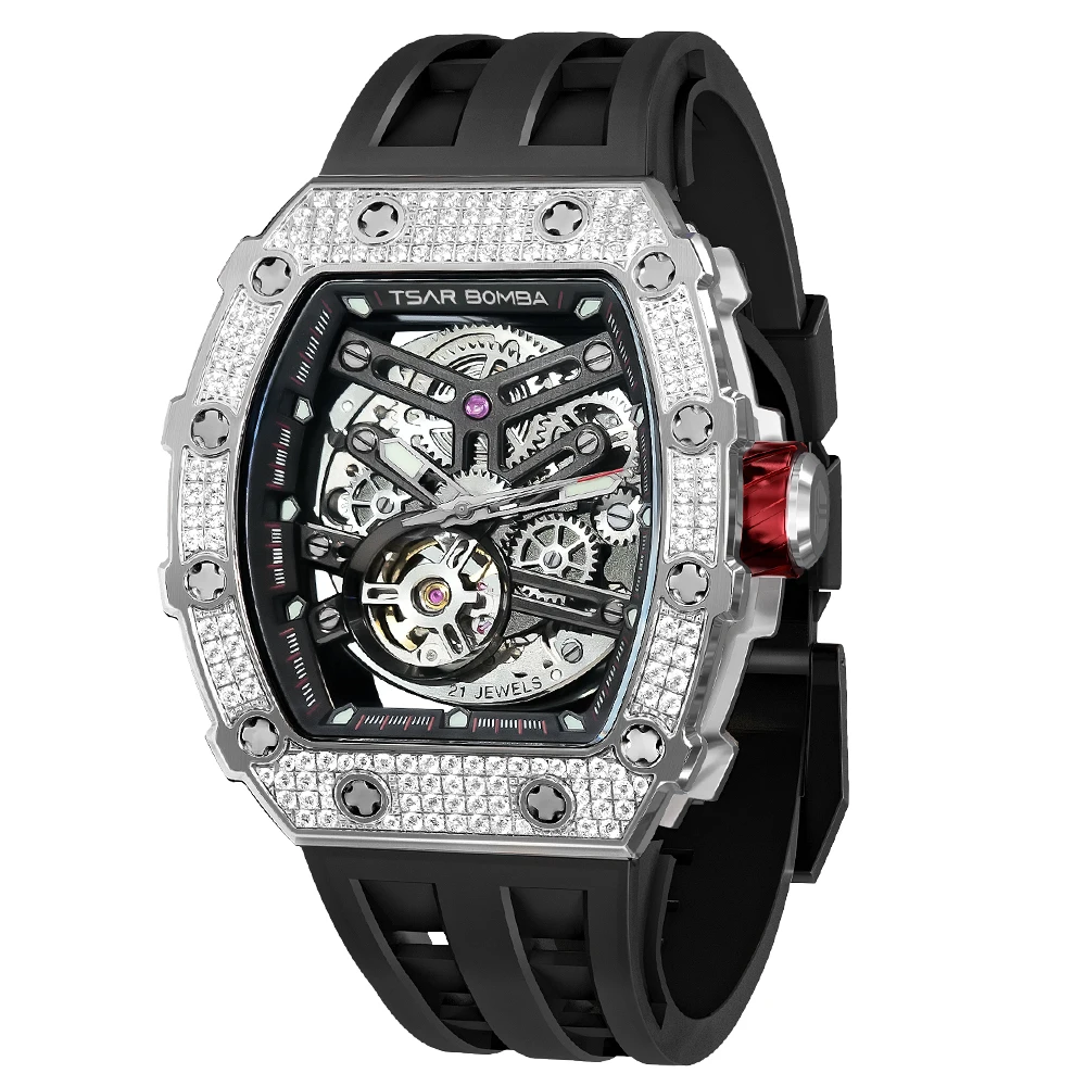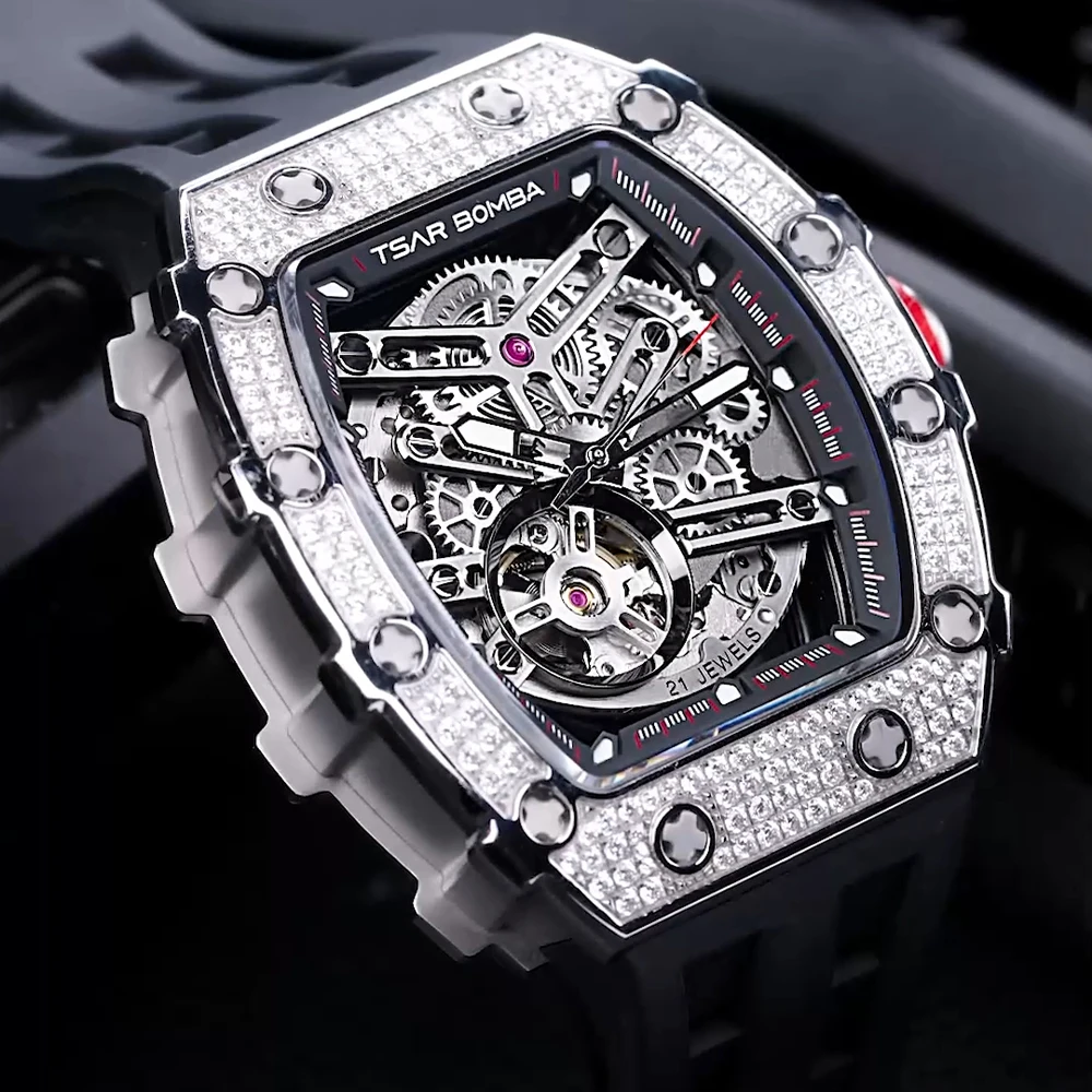 For TSAR BOMBA Men's Diamond Mechanical Watches Tonneau Case Water-Resistant Rubber Band Analog Display