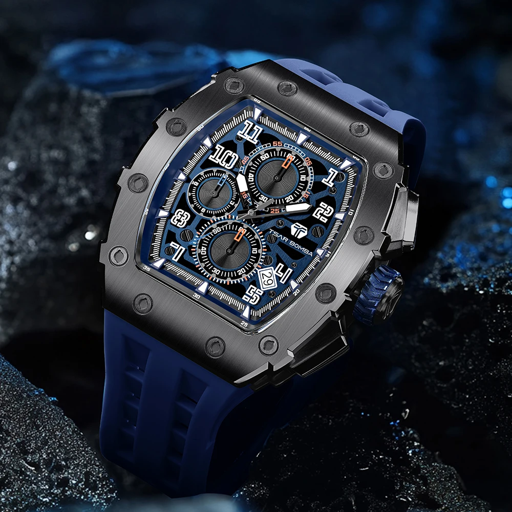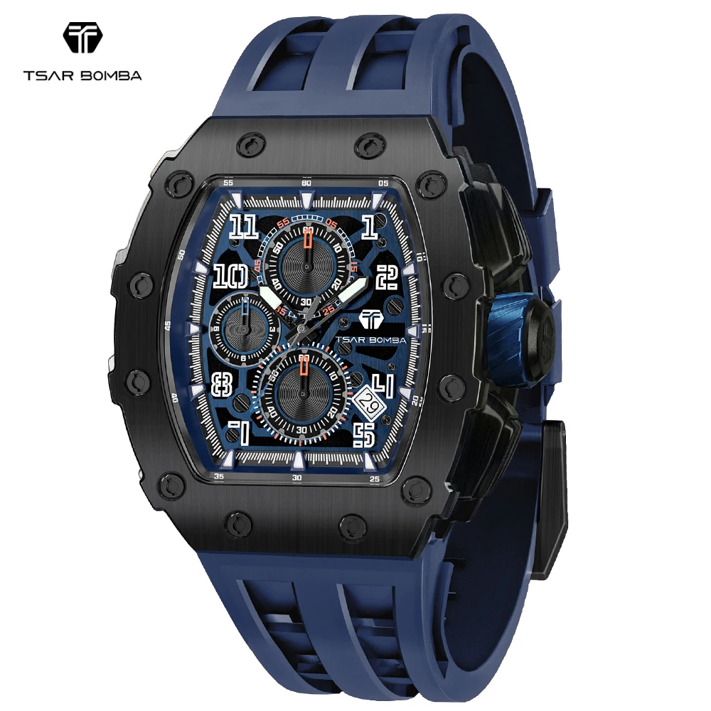 Luxury TSAR BOMBA Men's Quartz Wristwatch with SEIKO Movement Fashionable Silicone Band and Tonneau Case for Sport and Business