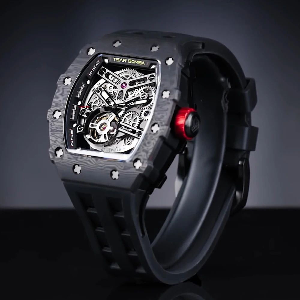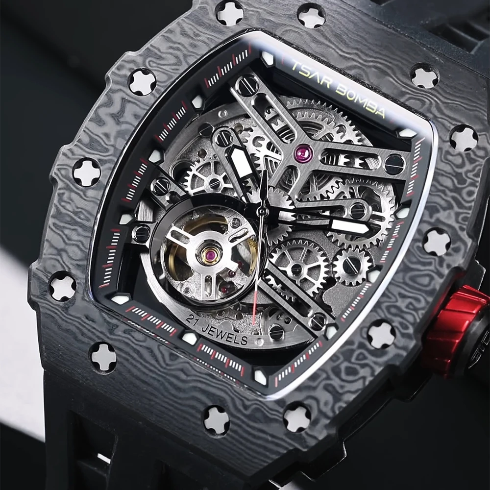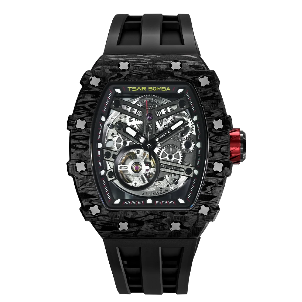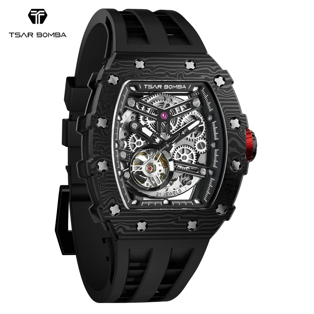 TSAR BOMBA Skeleton Carbon Fiber Mechanical Mens Automatic Watches