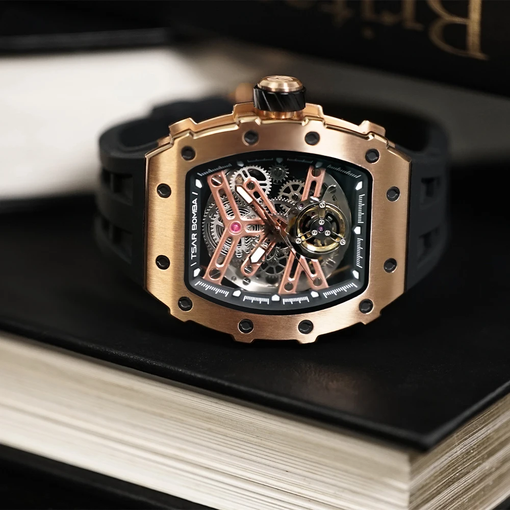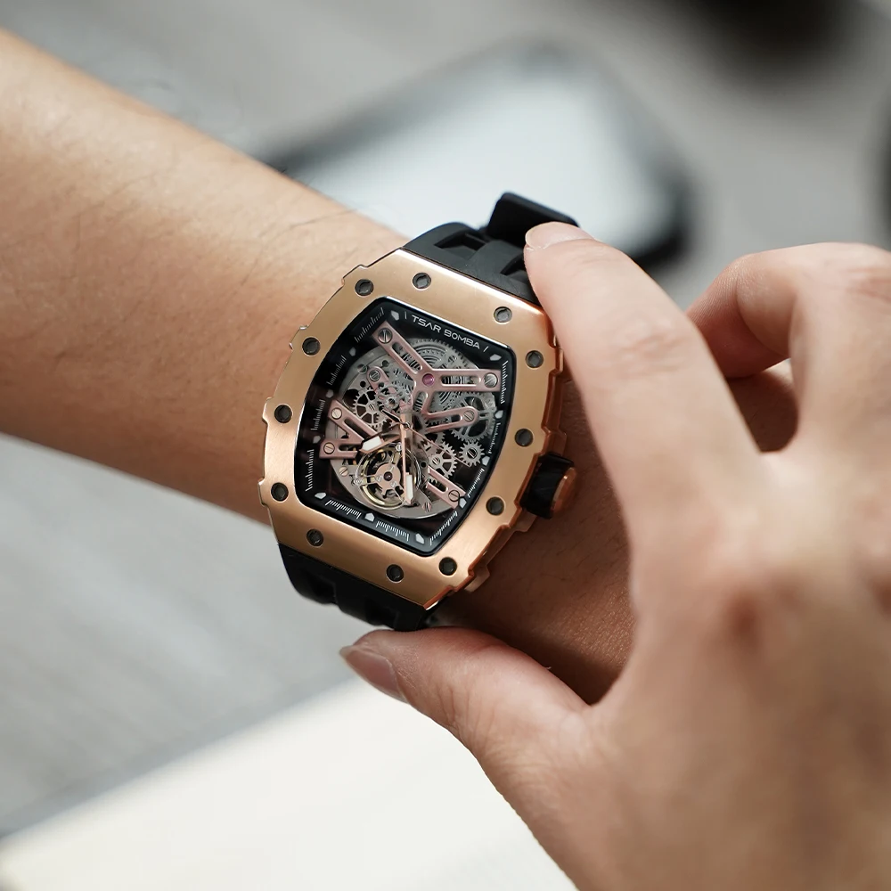 For TSAR BOMBA Luxury Men's Automatic Rectangle Clock Sapphire Tonneau Wristwatch Fashion Skeleton Mechanical Watches Miyota