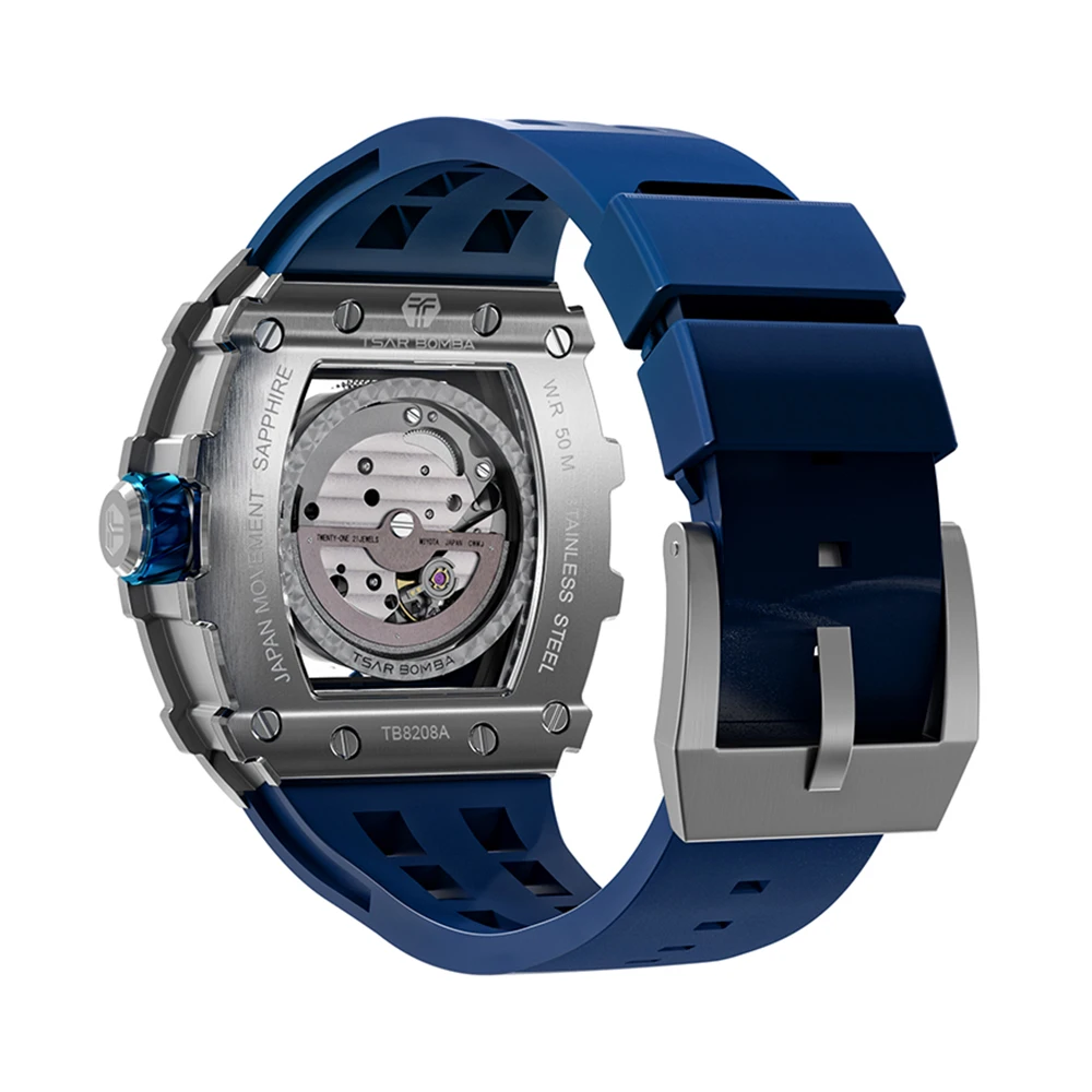 Luxury Miyota Automatic Mechanical Stainless Steel Watch for Men Waterproof Tonneau Case Analog Dial Display Silicone Band