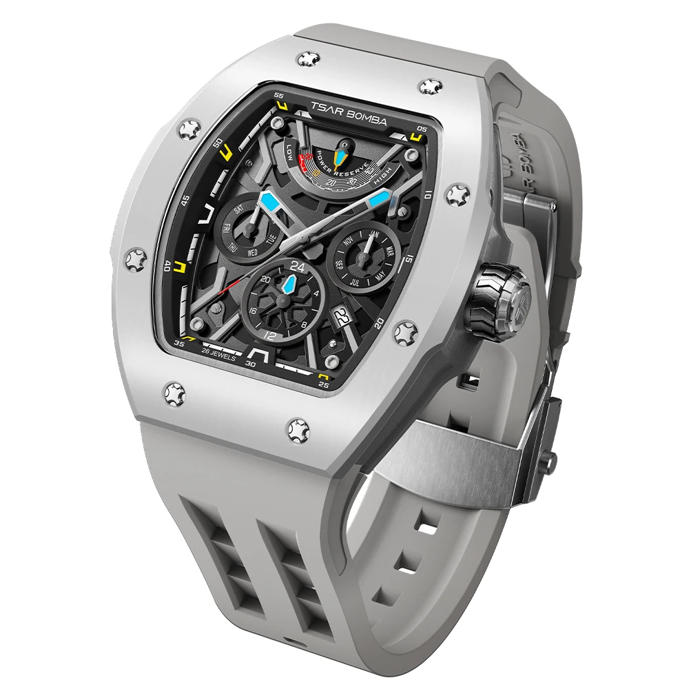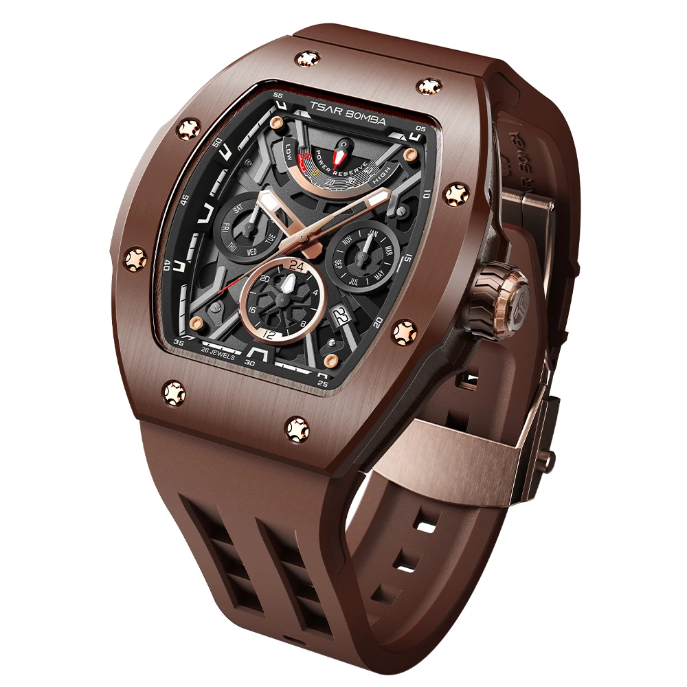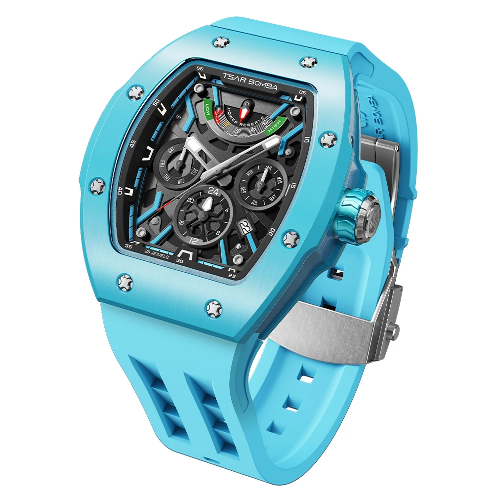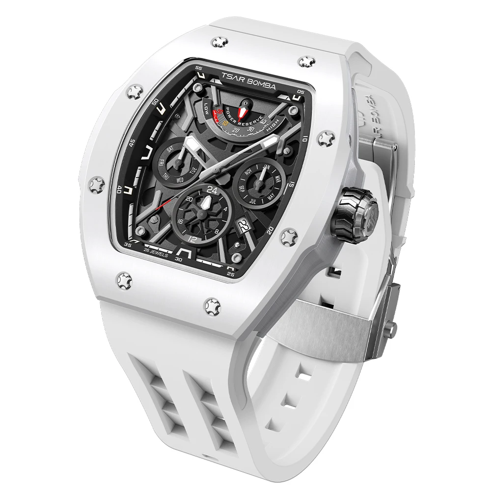 For Ceramic Tonneau Men's Watch Miyota Automatic Rubber Band Water Resistant Power Reserve Analog