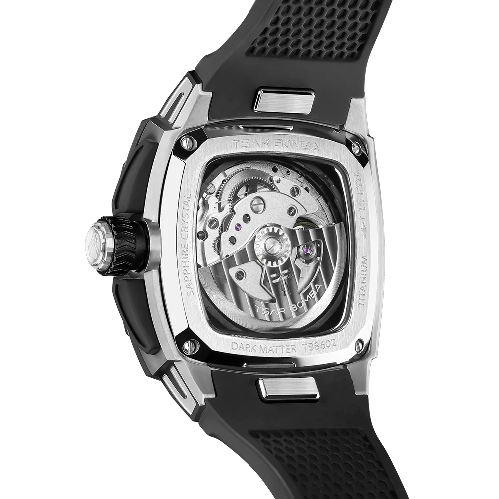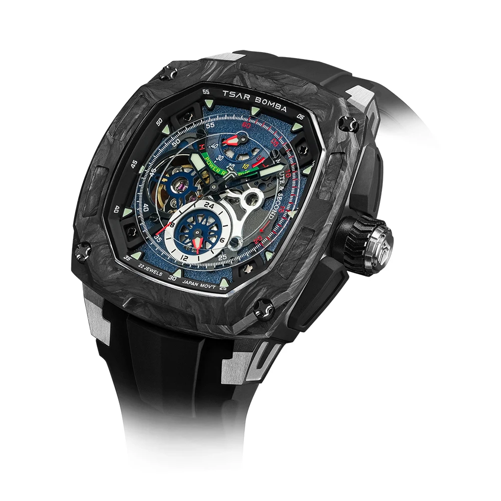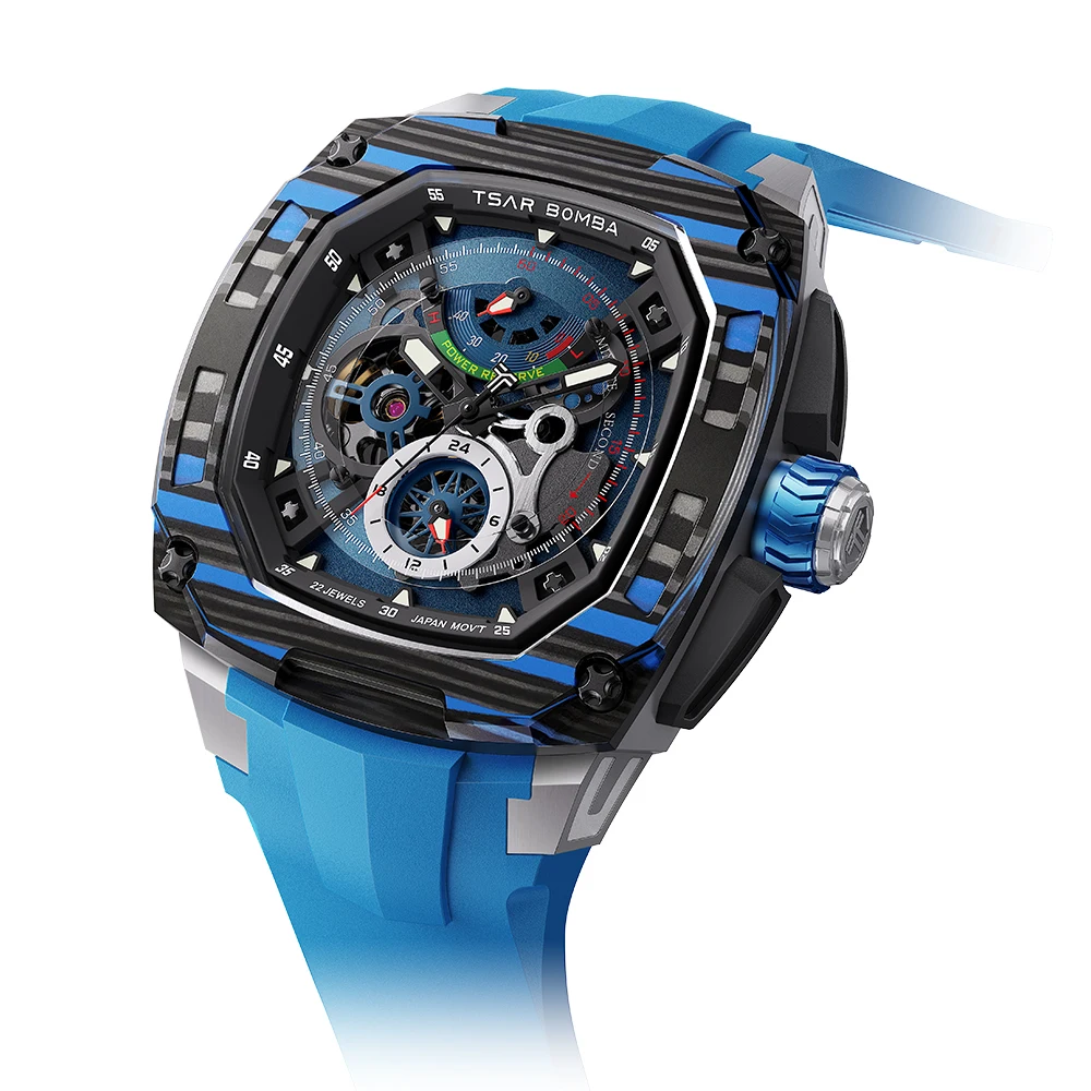 For Luxury Water Resistant Analog Mechanical Square Carbon Fiber Watch for Men with Power Reserve and Rubber Band
