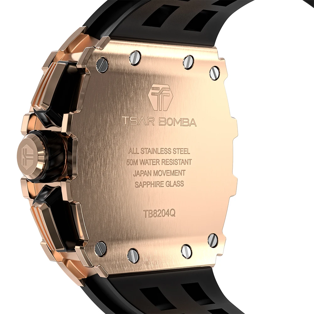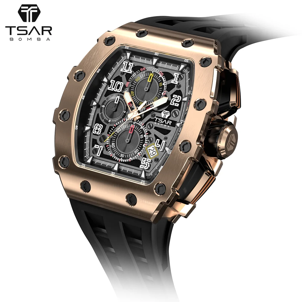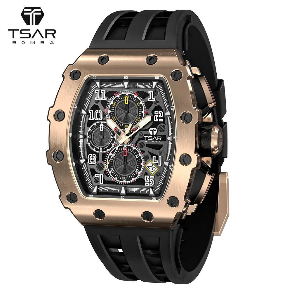 Luxury Men's Quartz Tonneau Seiko Chronograph Sapphire Crystal Dial Water Resistant Sports Fashion Business Silicone Band