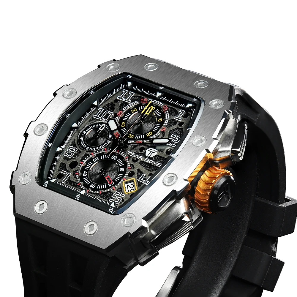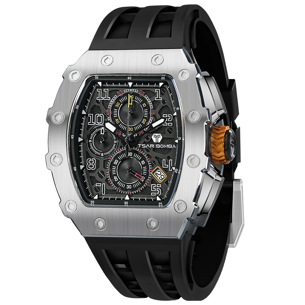 TASR BOMBA Men's Sapphire Analog Chronograph Quartz Watch 50 Meter Waterproof Seiko Movement Tonneau Case Silicone Fashion