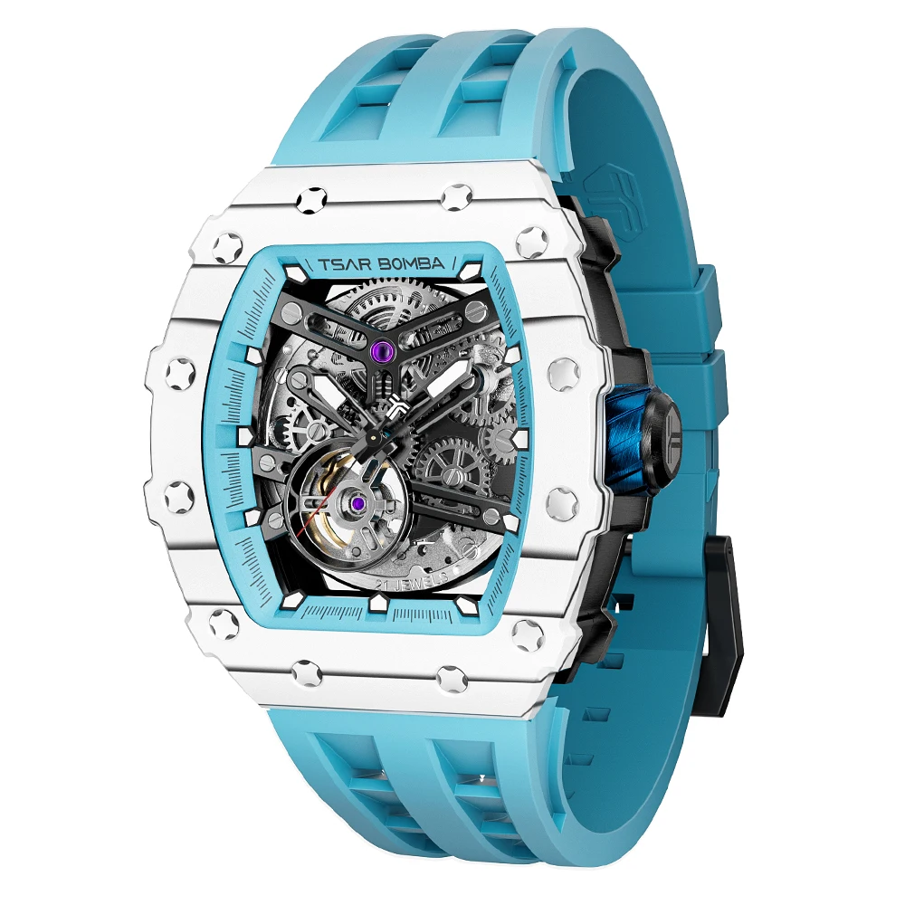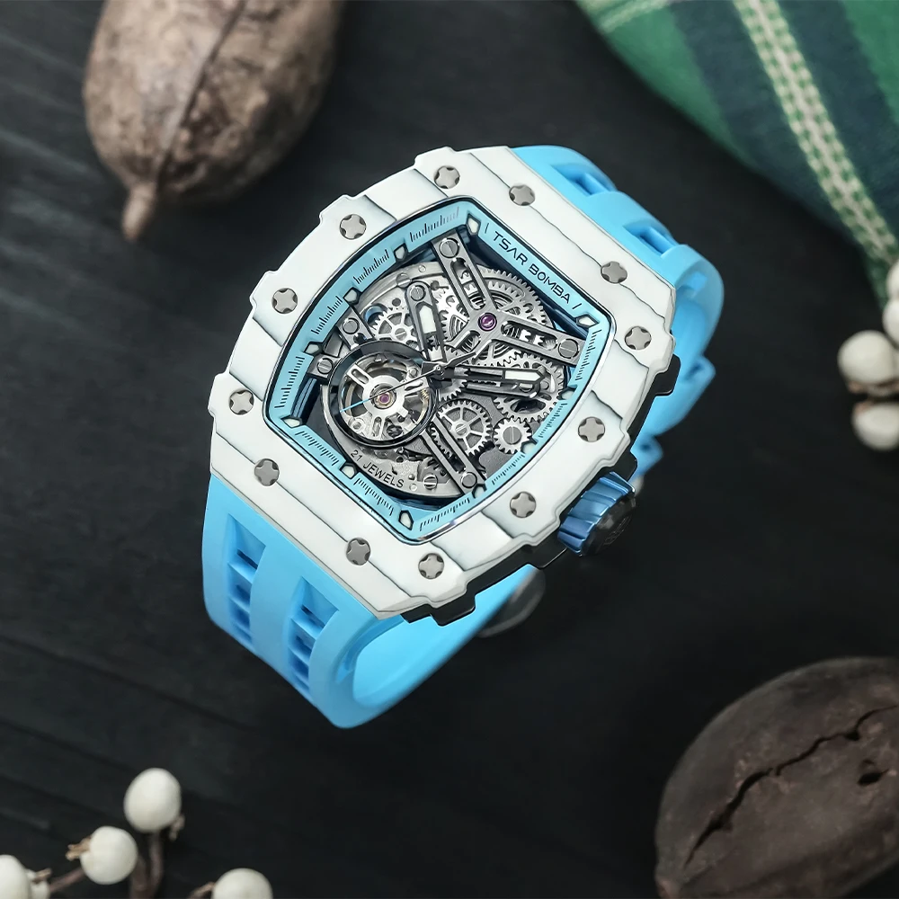 Men's Hollow Skeleton Charm Wrist Automatic Mechanical Watches Limited Edition Rubber Strap Tonneau Case Miyota Water Resistant