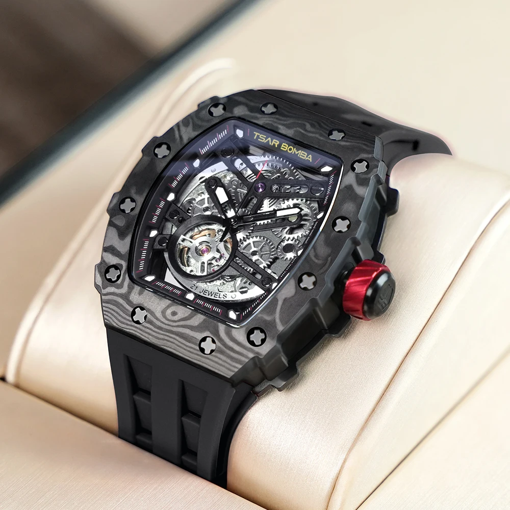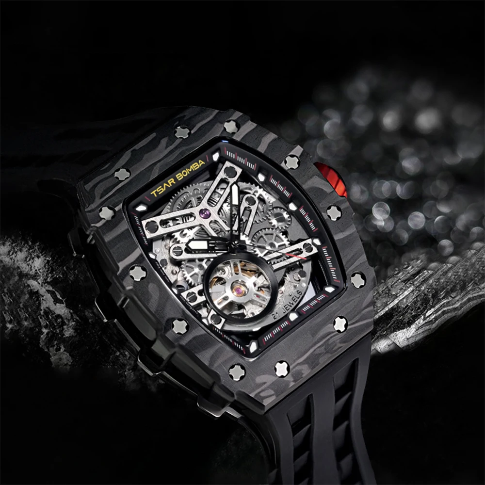 For Tonneau Carbon Fiber Skeleton Mens Mechanical Automatic Watch MiYOTA Movement Rubber Band Water Resistant Analog Dial