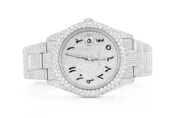 Premium Iced VVS Clarity Moissanite Studded Diamond Stainless Steel Mechanical Movement Watch Arabic Dial Full White High Cheap