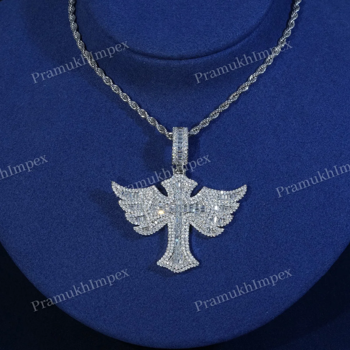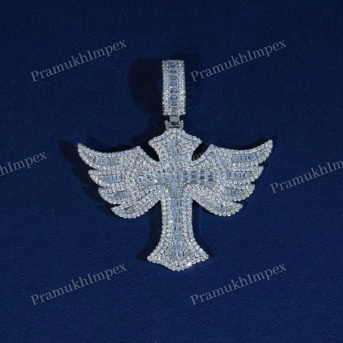 Iced Angel Cross Pendant Sterling Silver White Gold Plated Moissanite Charm Baguette Pave Wings Necklace Hip Hop Jewelry Unisex