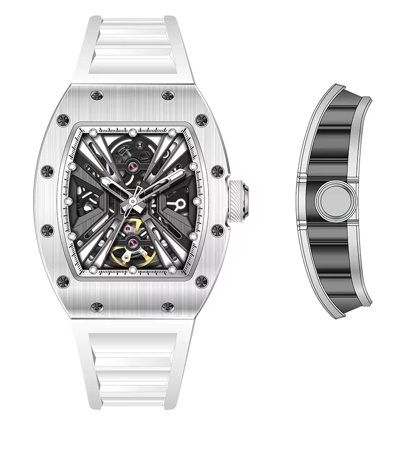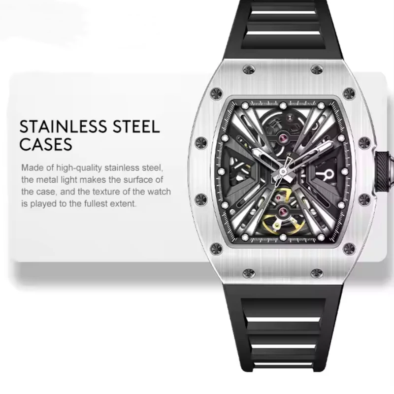 OEM Luxury Fashion Hollow Automatic Mechanical Men's Watch Rubber Strap Waterproof Wine Barrel Automatic Mechanical Watches