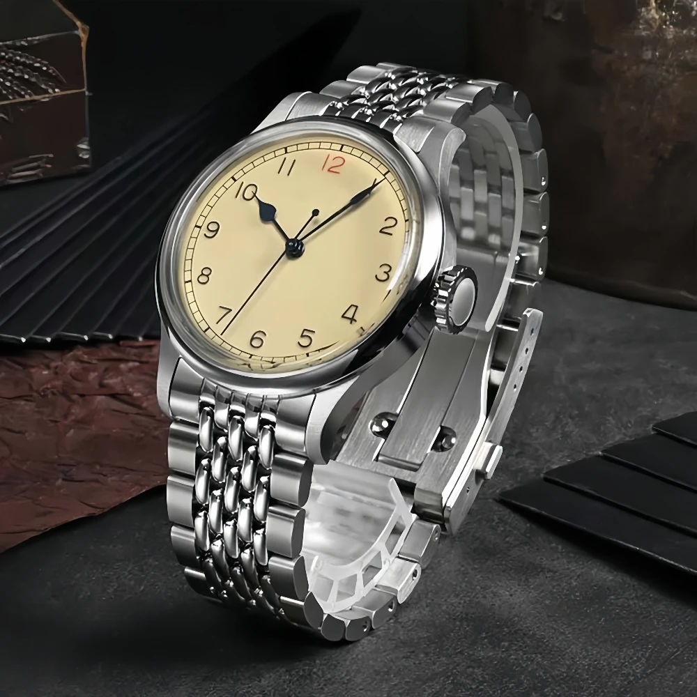 OEM Custom Logo Vintage Pilot Men Watches NH35 Simple Light Yellow Stainless Steel Automatic Mechanical Dress Wristwatch