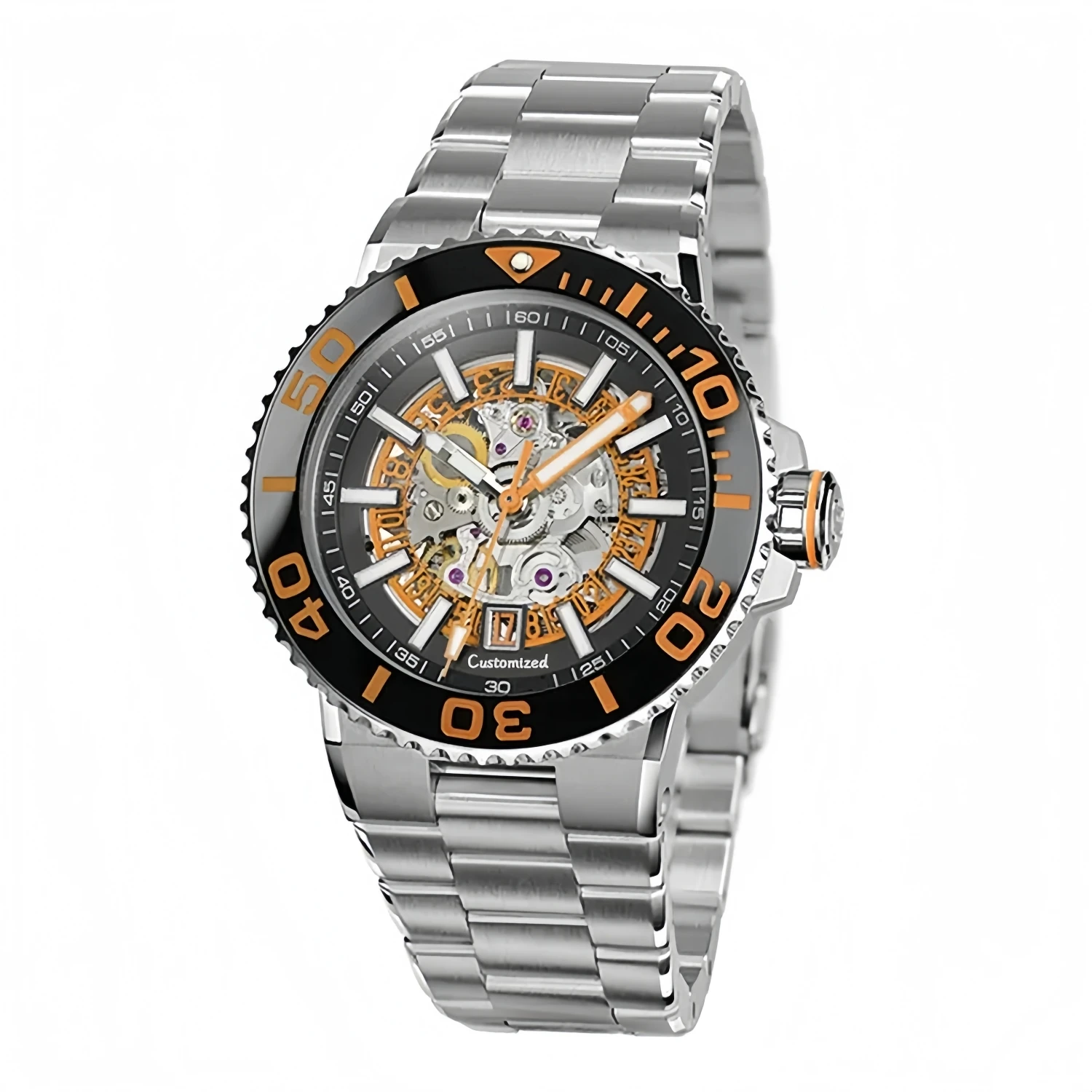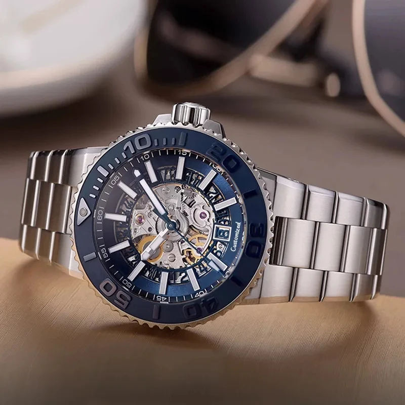 Factory Customized 43mm Luxury Men's Luminous Diving Watch Stainless Steel Skeleton Automatic Mechanical Watches