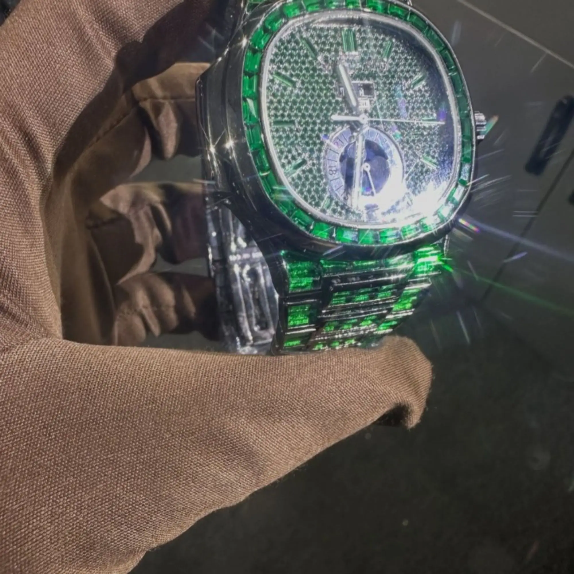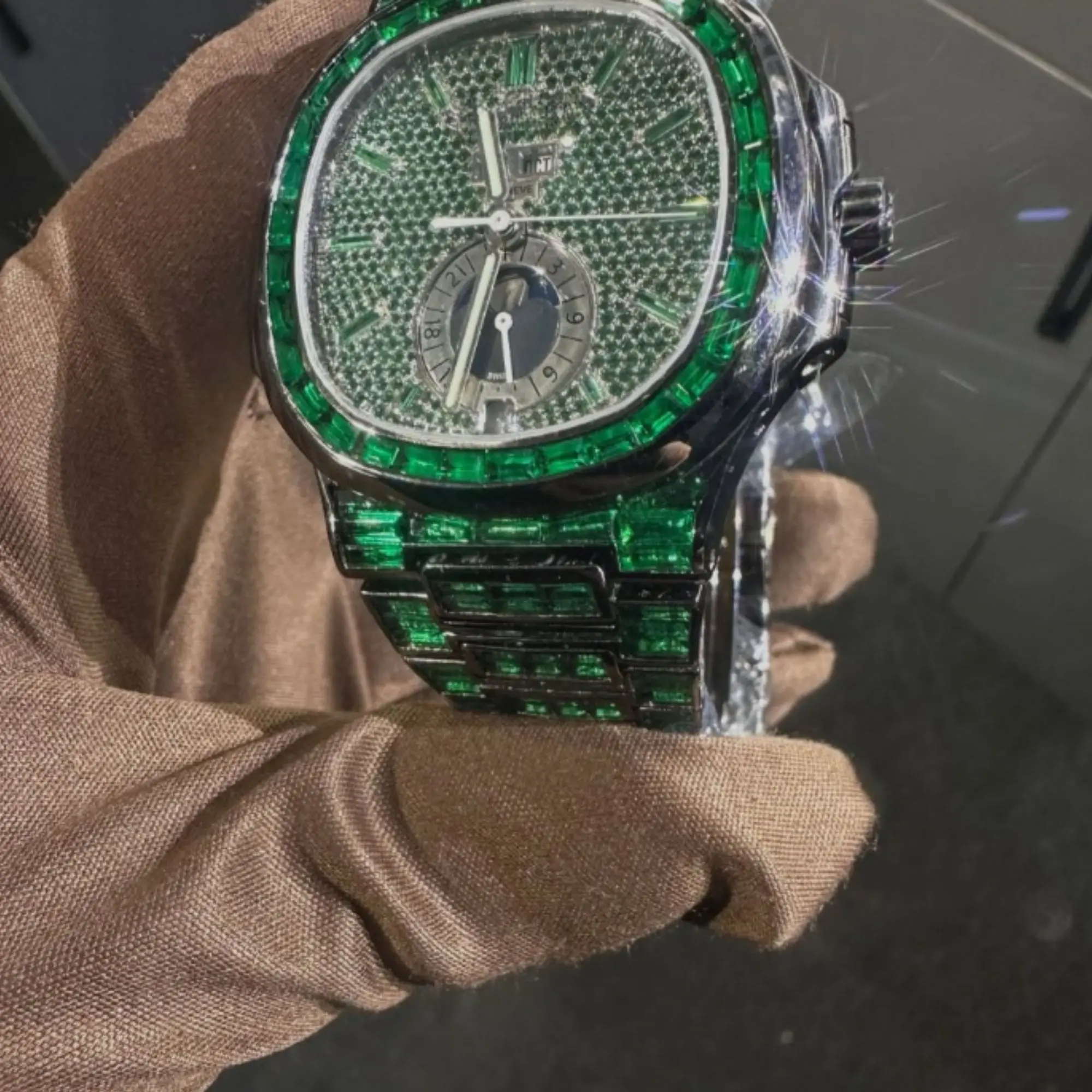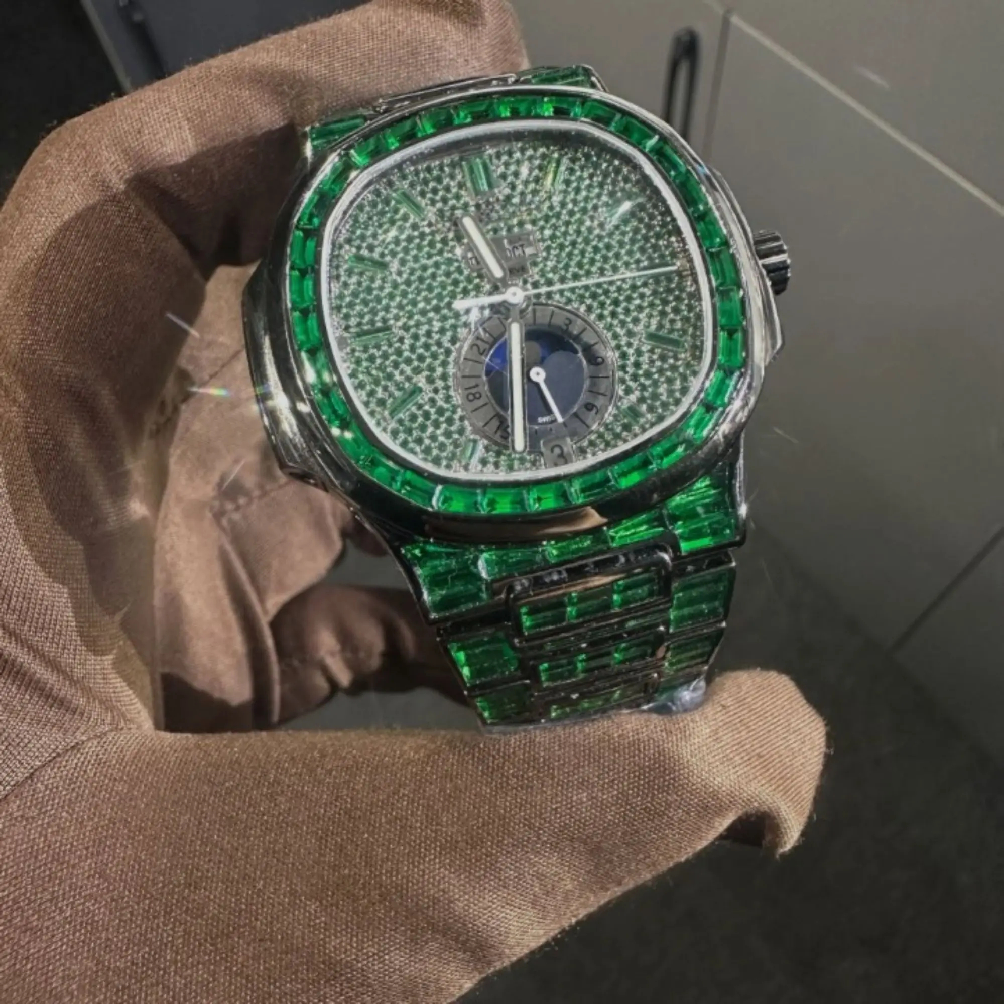 Wholesale Luxury Square Quartz Case Moissanite Chronograph Watches | VVS Iced Diamond Watch Passes Diamond Tester | Green