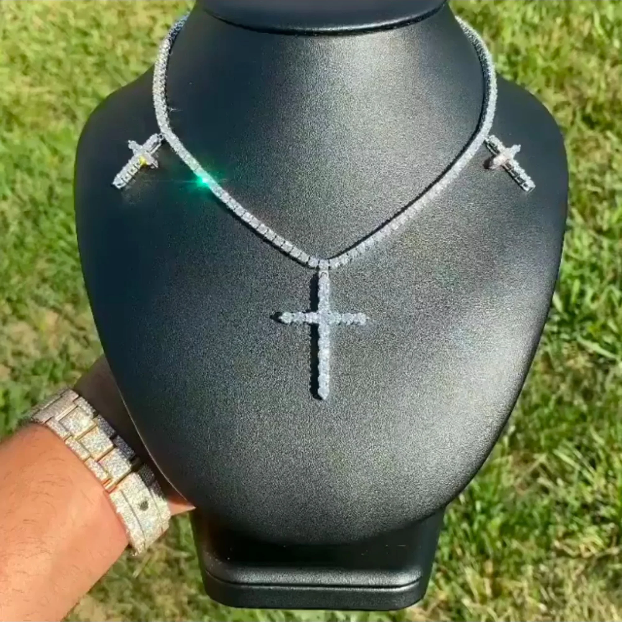 Top Quality Round Cut Moissanite Chain Gold Plated 925 Sterling Silver Chain 4mm Tennis Chain With Cross Pendant Iced Out