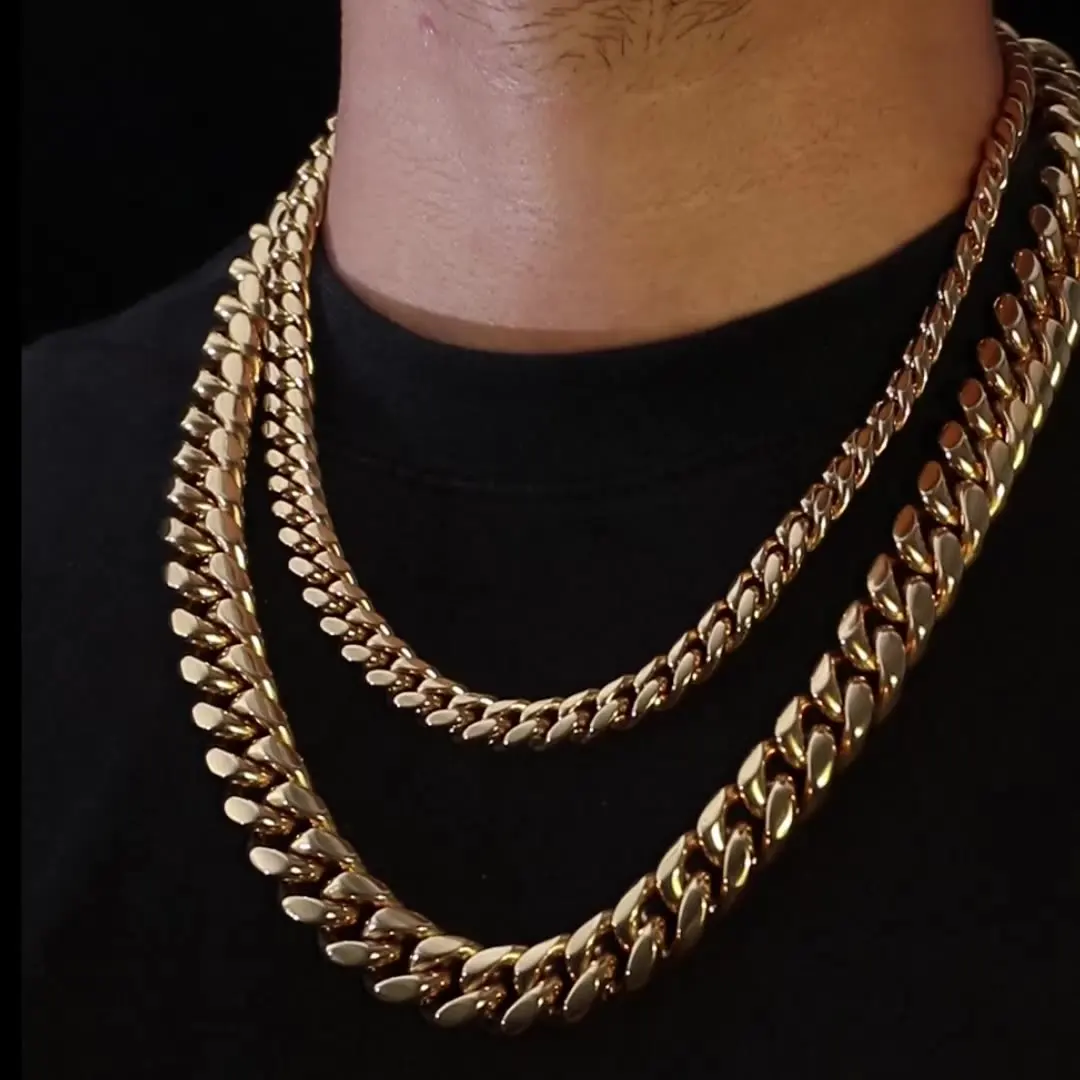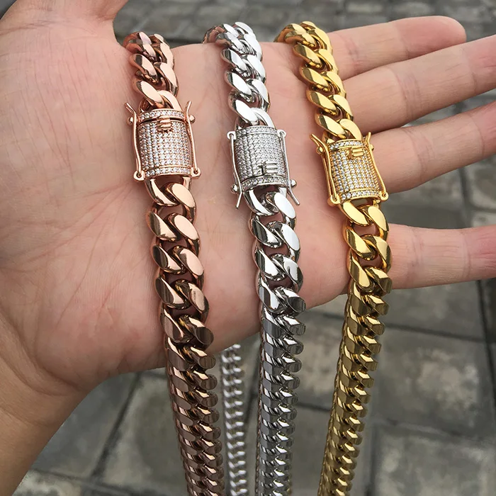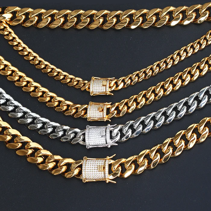Hip Hop Jewelry 14k 18k Gold Plated Zirconia Button 8mm 10mm Stainless Steel Bracelet Cuban Link Chain Necklace