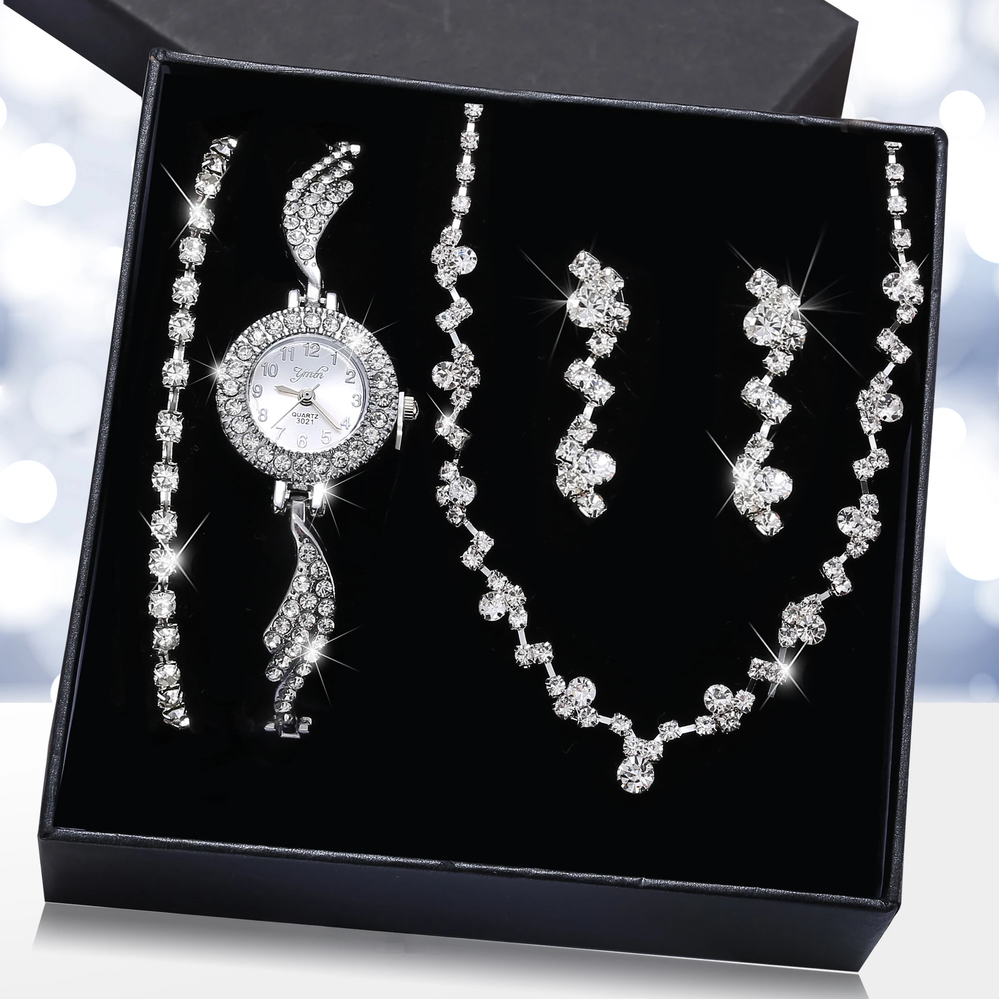 Luxury Vintage 5-Piece Set Full Crystal Diamond Necklace Earrings and Watch for Women Gold Plated Zircon Jewelry Gift