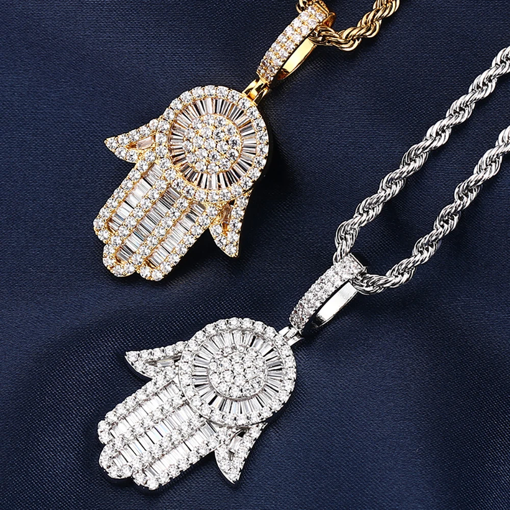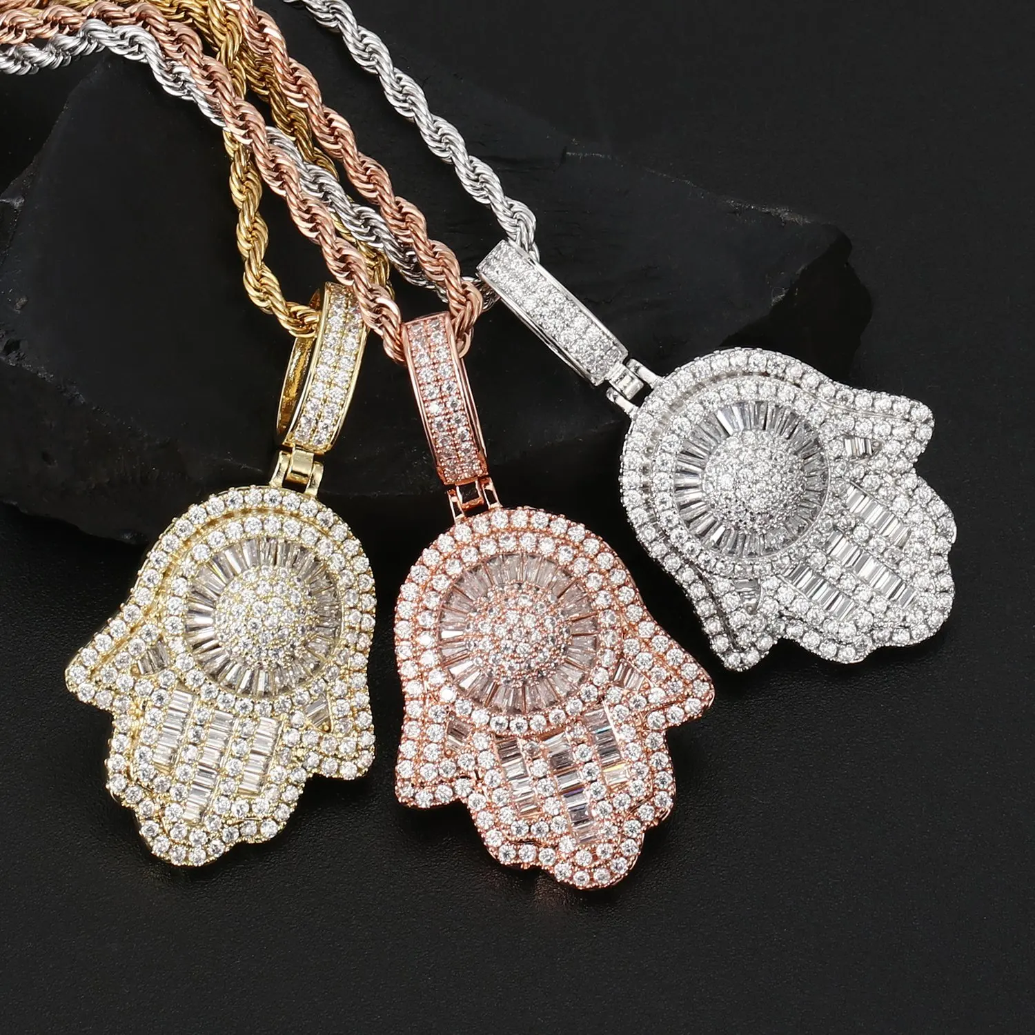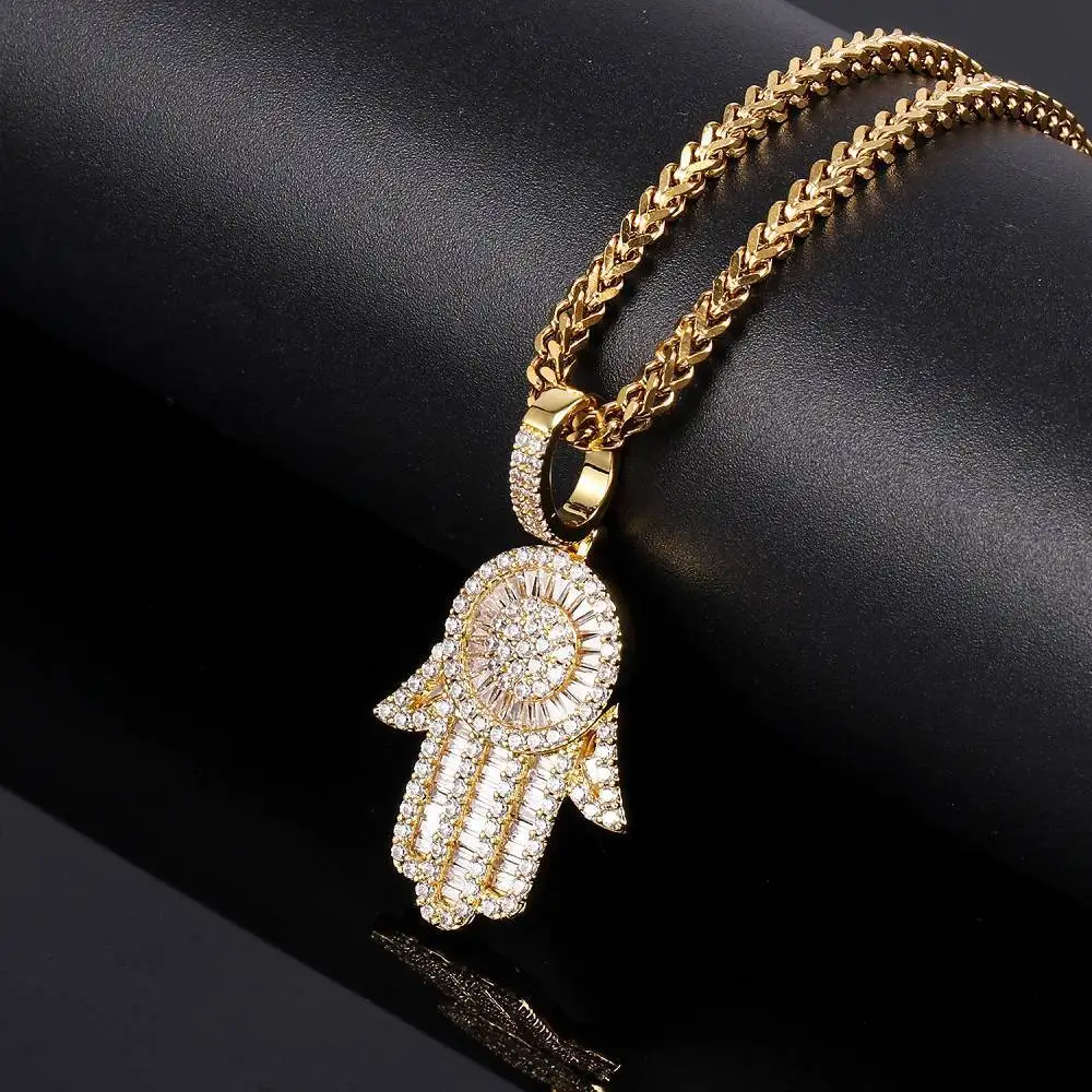 Fashion Hip Hop Style Iced Out Zircon 18K Gold Plated Fatima Eye Hamsa Hand Pendant Necklace Brass for Men