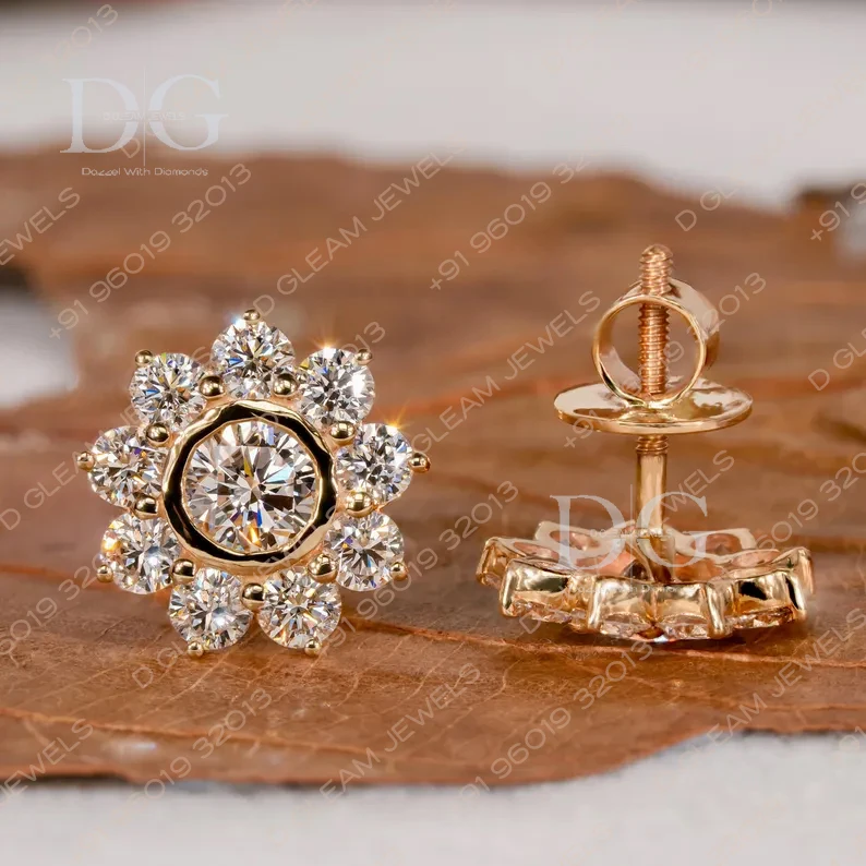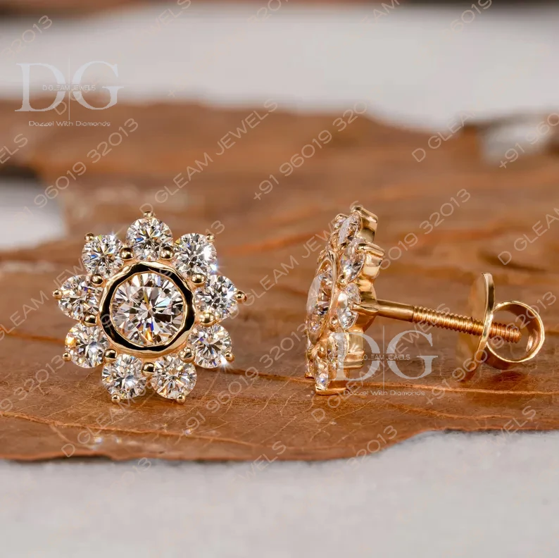 2.15CW Bezel Set Gold Jewelry Lab Diamond Stud Earrings Floral Wedding & Anniversary Halo Cluster Diamond Studs